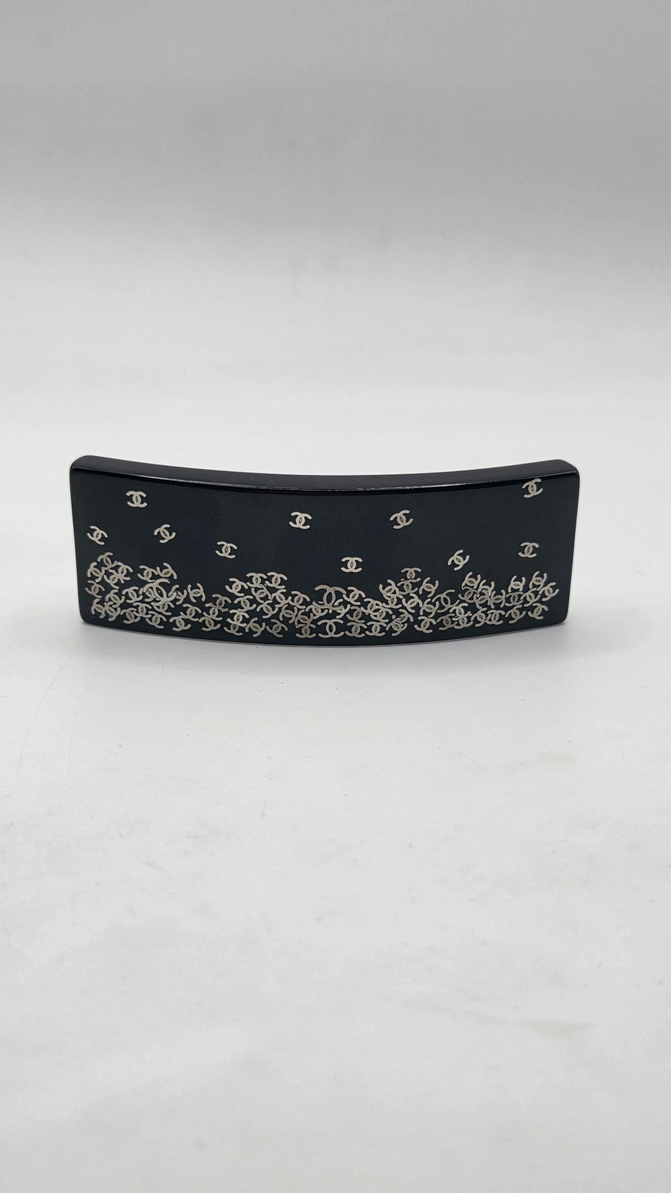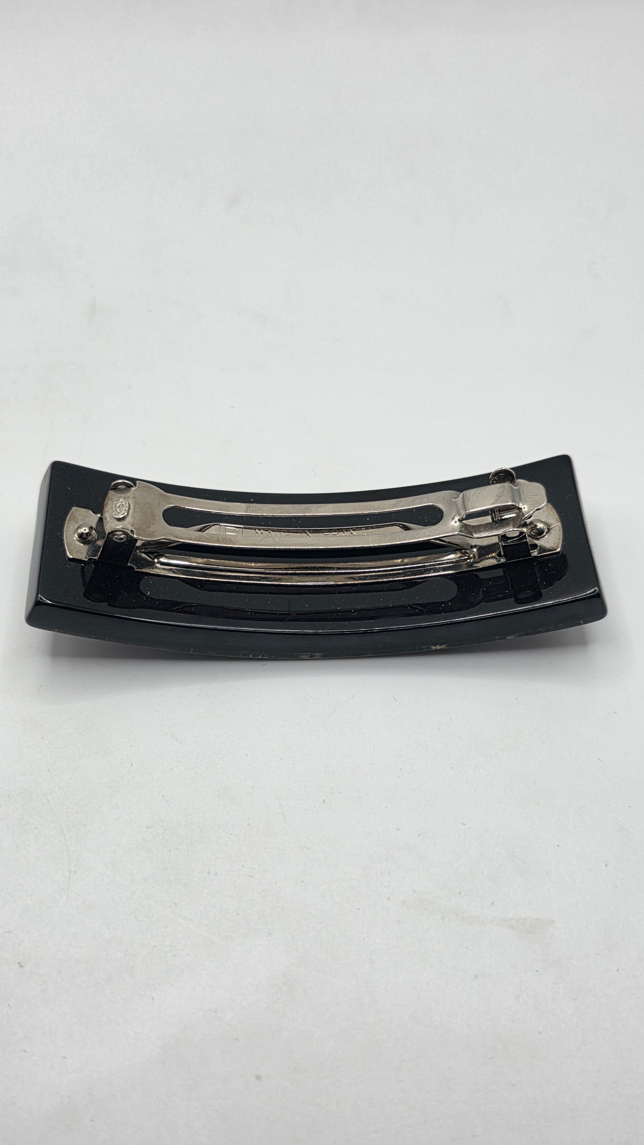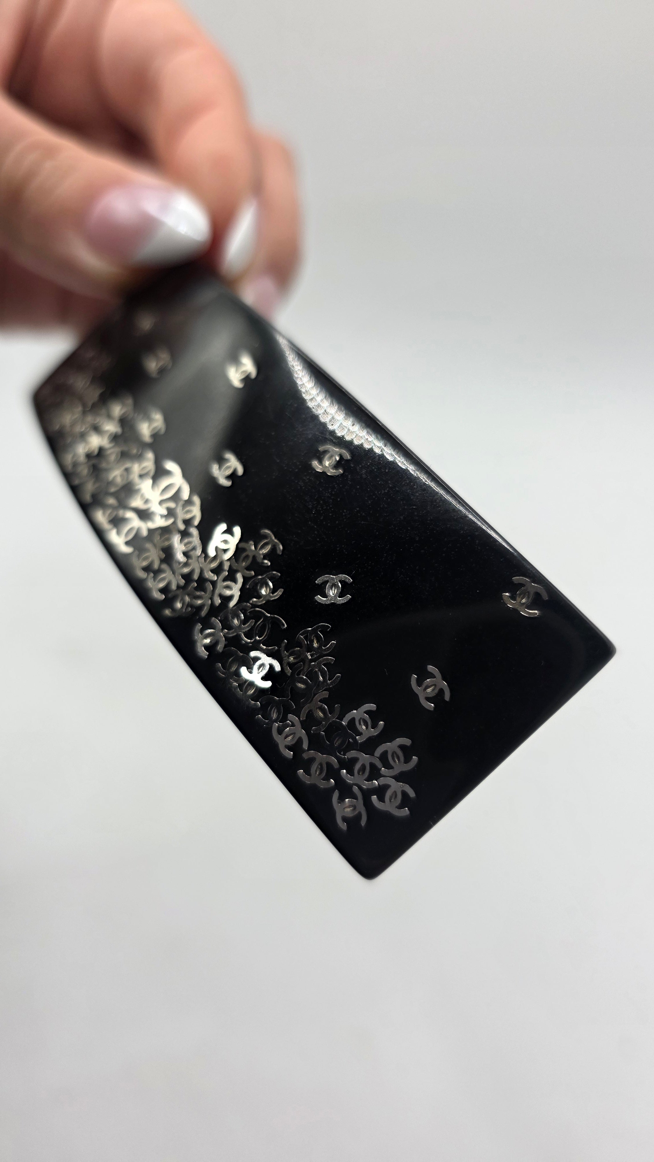 This Black Chanel Hair Clip from the 2012 collection features sleek silver-tone double C logos, making it a stylish addition to any outfit. Made from high-quality materials, it is both durable and fashionable, providing a sophisticated look for any occasion. Enhance your hair with this elegant hair clip.