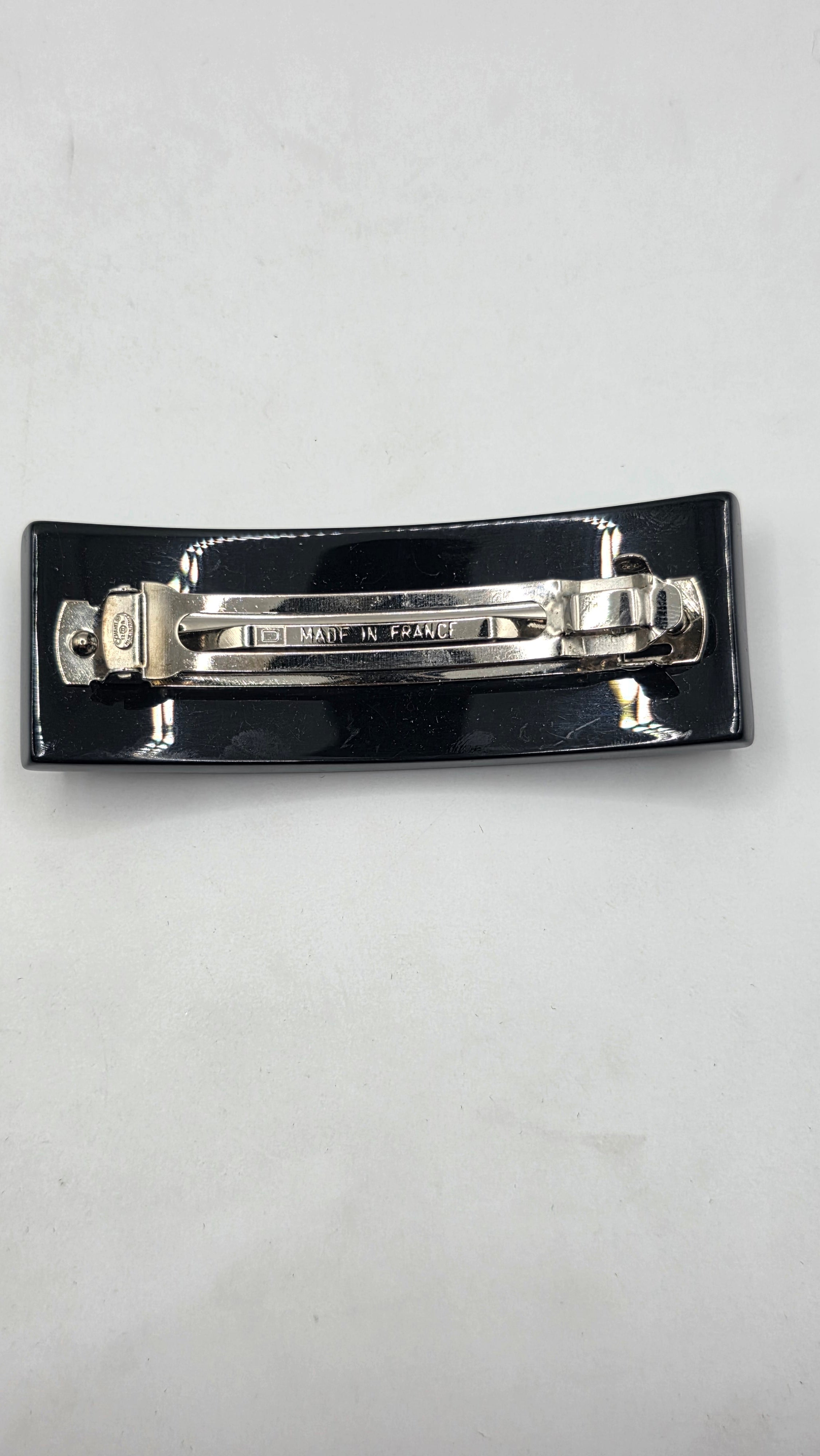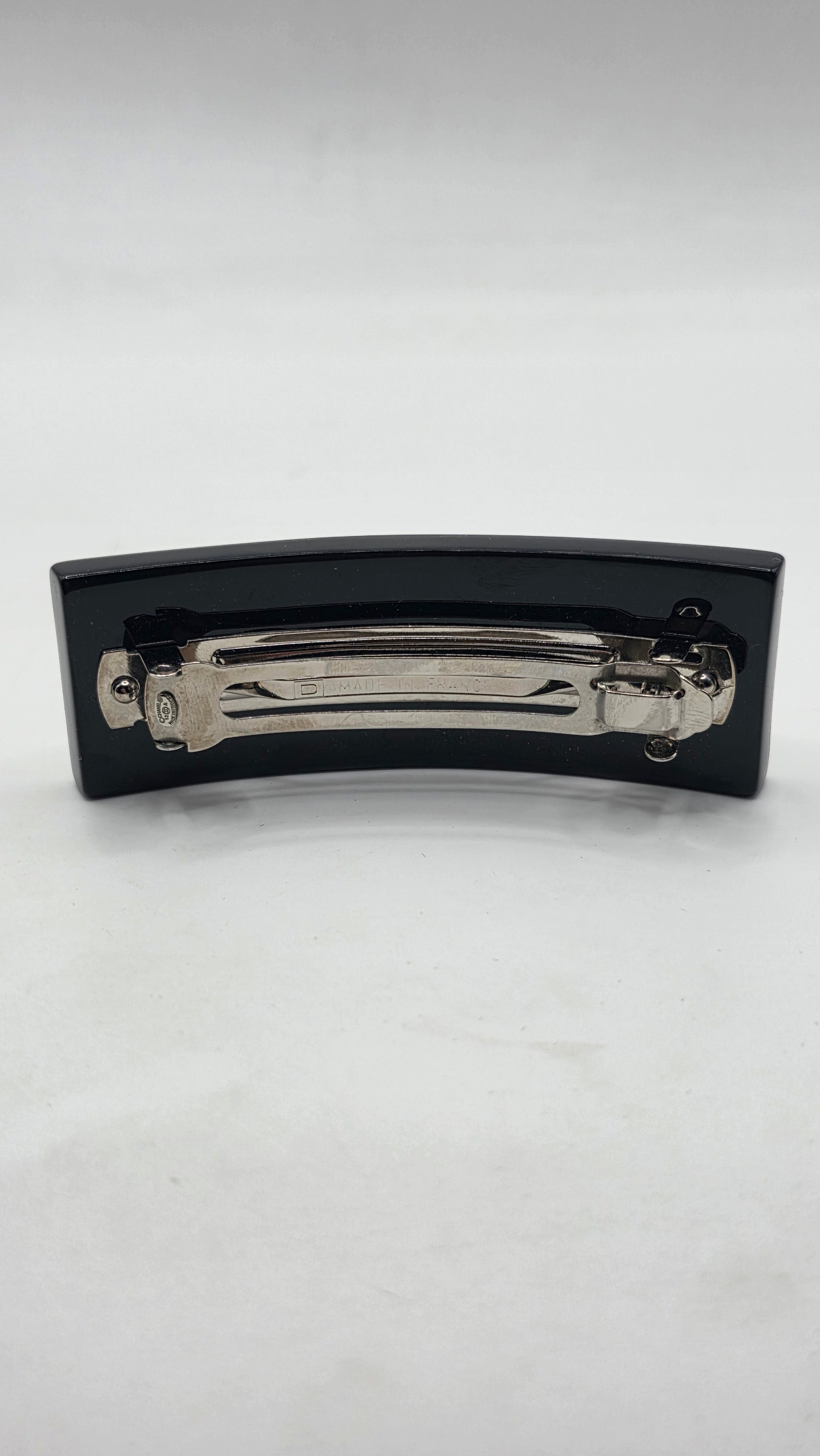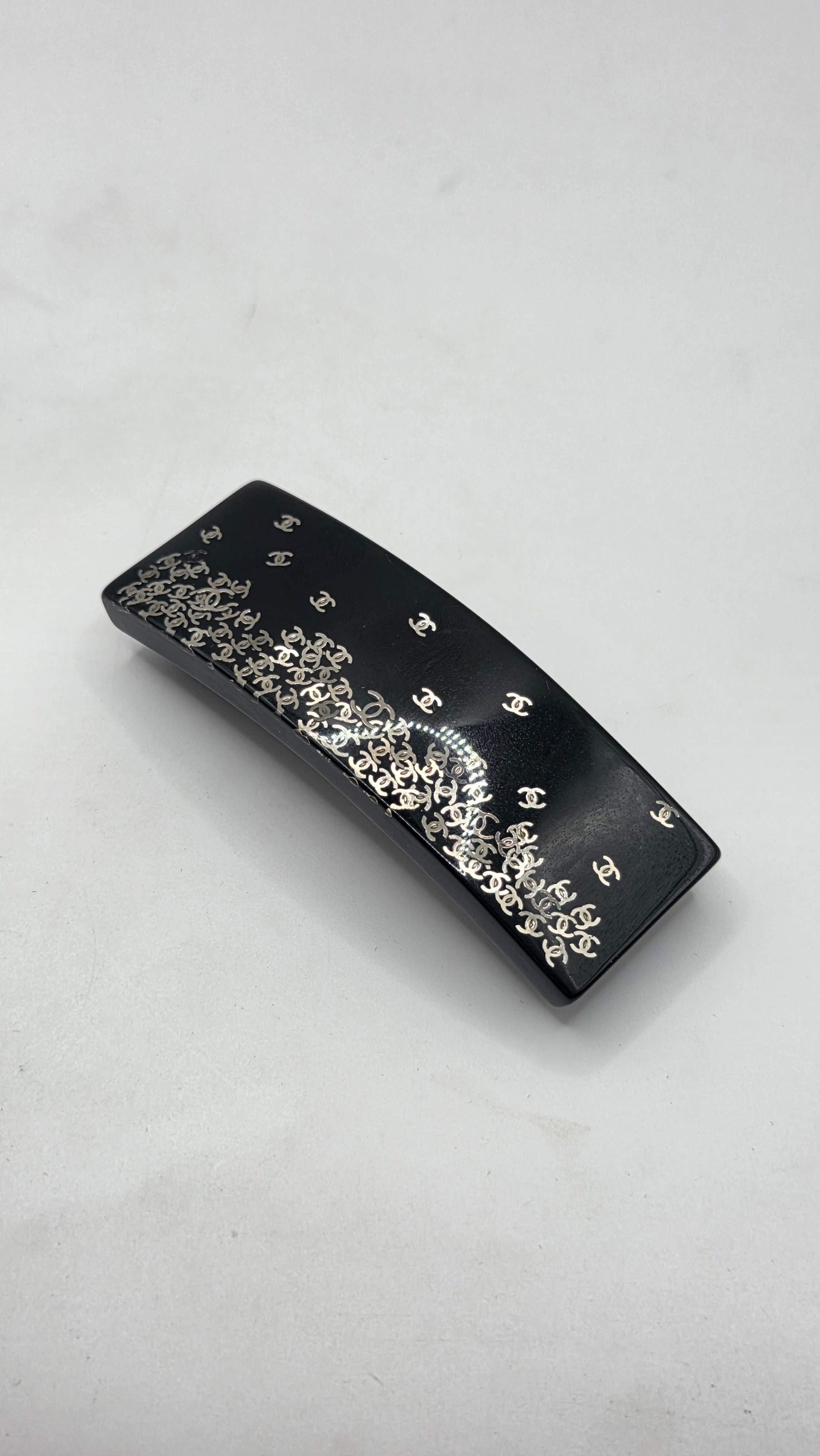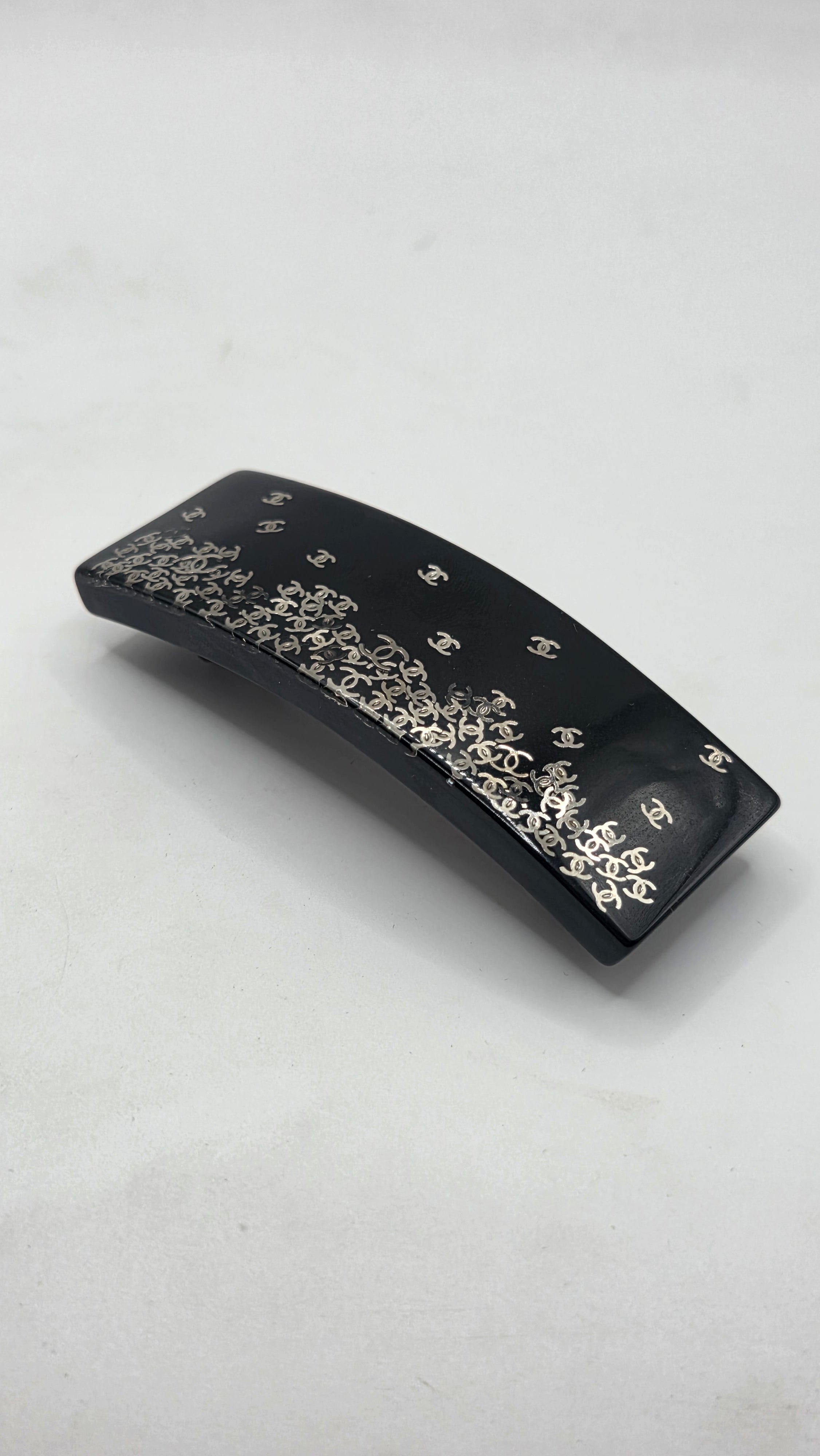 This Black Chanel Hair Clip from the 2012 collection features sleek silver-tone double C logos, making it a stylish addition to any outfit. Made from high-quality materials, it is both durable and fashionable, providing a sophisticated look for any occasion. Enhance your hair with this elegant hair clip.
