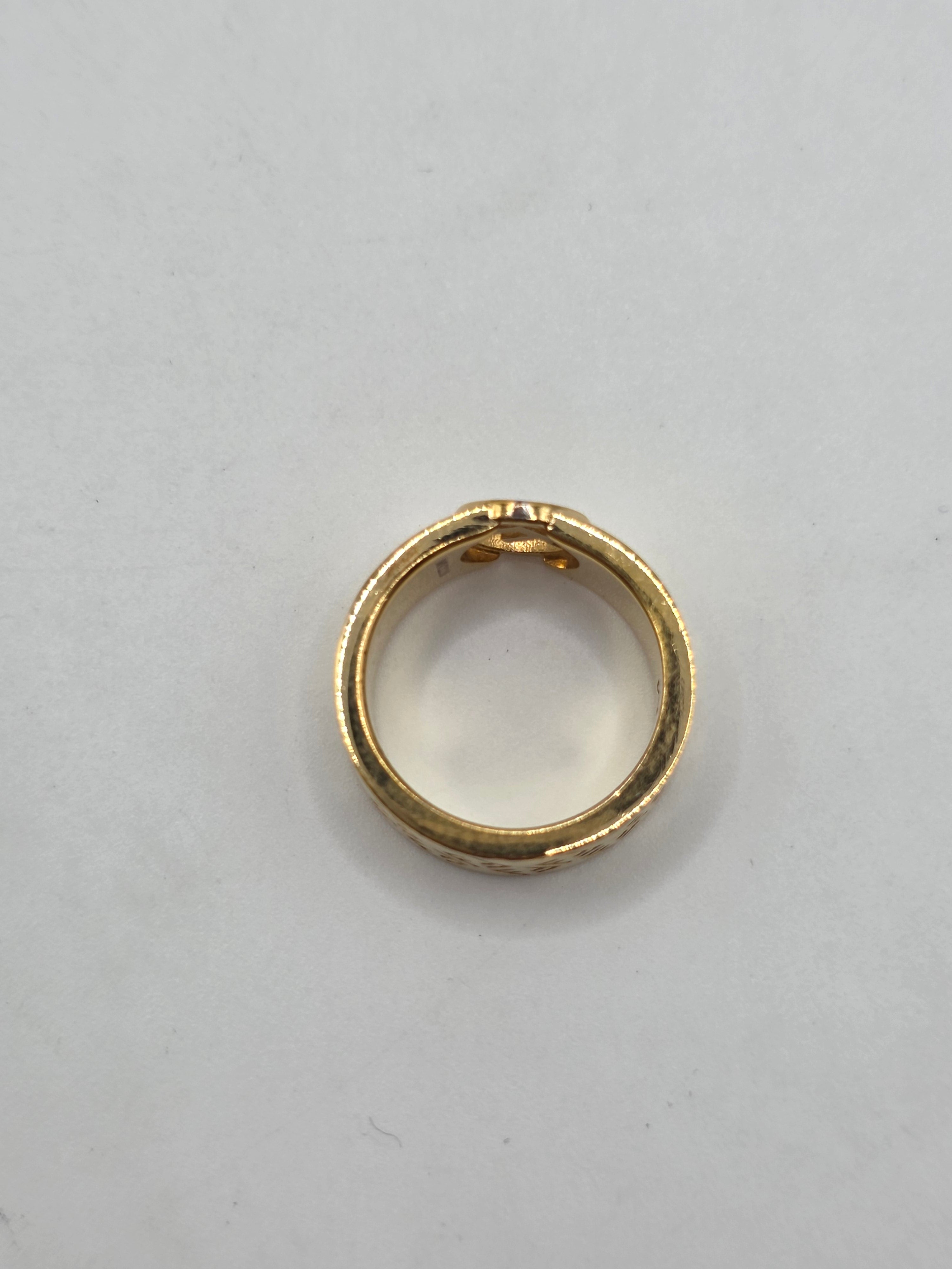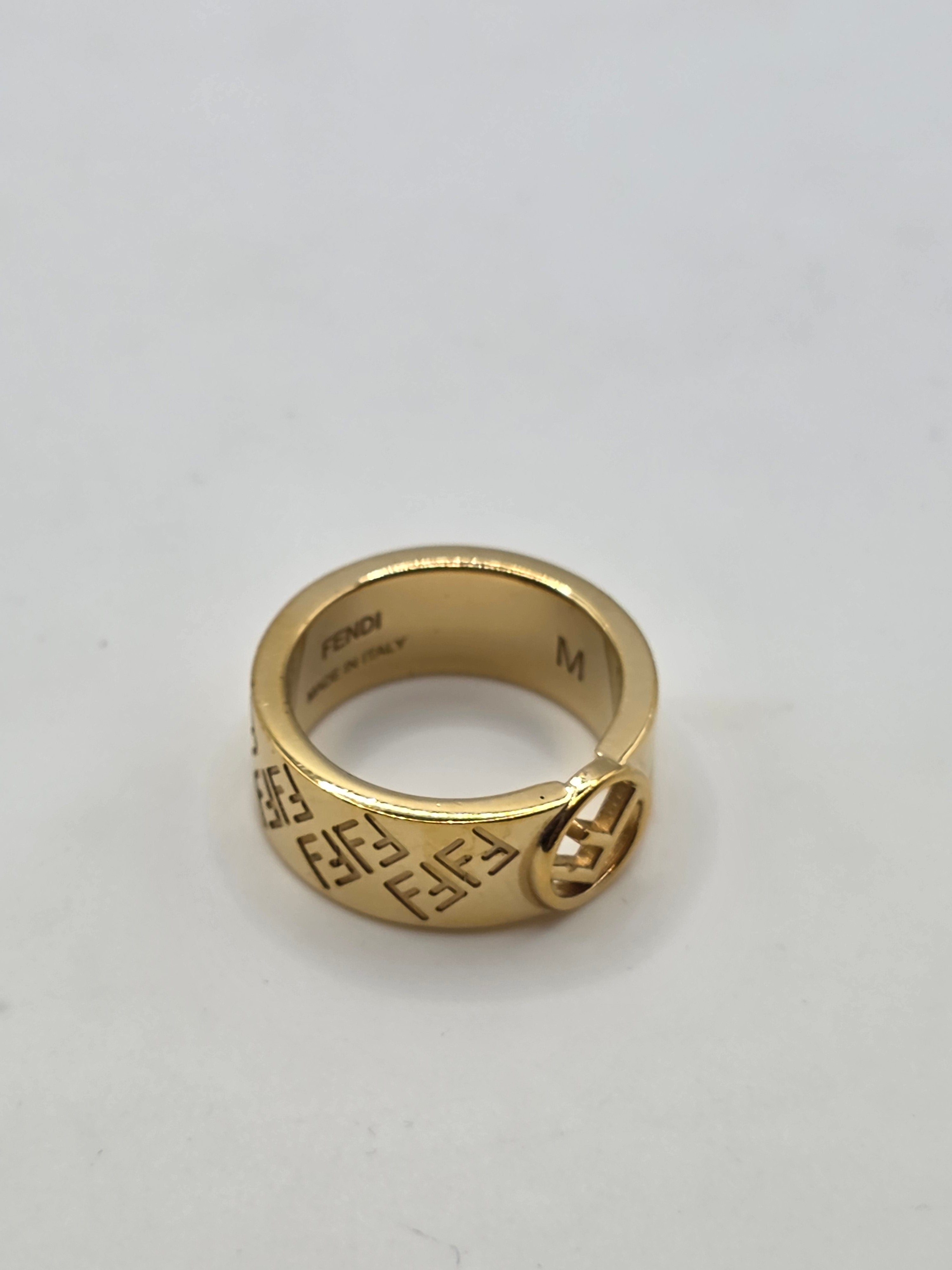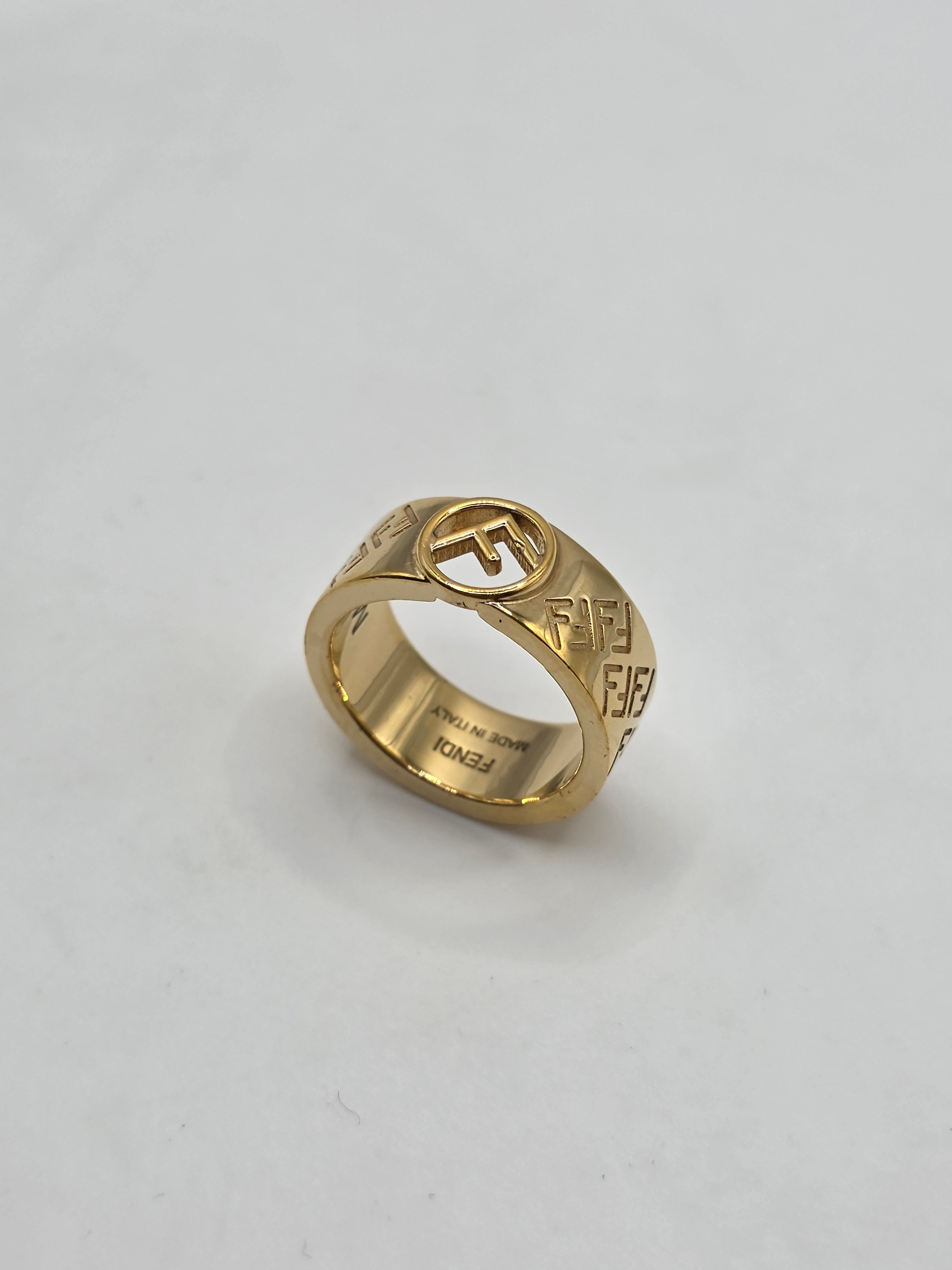 This Fendi Gold-tone FF Logo Band Ring in size 6.5 is the perfect addition to any outfit. Featuring the iconic FF logo, this ring exudes luxury and sophistication. Crafted with high-quality materials, it is sure to make a lasting statement. Elevate your style with this elegant and timeless piece.
