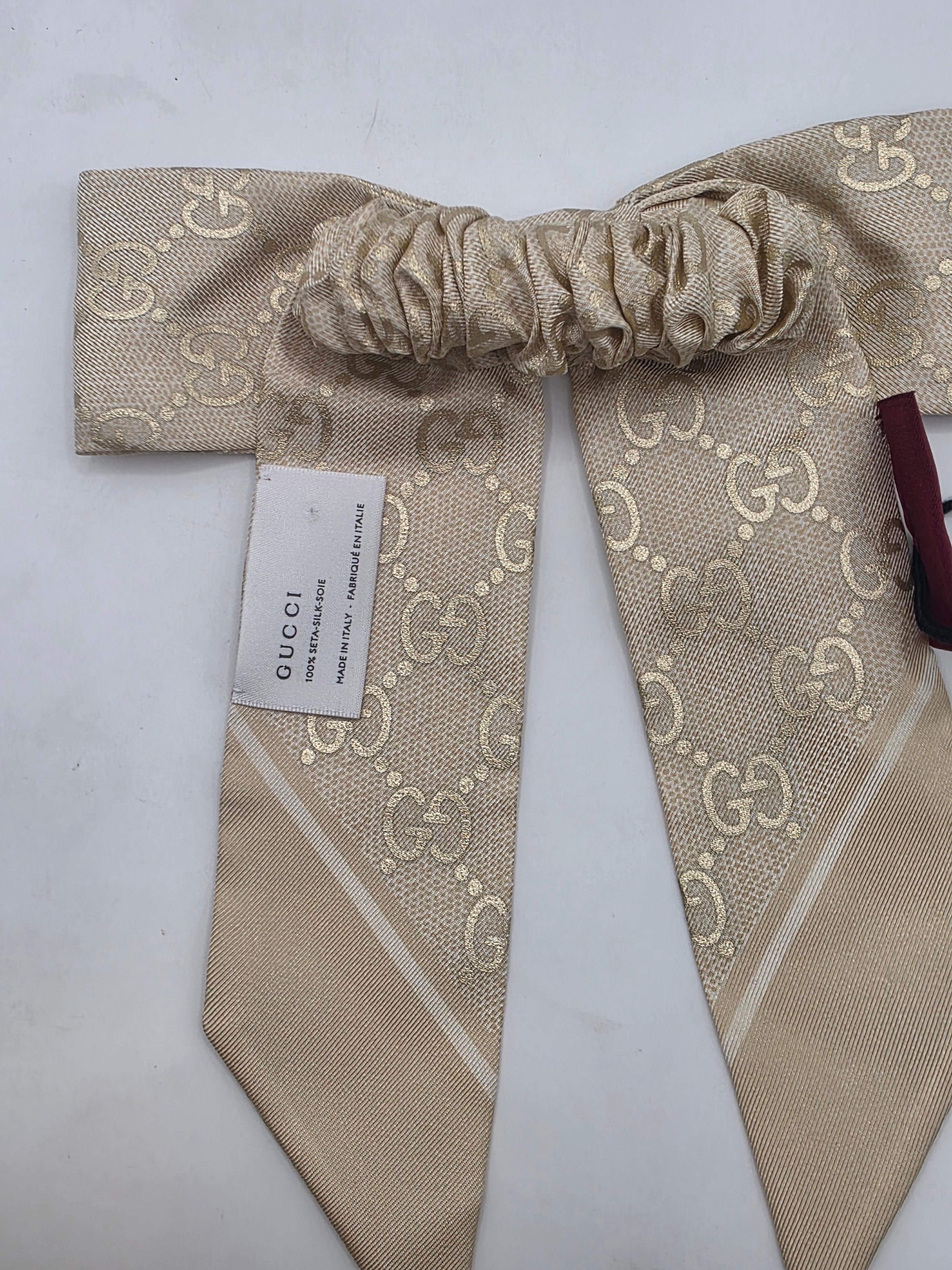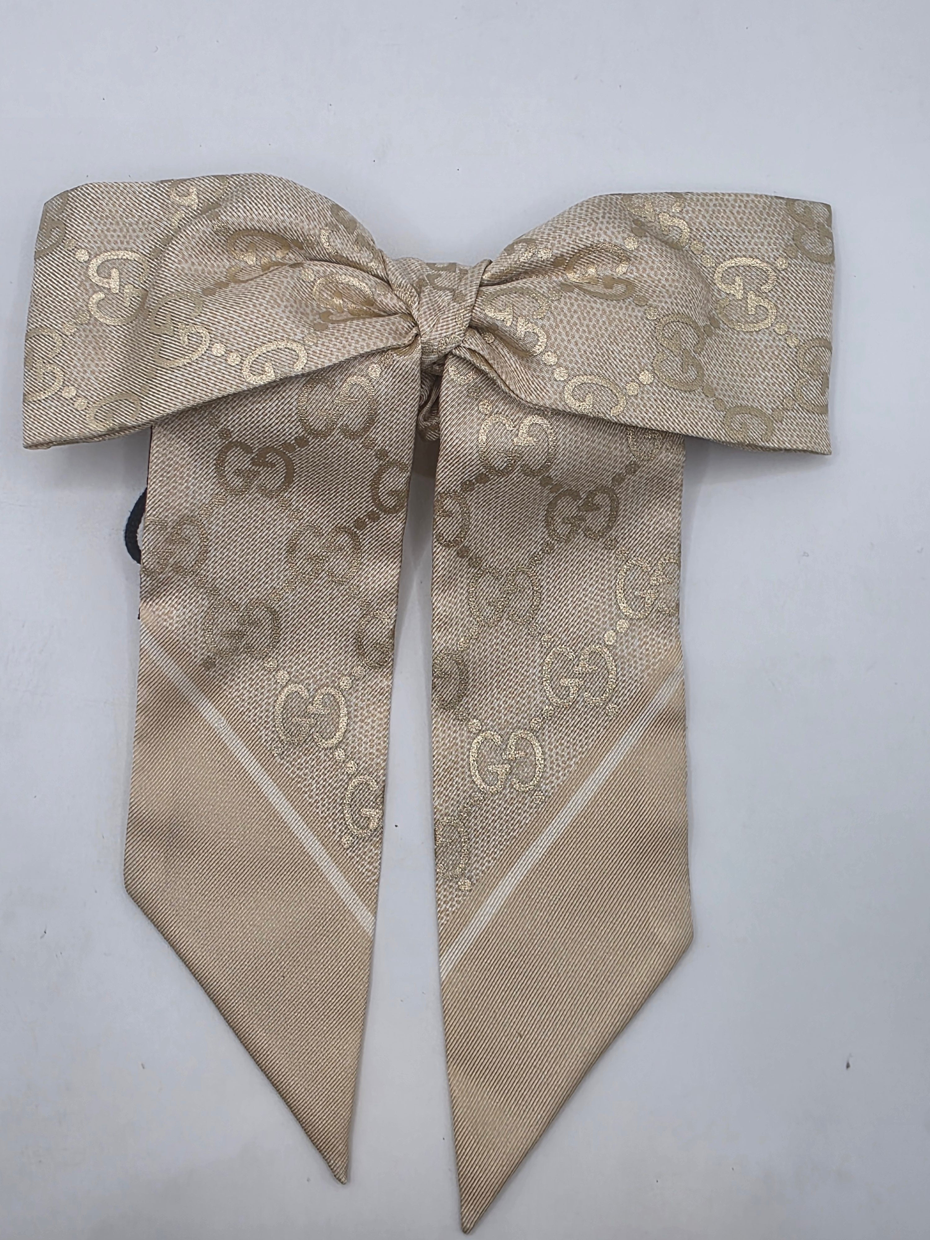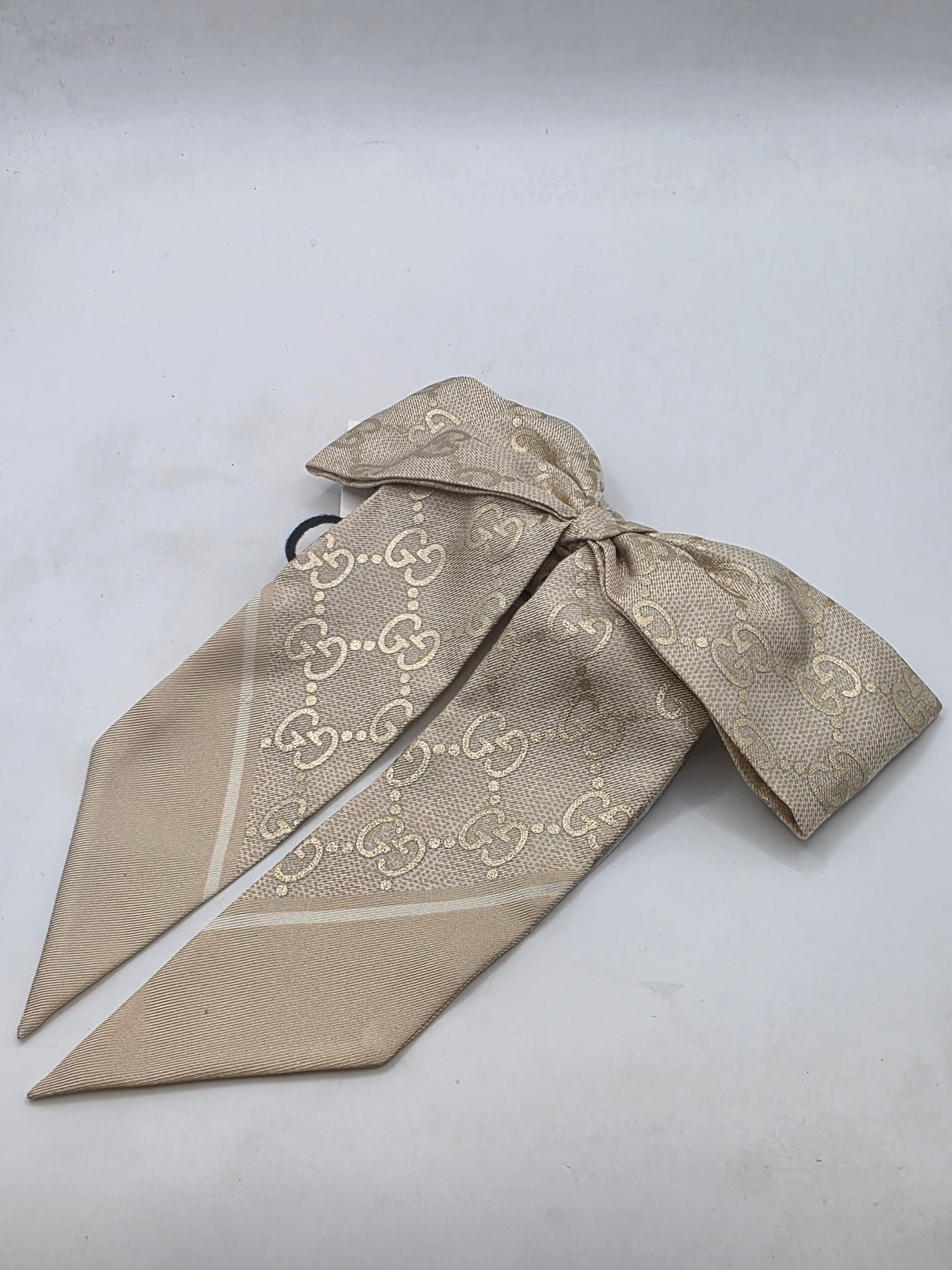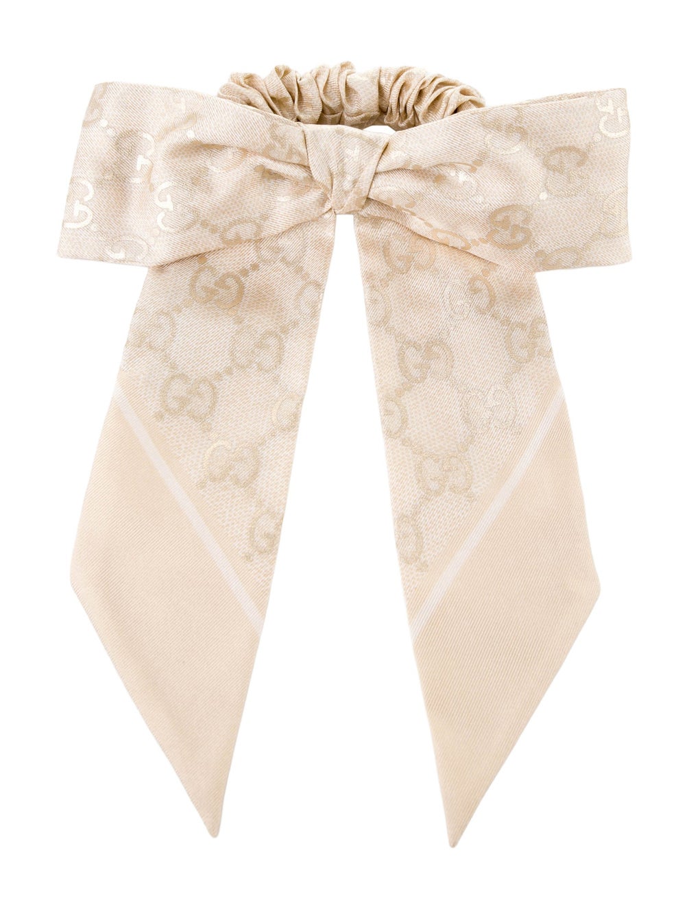 This light beige hair scrunchy features the iconic Interlocking GG logo from Gucci. Made with high-quality materials, it adds a touch of luxury to any hairstyle. Perfect for everyday wear or special occasions, this hair bow scrunchy is a versatile accessory that showcases both style and sophistication.