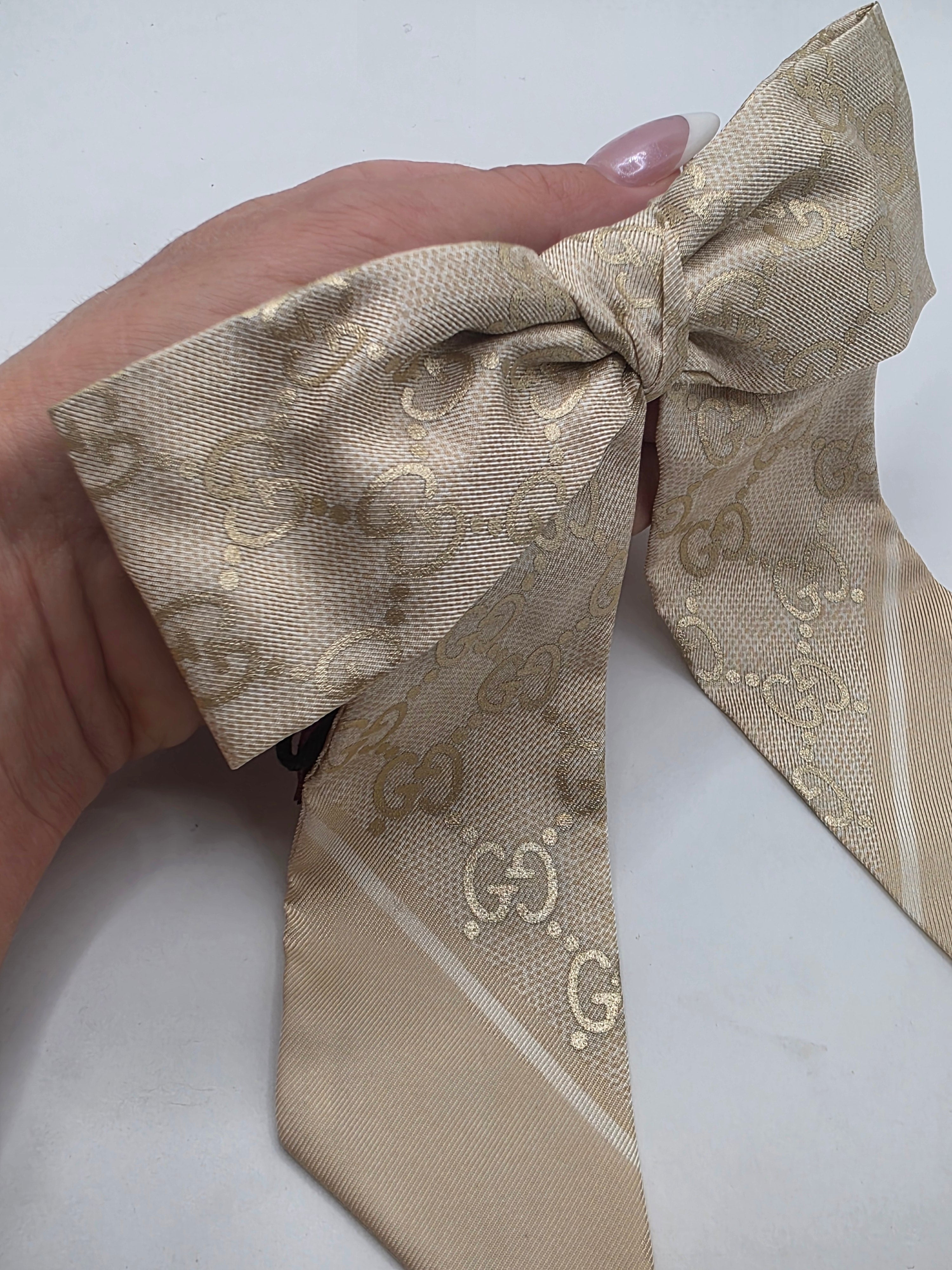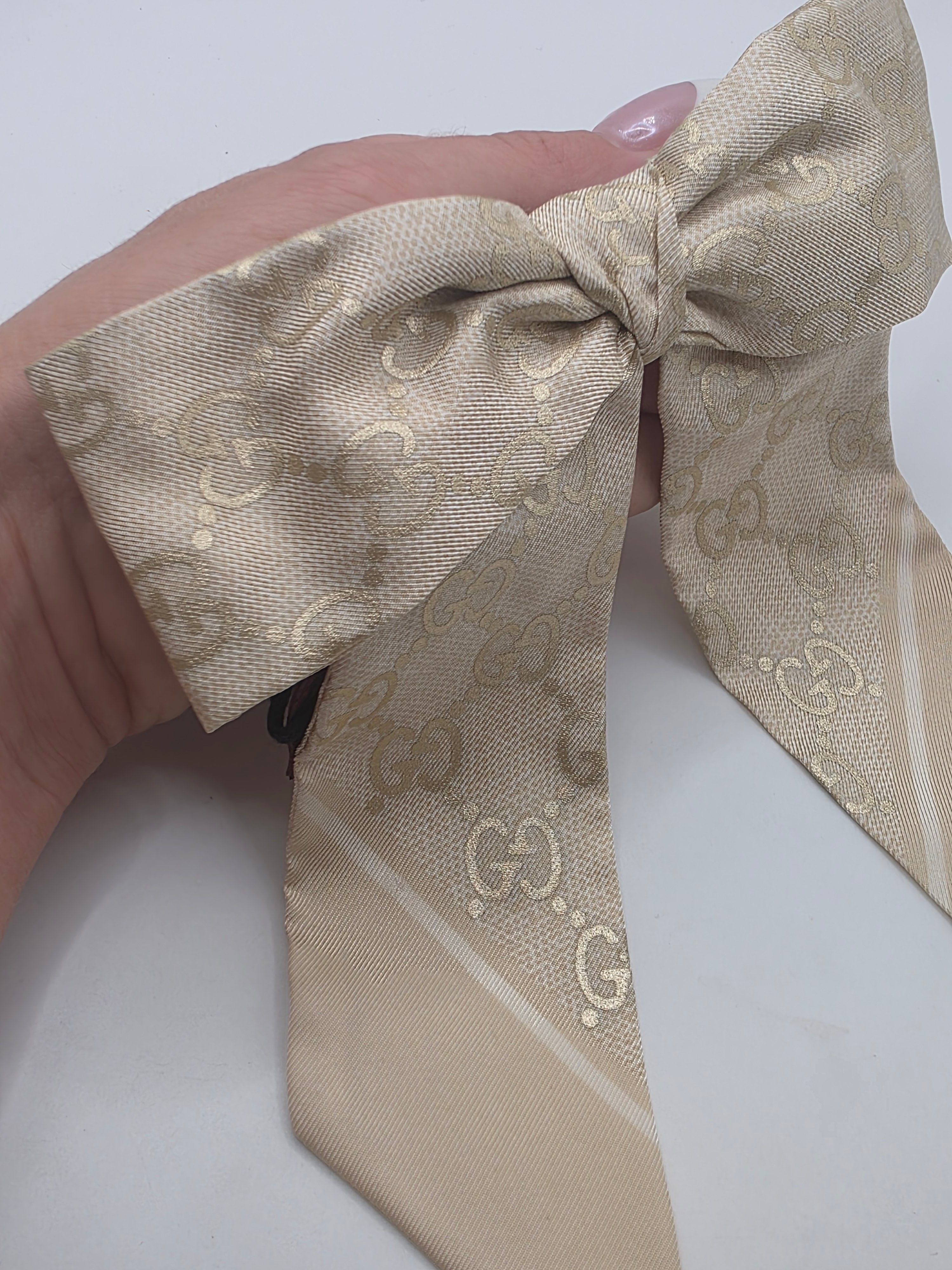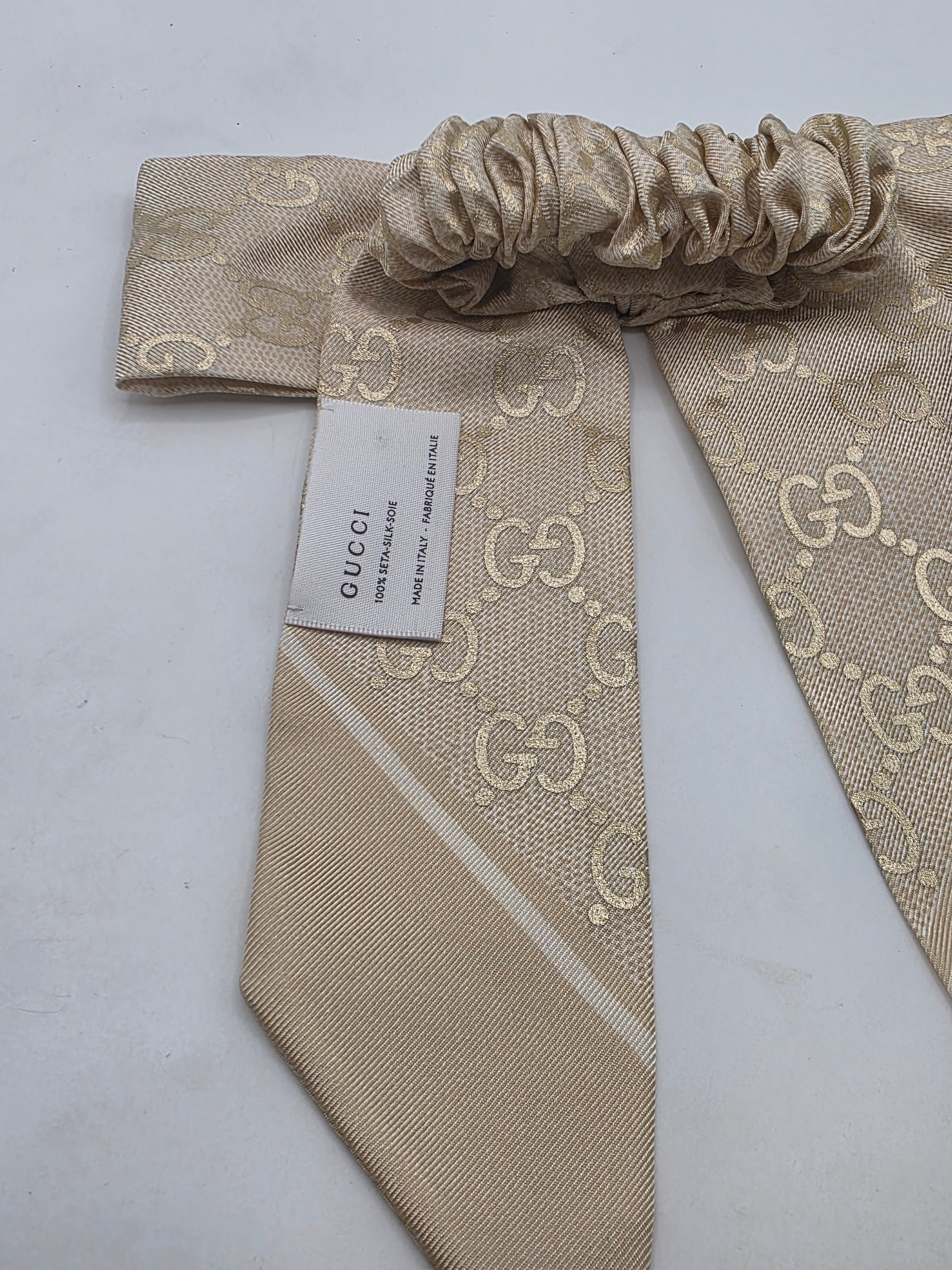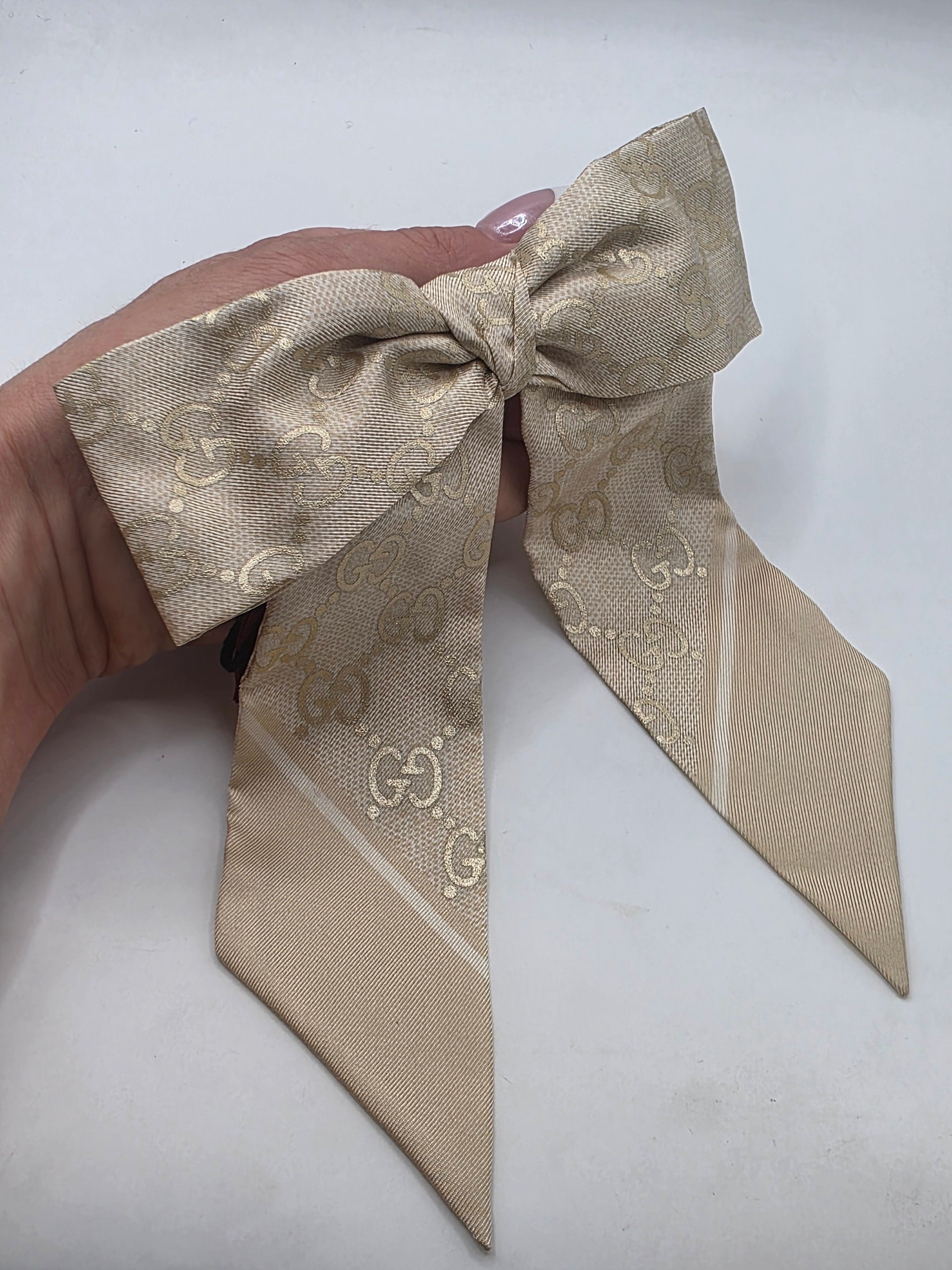 This light beige hair scrunchy features the iconic Interlocking GG logo from Gucci. Made with high-quality materials, it adds a touch of luxury to any hairstyle. Perfect for everyday wear or special occasions, this hair bow scrunchy is a versatile accessory that showcases both style and sophistication.