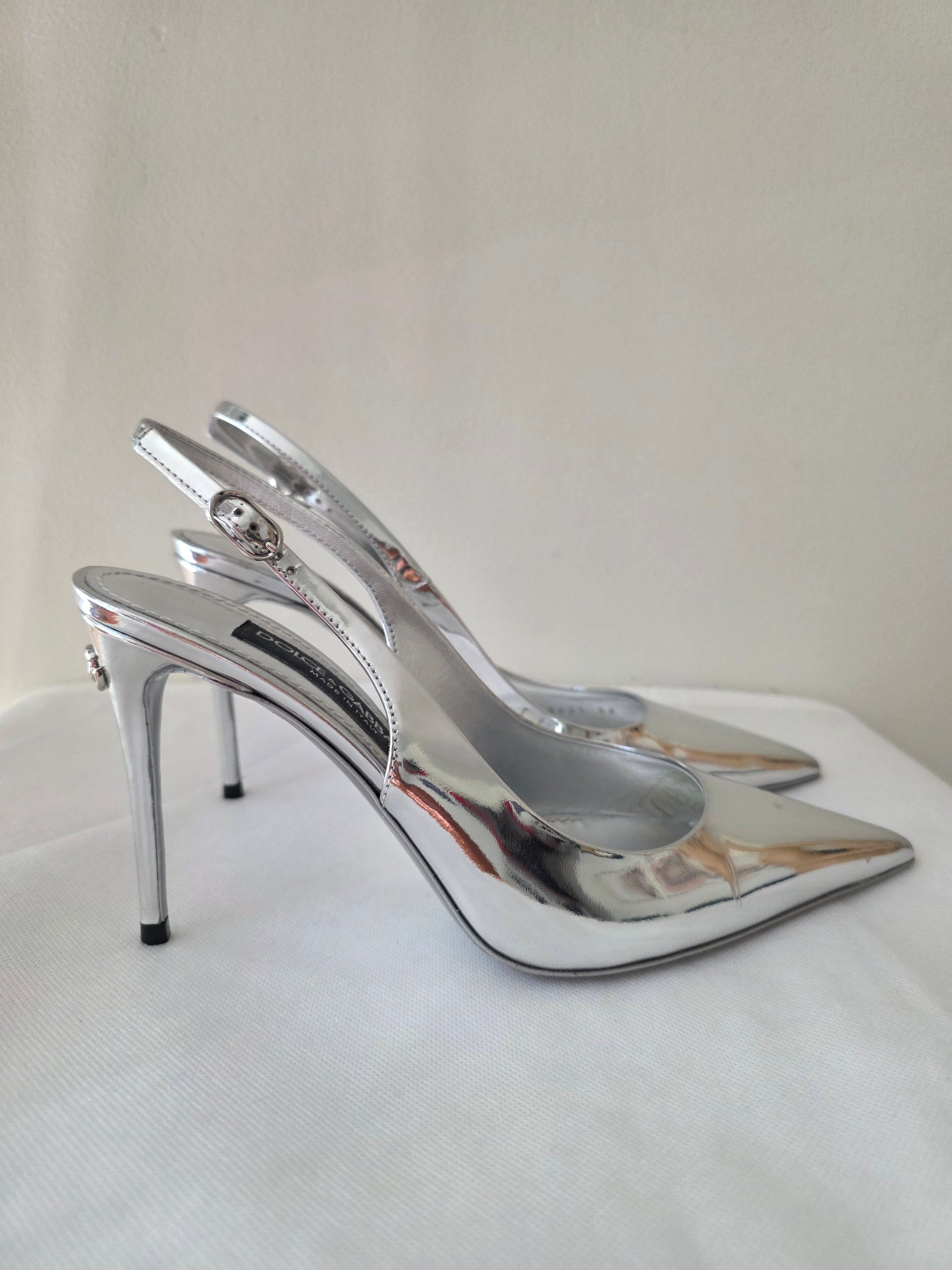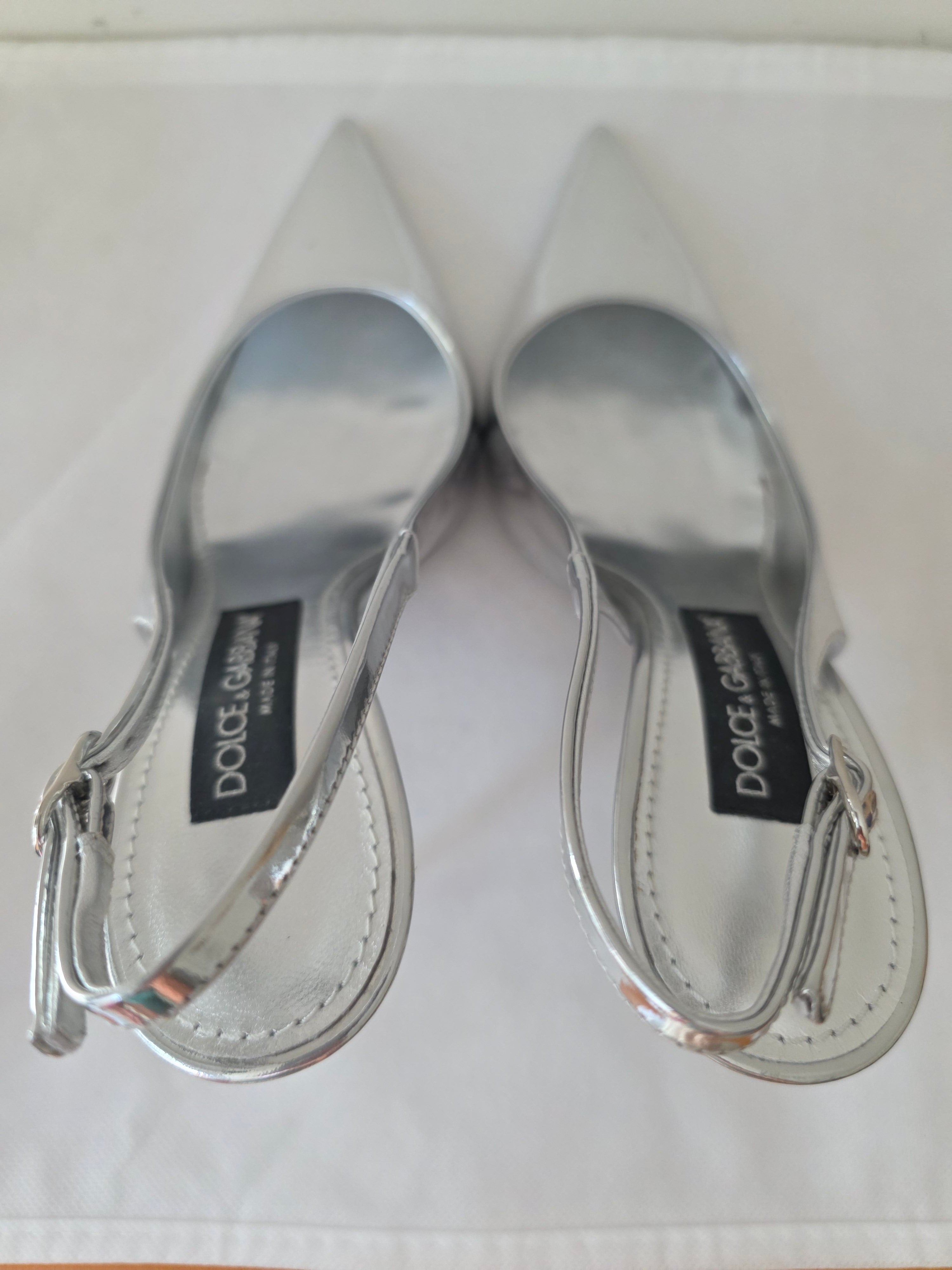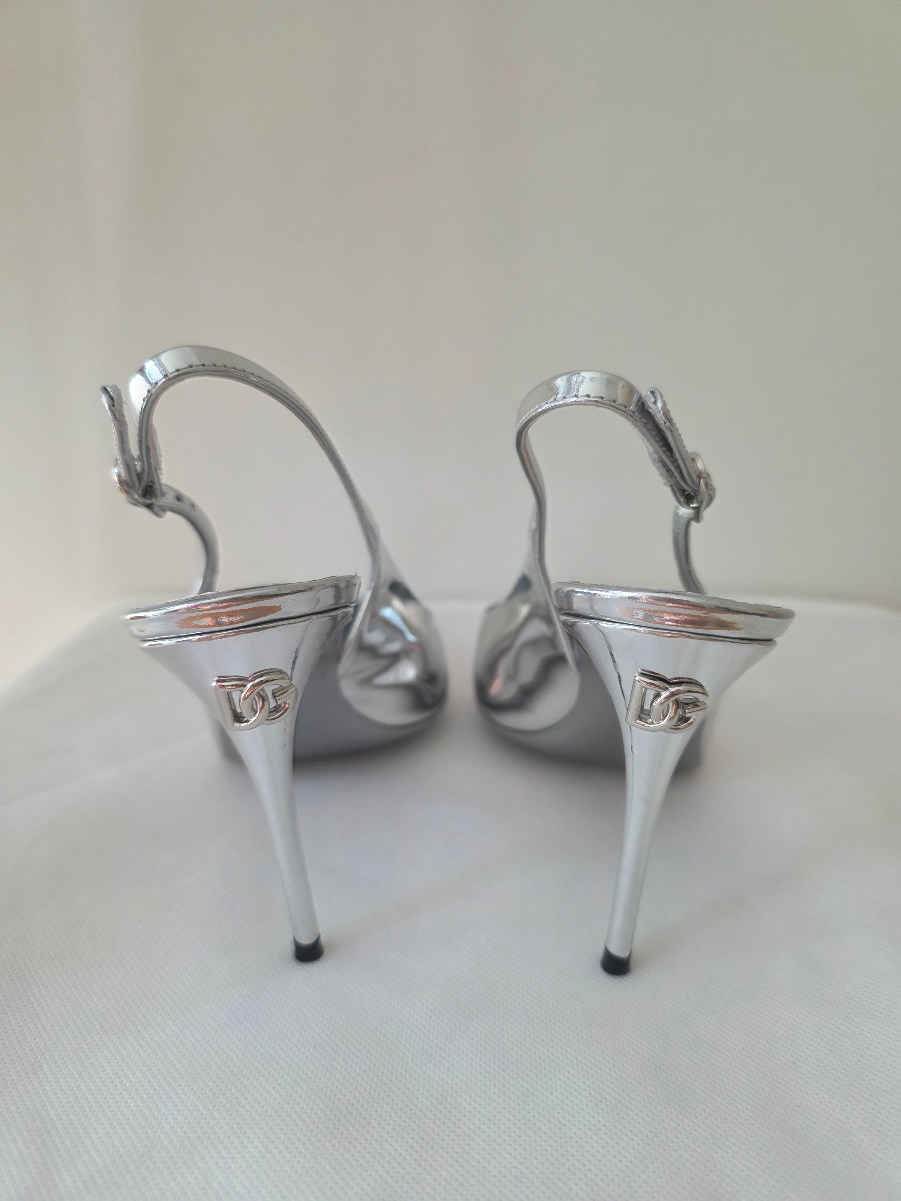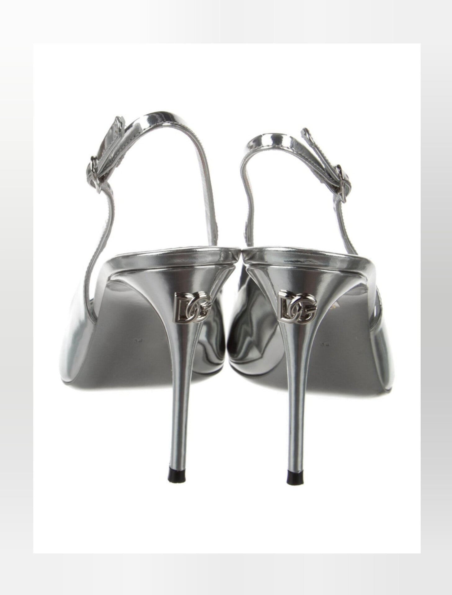 Elevate your shoe game with Dolce & Gabbana's Metallic Silver Patent Leather DG Logo Slingback Pumps. These sleek pointed-toe pumps feature a stylish buckle closure at the ankles, adding a touch of sophistication to any outfit. Crafted from high-quality patent leather, they offer both style and comfort for the modern fashionista.