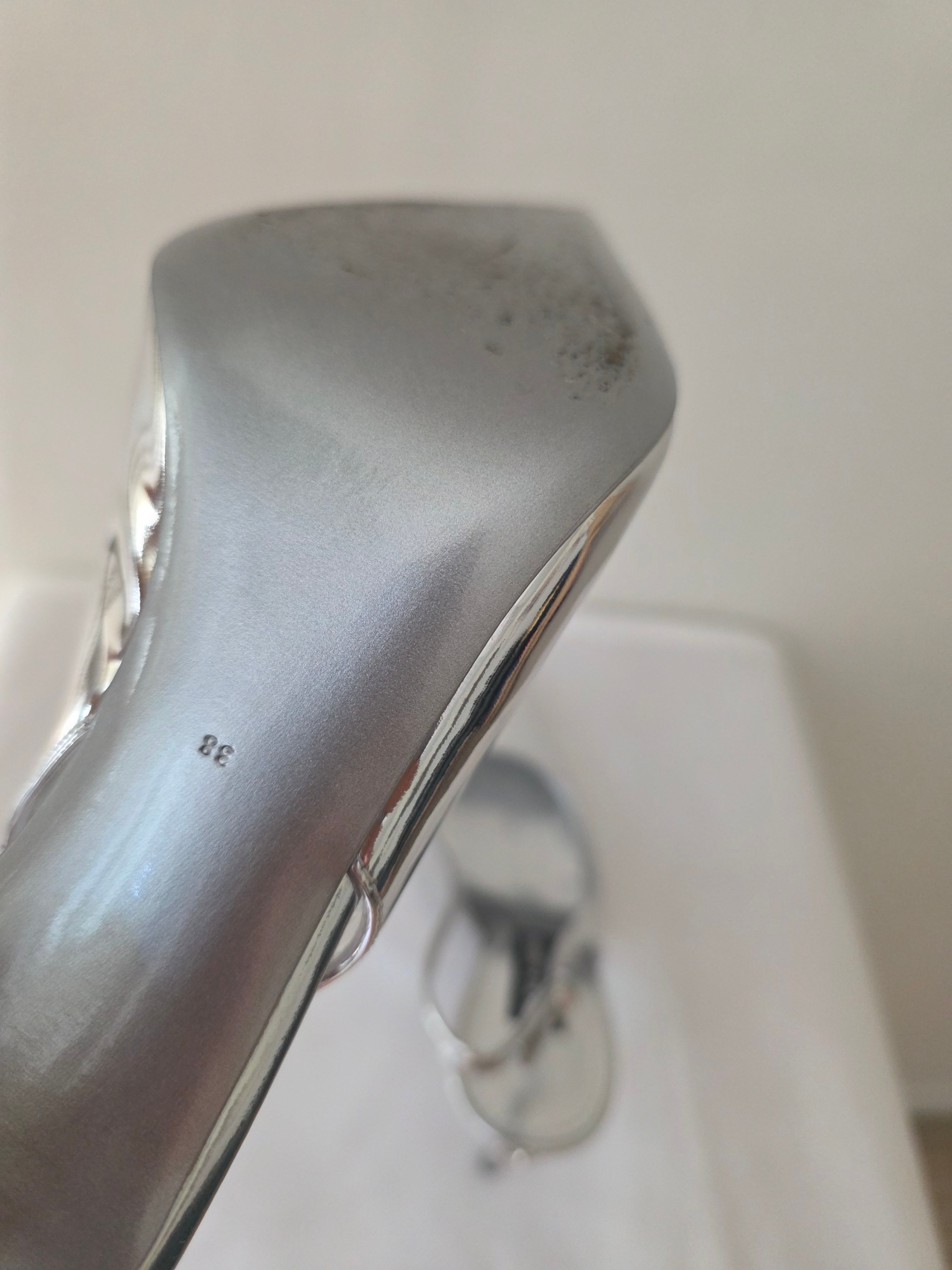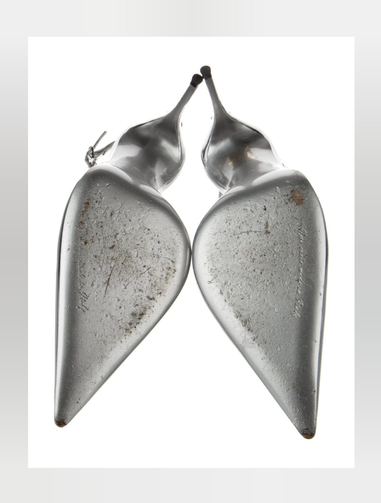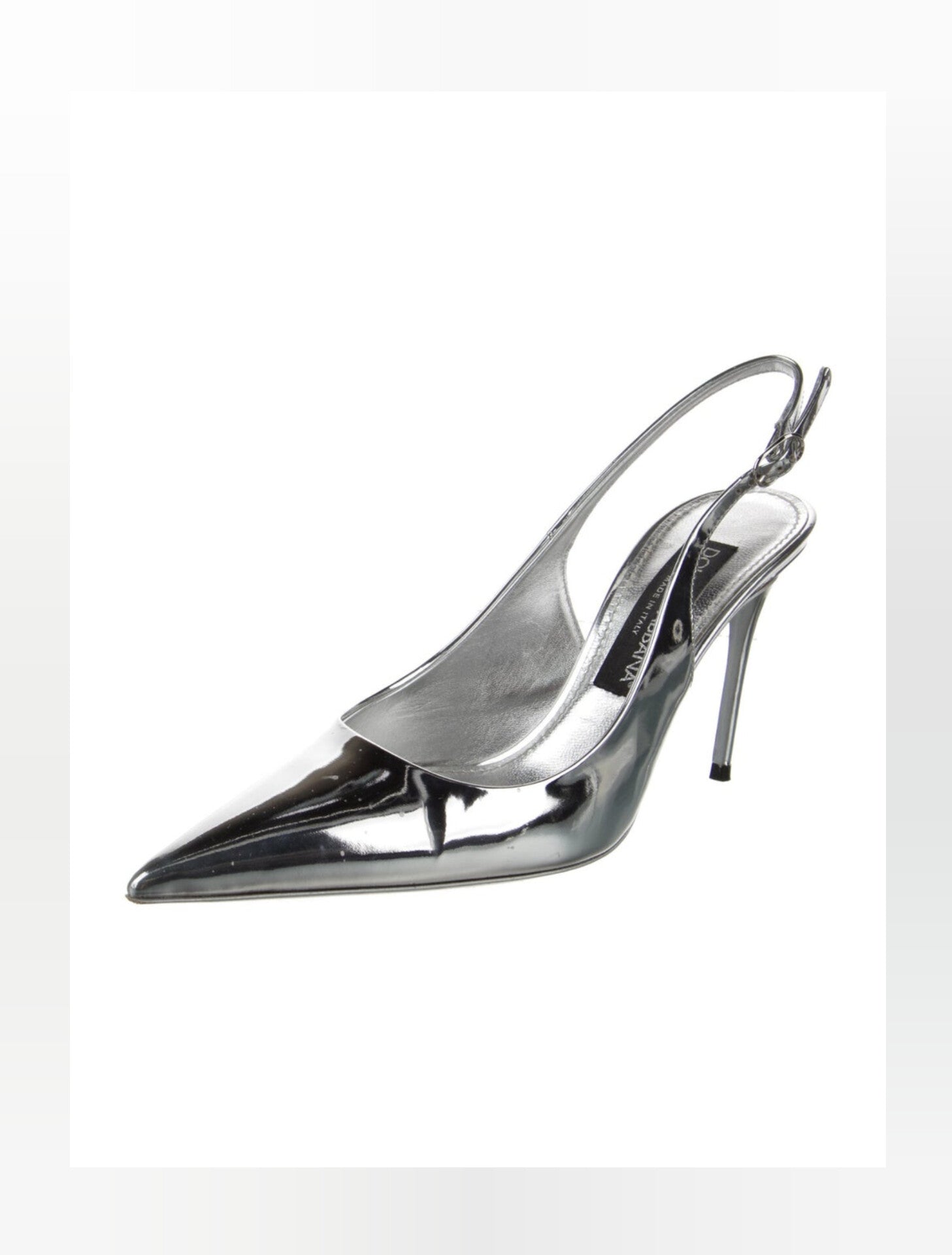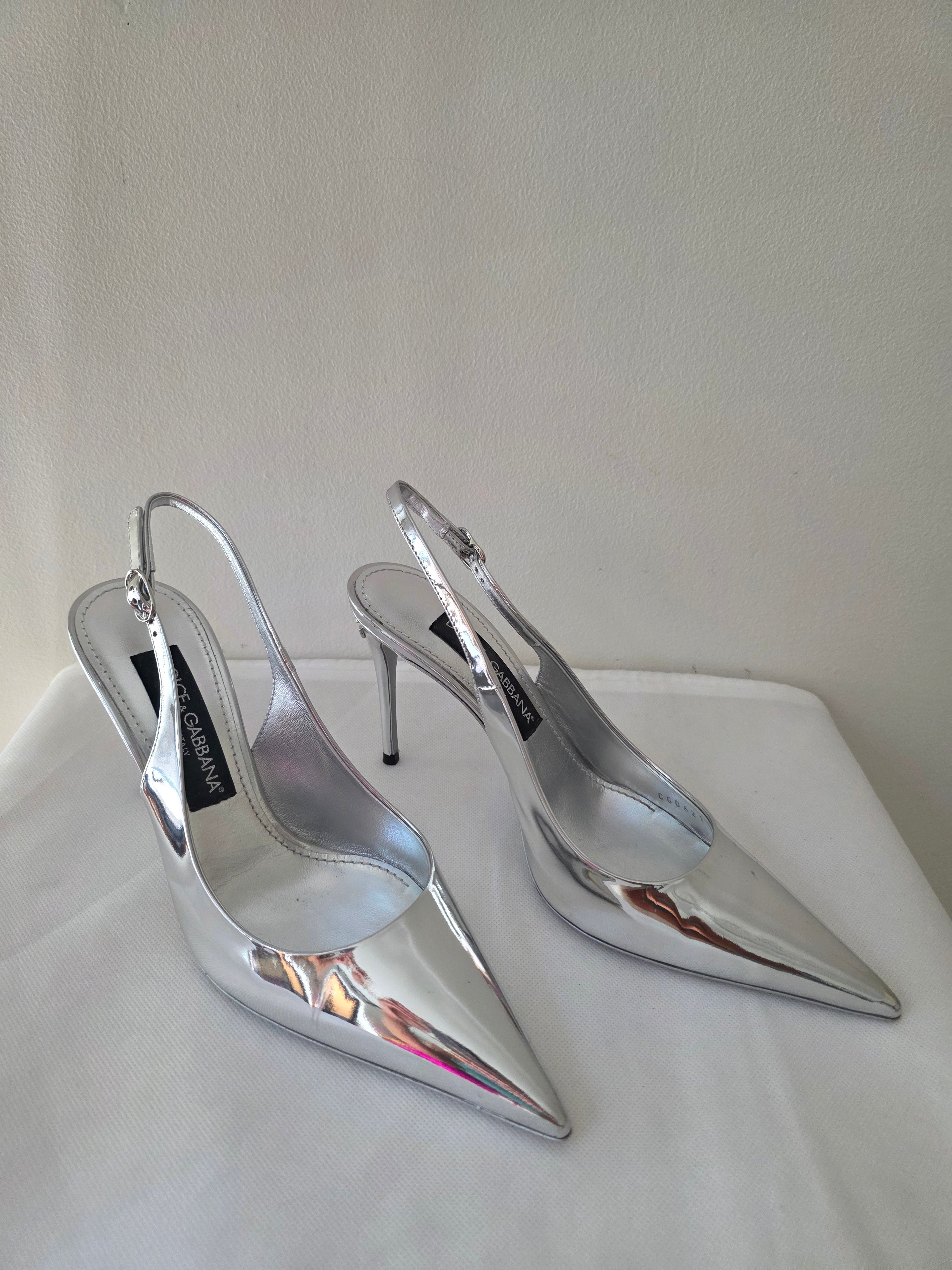 Elevate your shoe game with Dolce & Gabbana's Metallic Silver Patent Leather DG Logo Slingback Pumps. These sleek pointed-toe pumps feature a stylish buckle closure at the ankles, adding a touch of sophistication to any outfit. Crafted from high-quality patent leather, they offer both style and comfort for the modern fashionista.