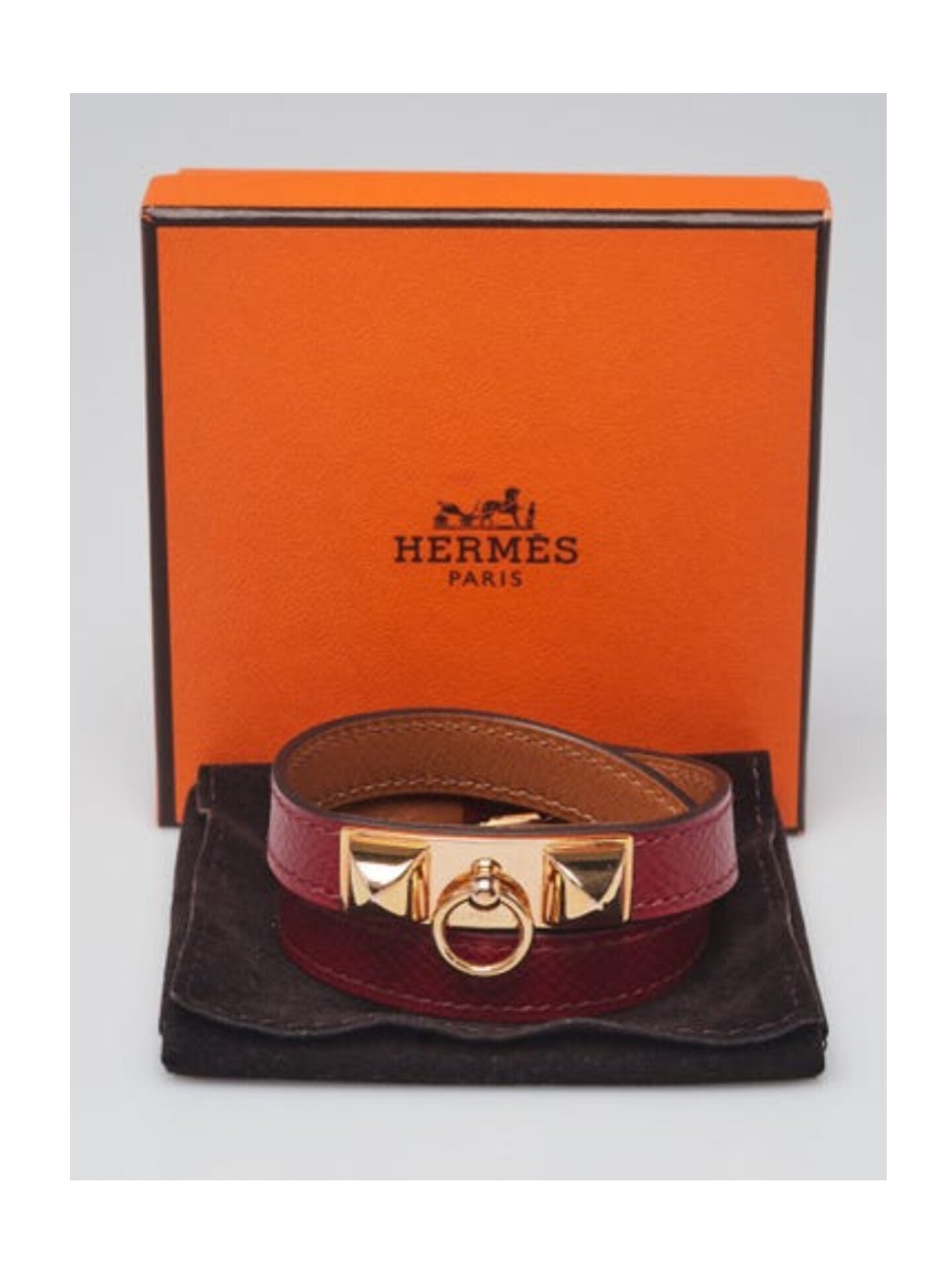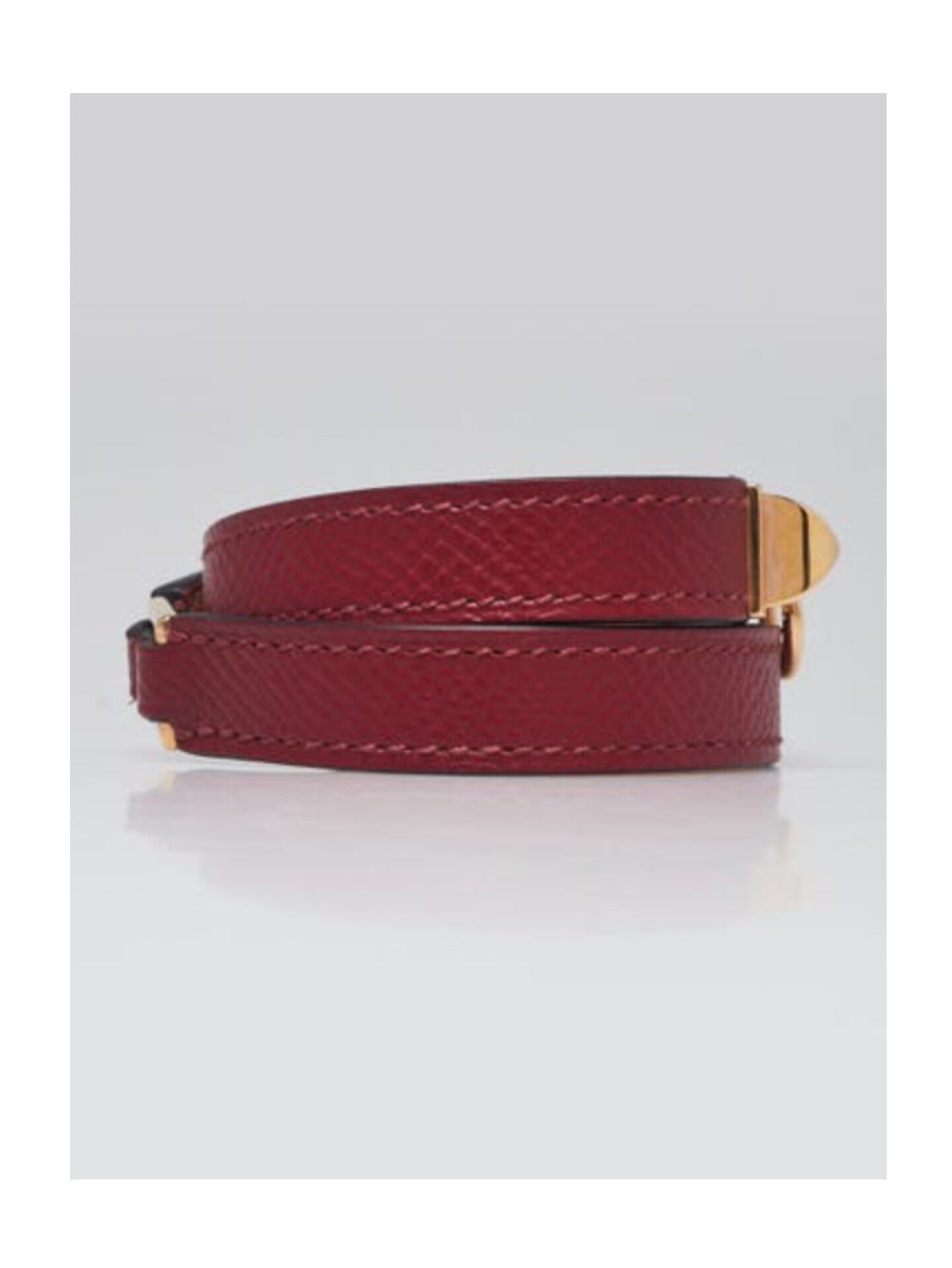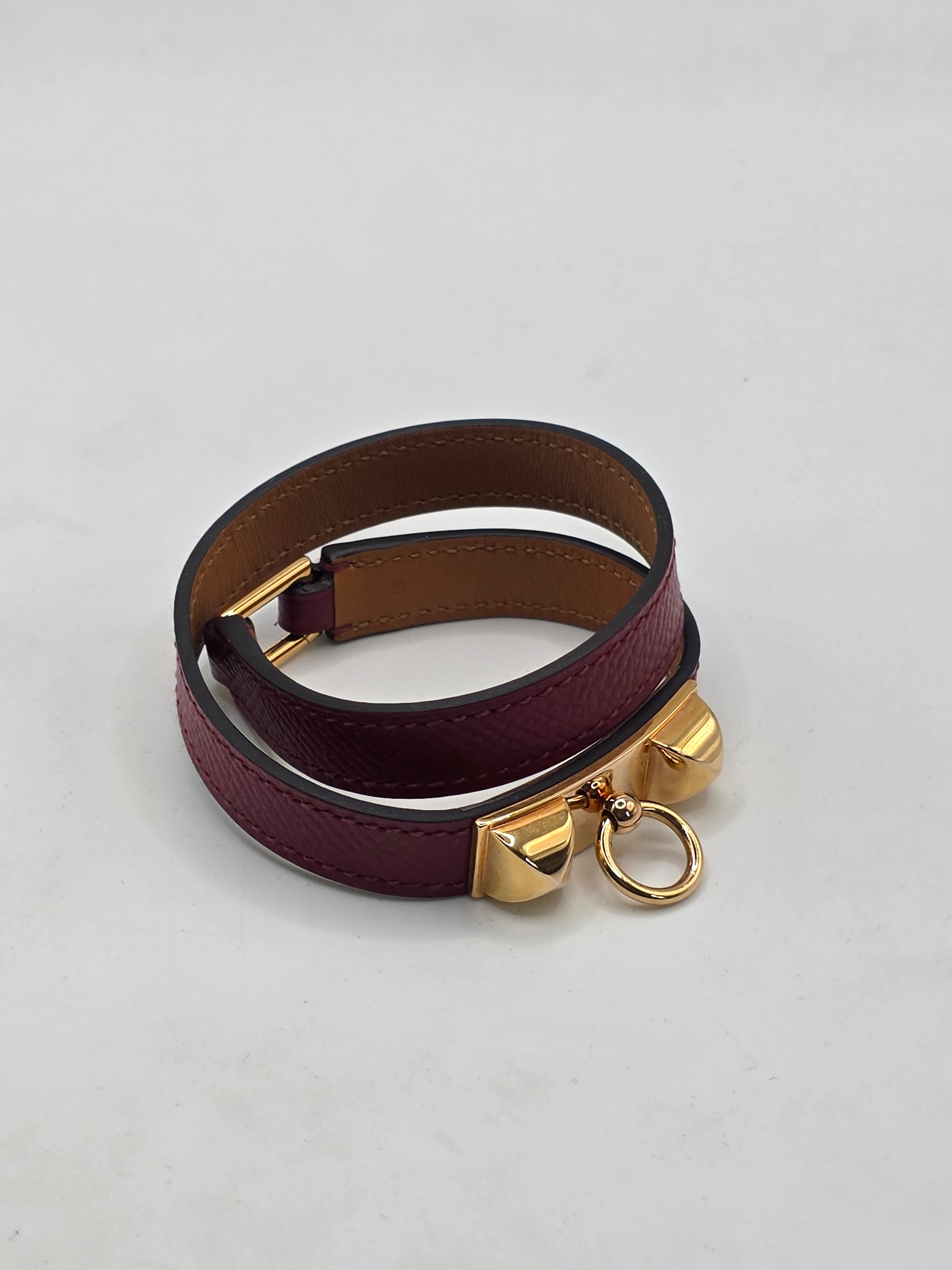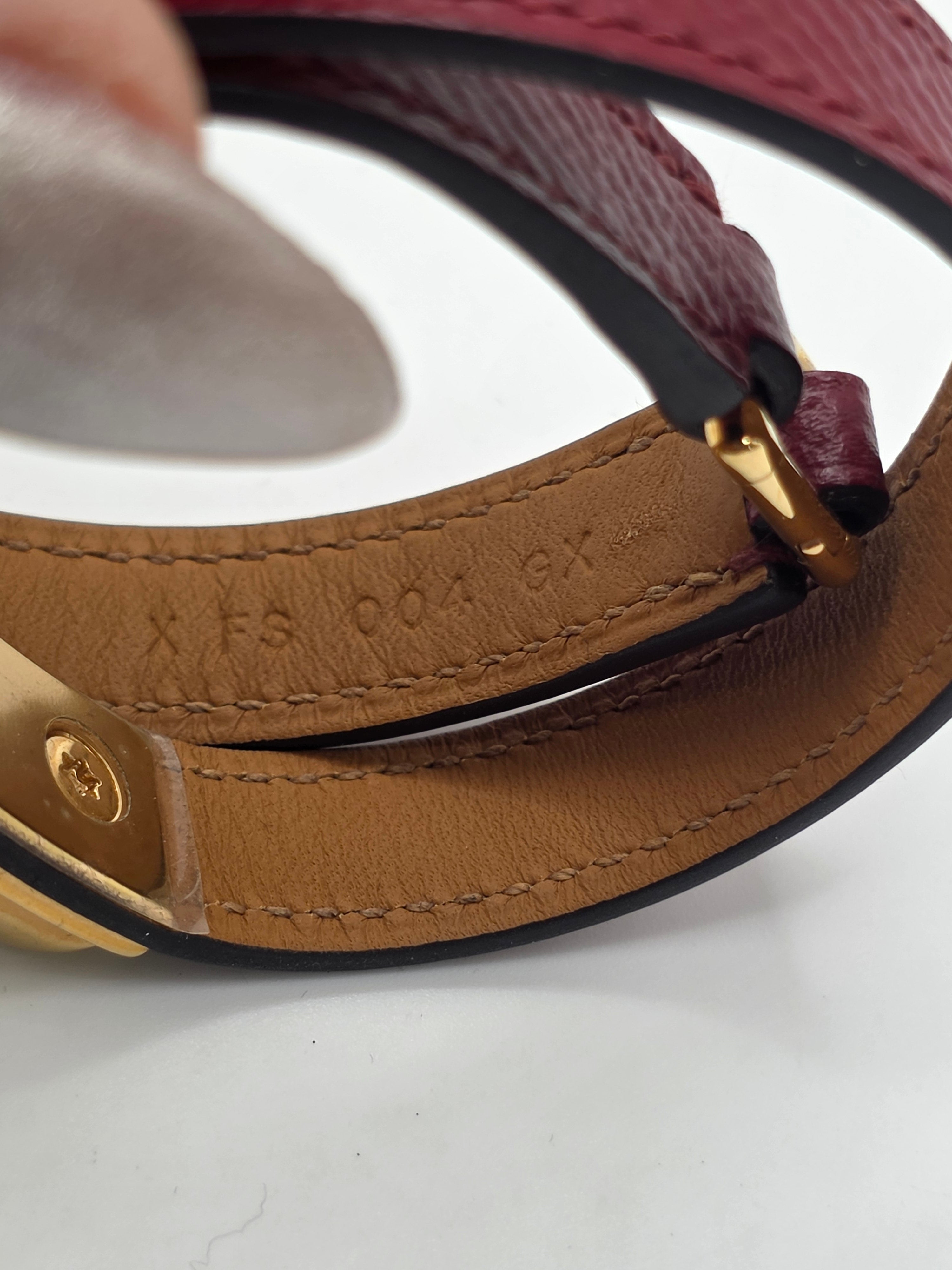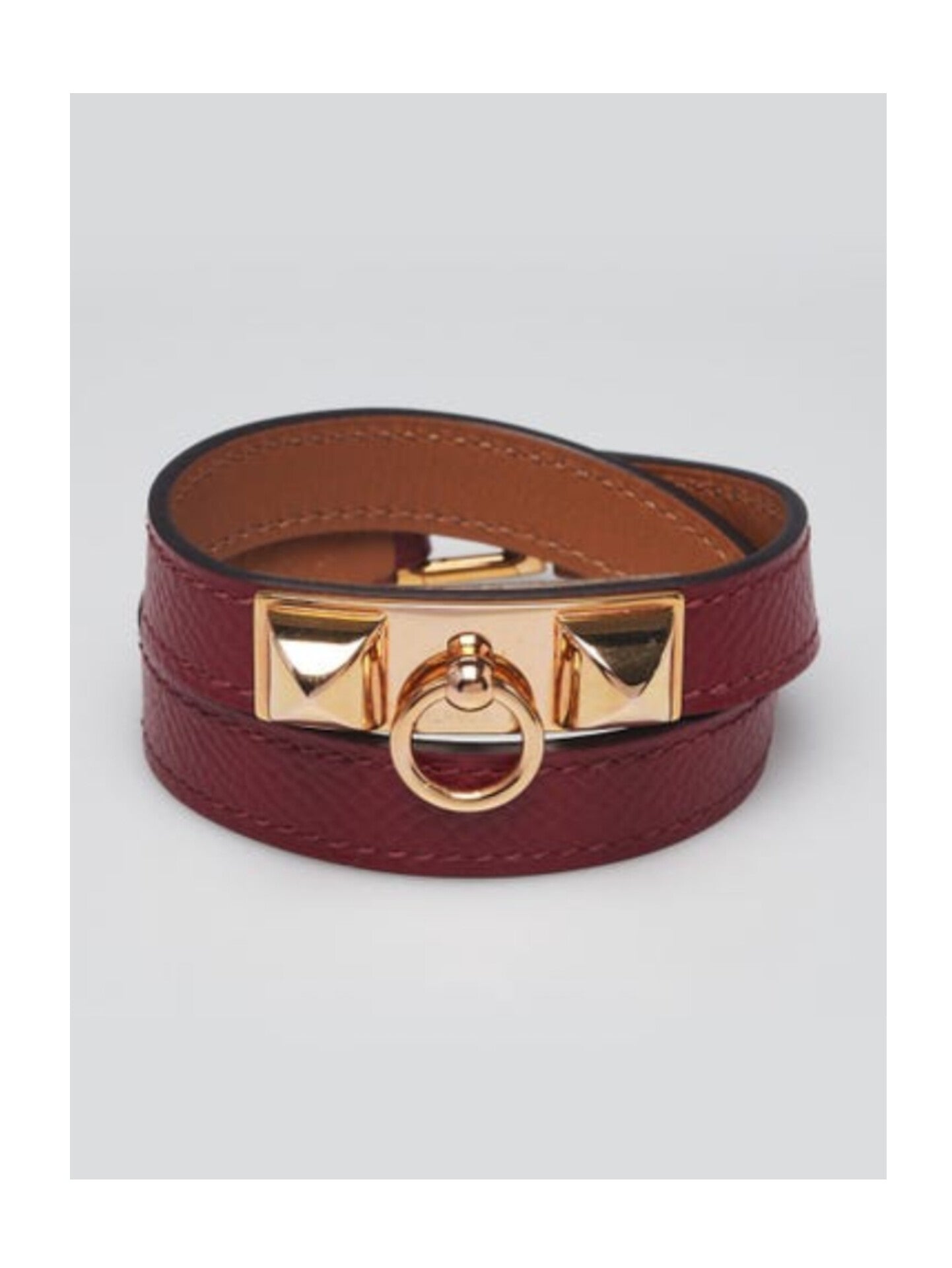 A miniature version of the incredibly popular Collier de Chien Cuff bracelet, the Rivale double tour bracelet features the same pyramid stud and ring detail as the CDC, in a much smaller package. Perfect for everyday wear, this Rivale double tour bracelet wraps around the wrist twice for flexibility. This particular bracelet is crafted of leather with stunning Gold Plated hardware. Retail price is $630.