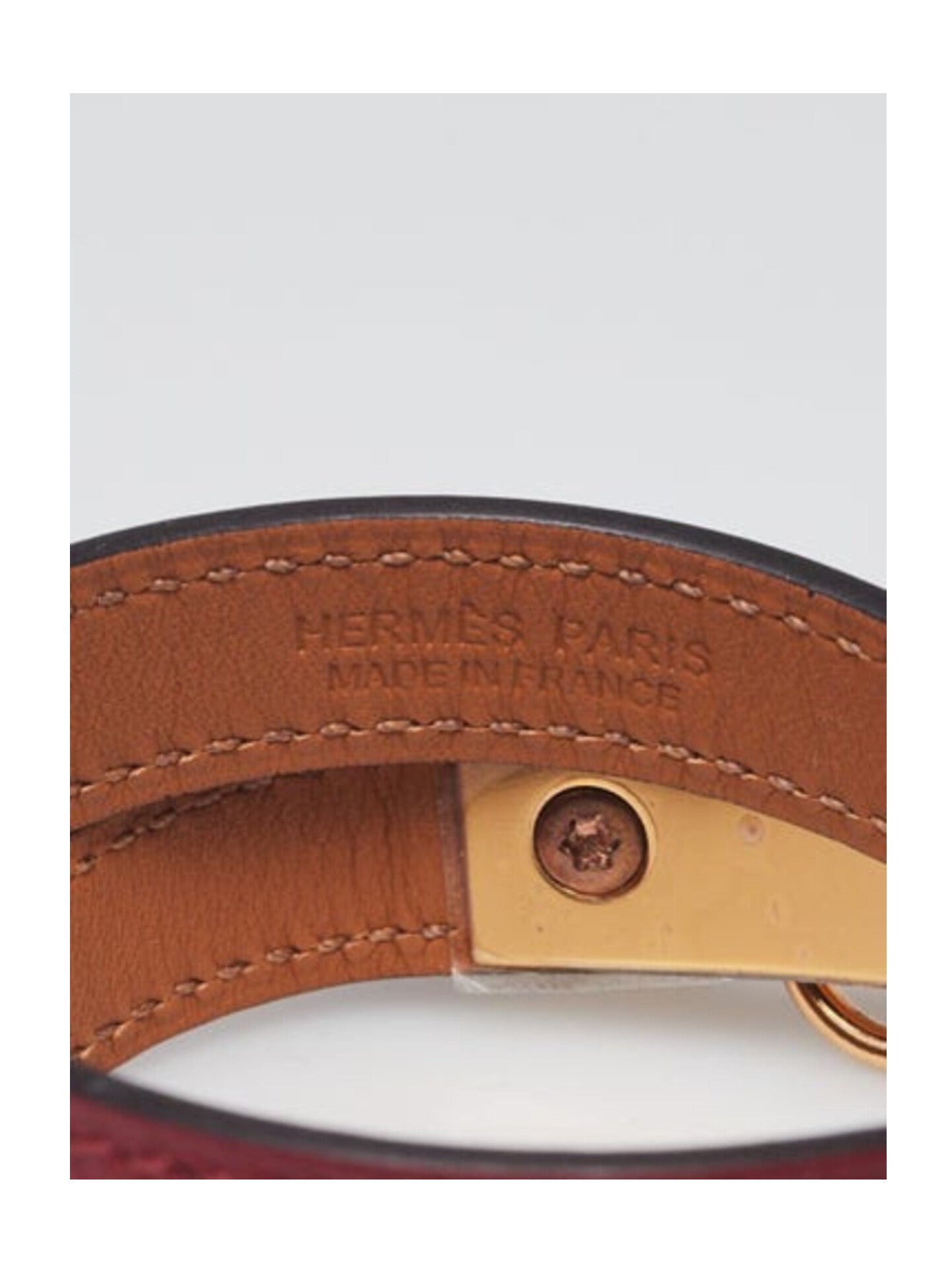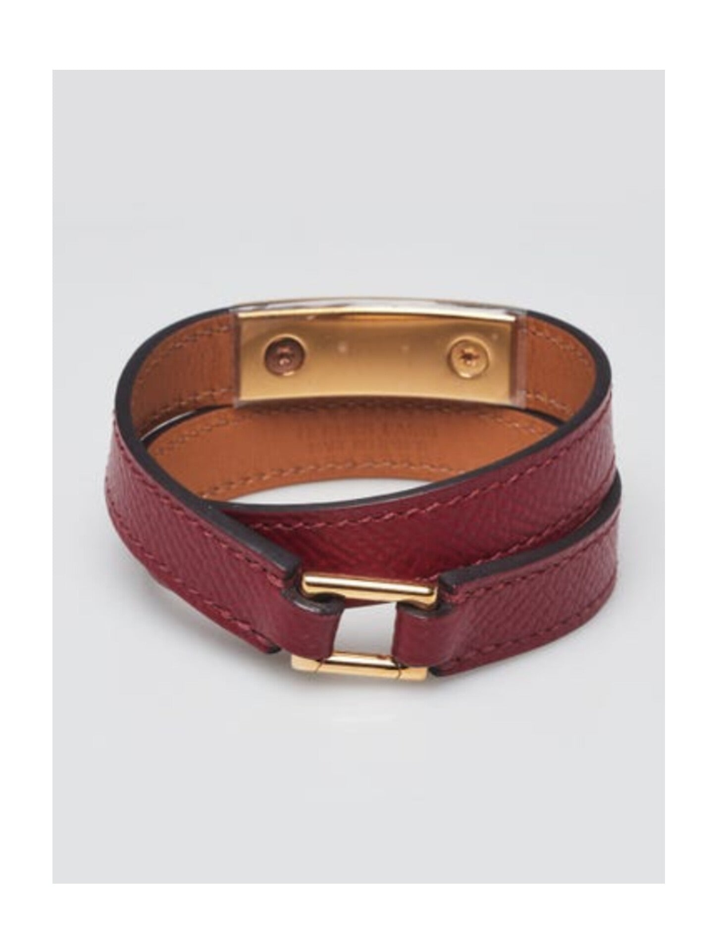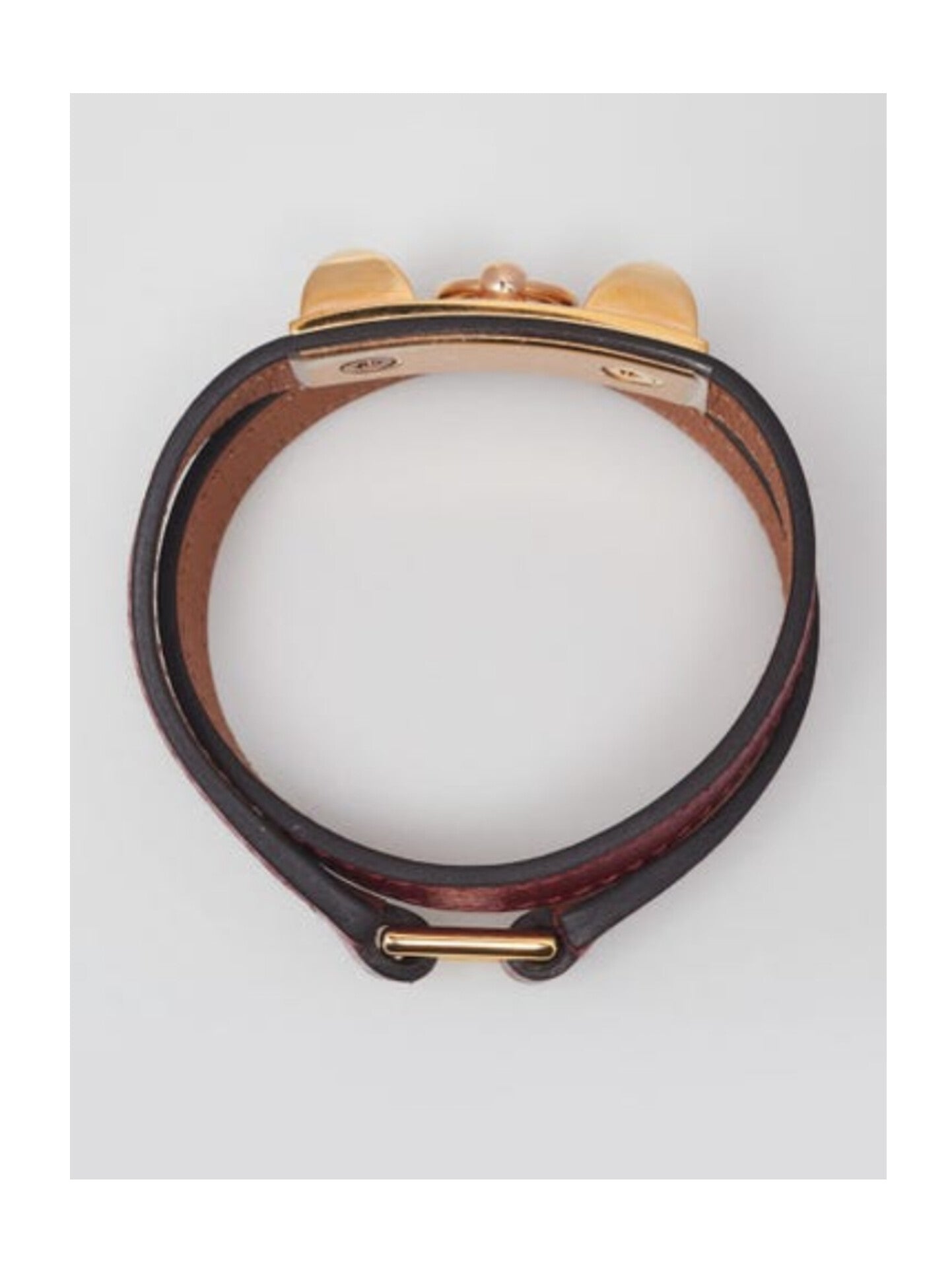 The bracelet is clean and beautiful with minor creasing and faint rubbing on the underside of the leather. The hardware is bright and shiny. Overall it is in great condition.