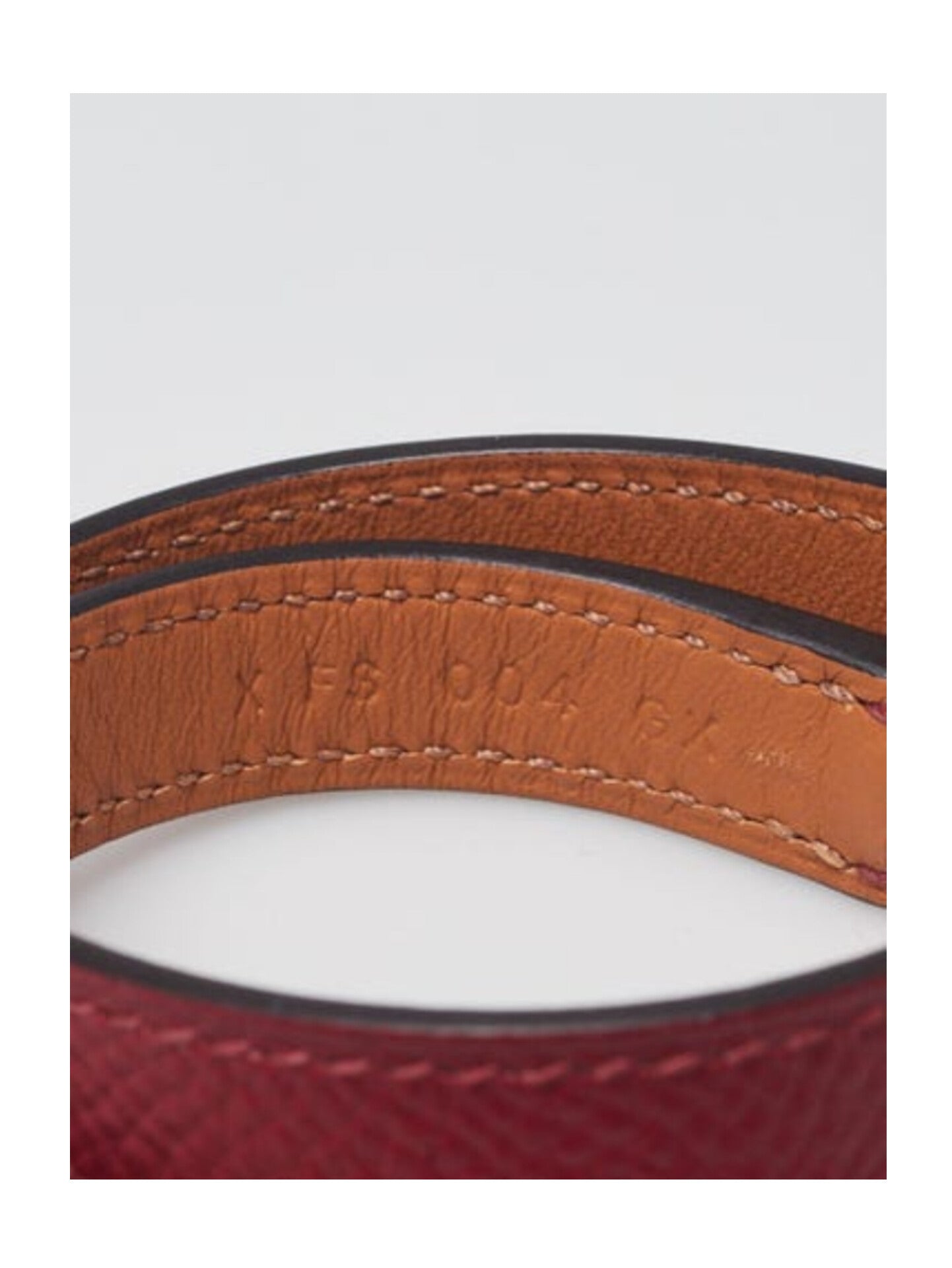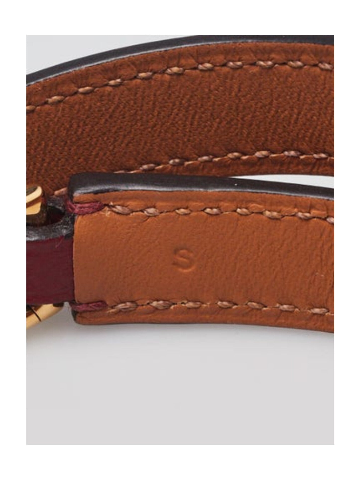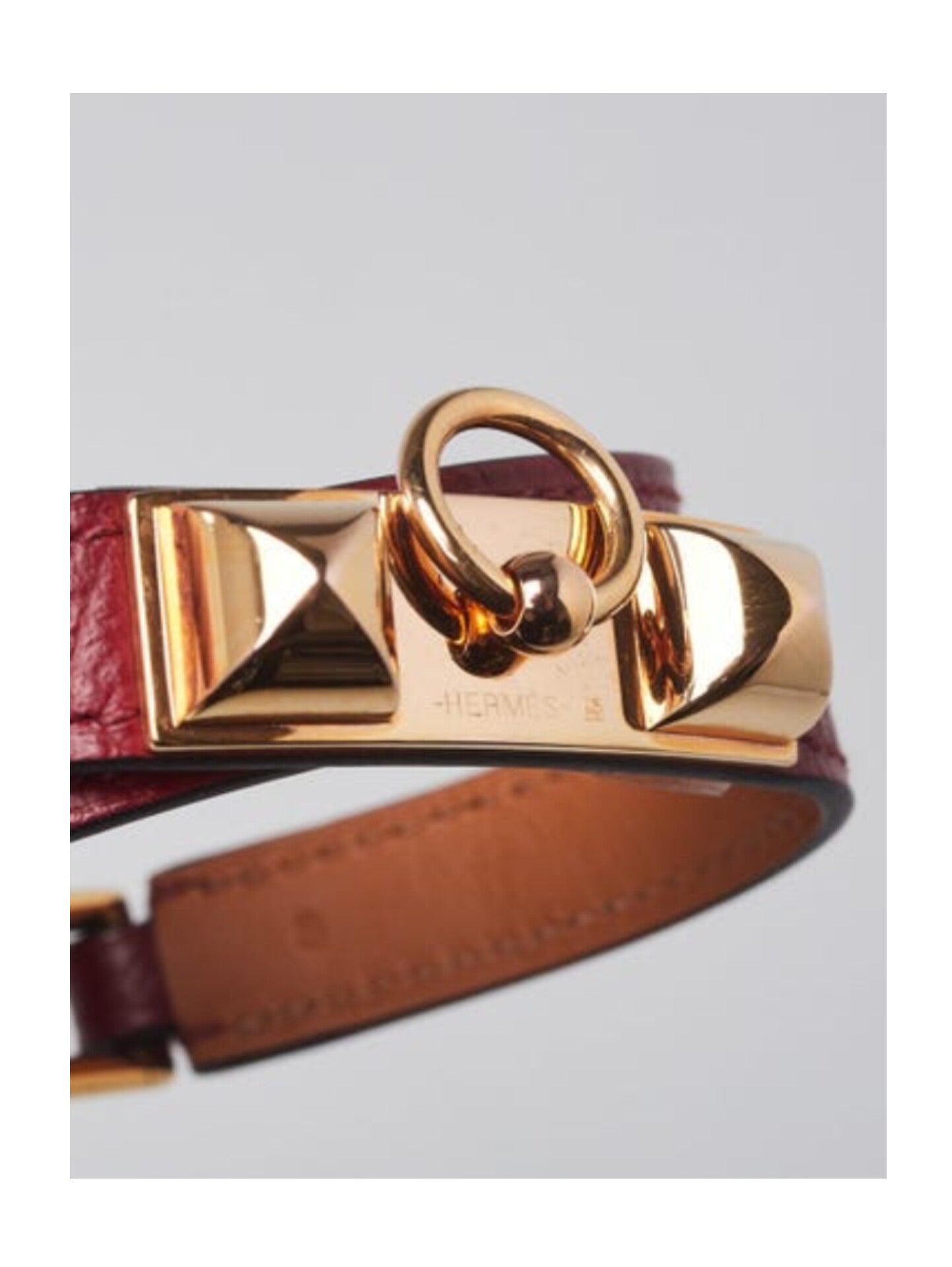 The bracelet is clean and beautiful with minor creasing and faint rubbing on the underside of the leather. The hardware is bright and shiny. Overall it is in great condition.