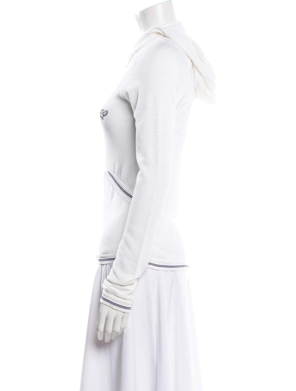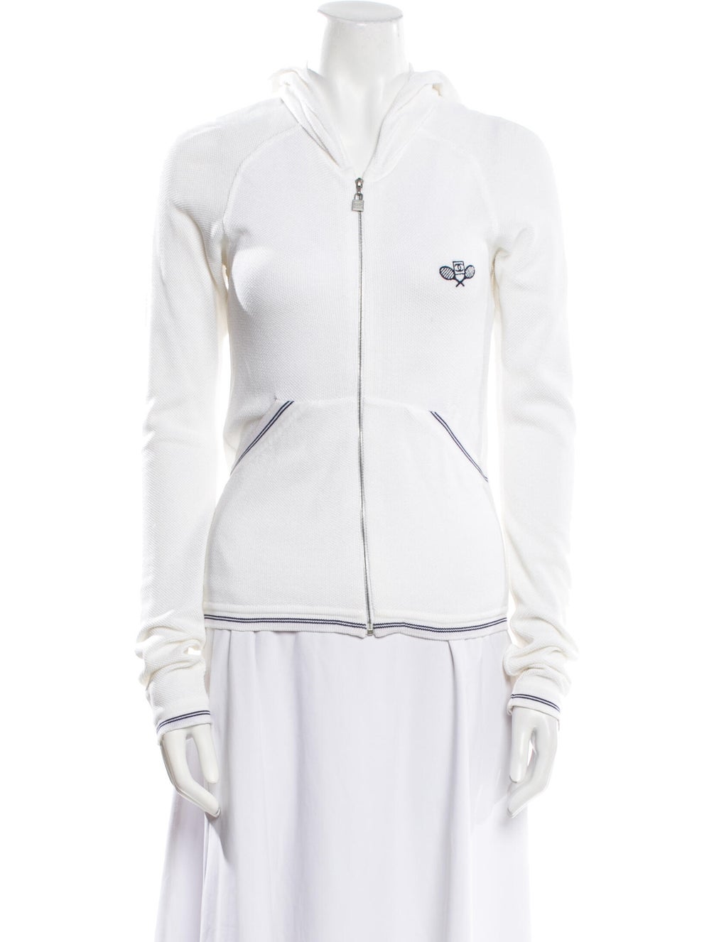 Own a piece of fashion history with this authentic Chanel Hooded Sweater from the Spring/Summer 2005 Collection. Crafted with vintage details, including an embroidered Interlocking CC logo and exposed zip closure, this white cardigan adds a touch of sporty elegance to any outfit. As seen on the runway by Karl Lagerfeld. Size S US4.