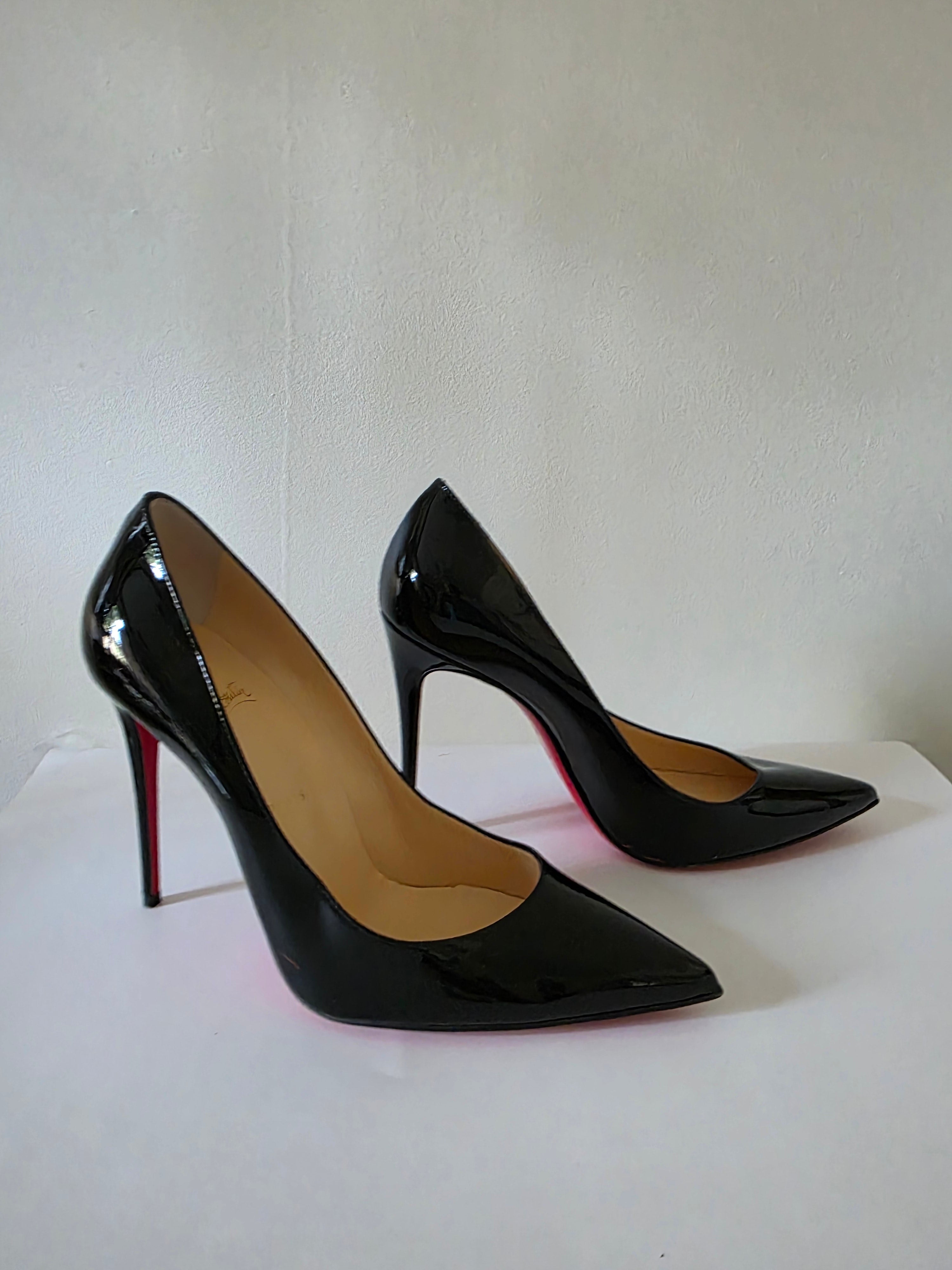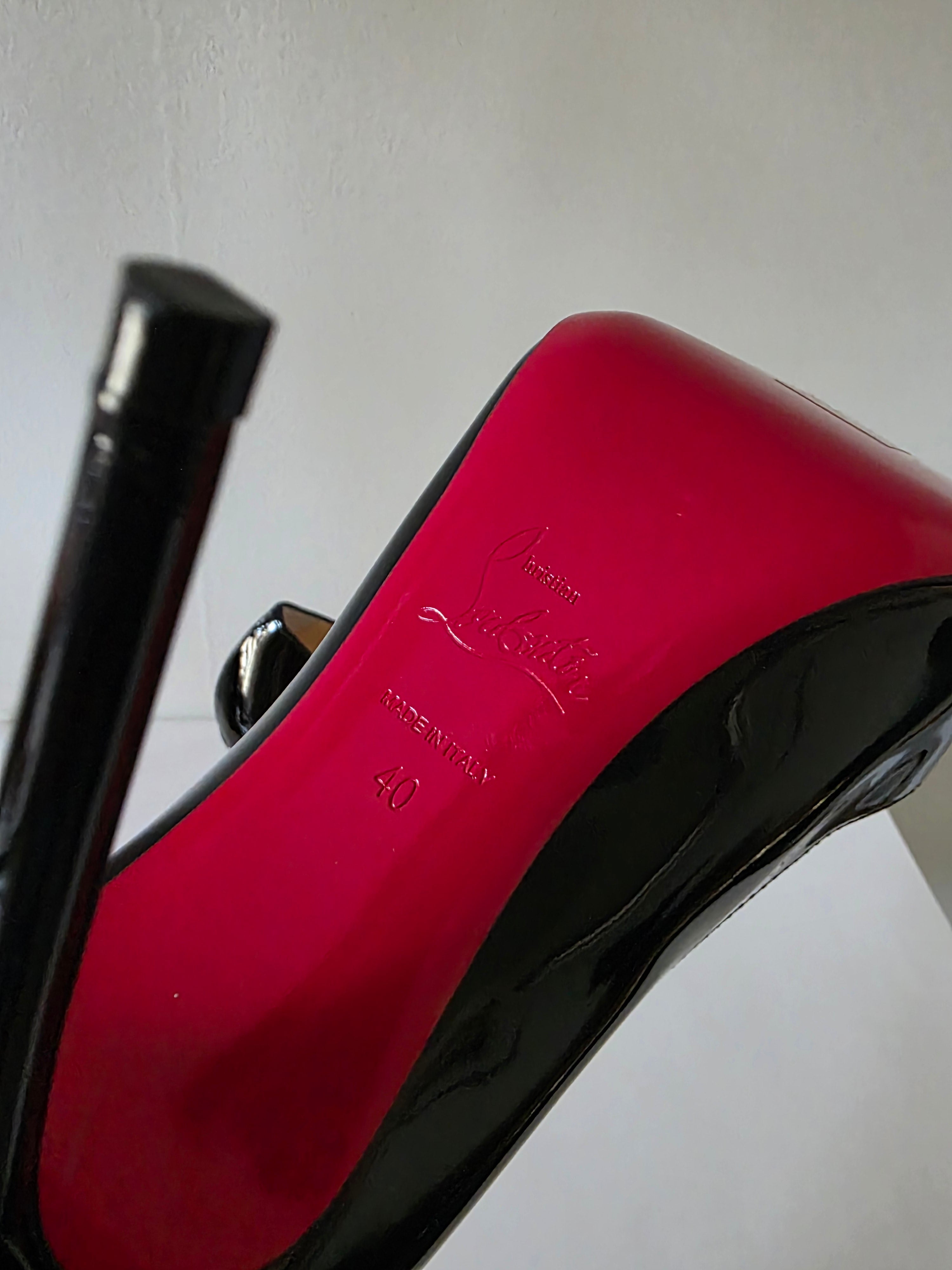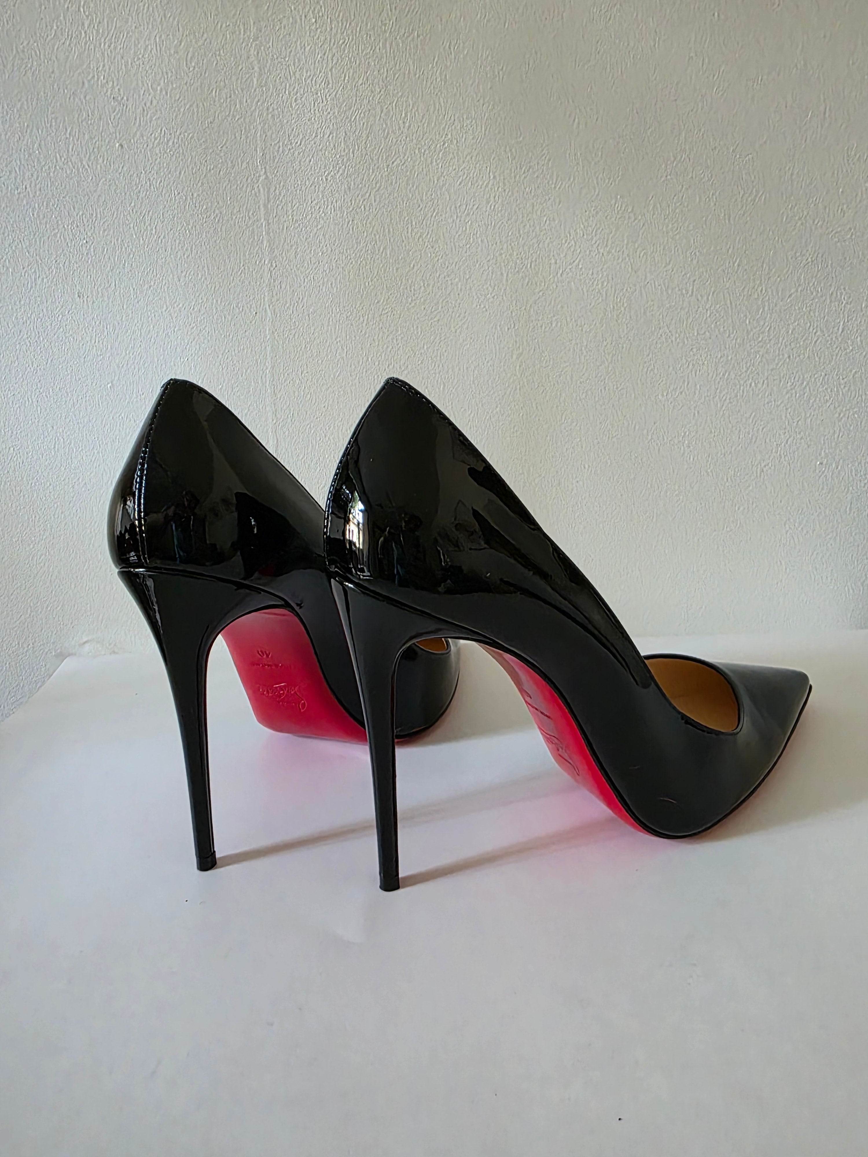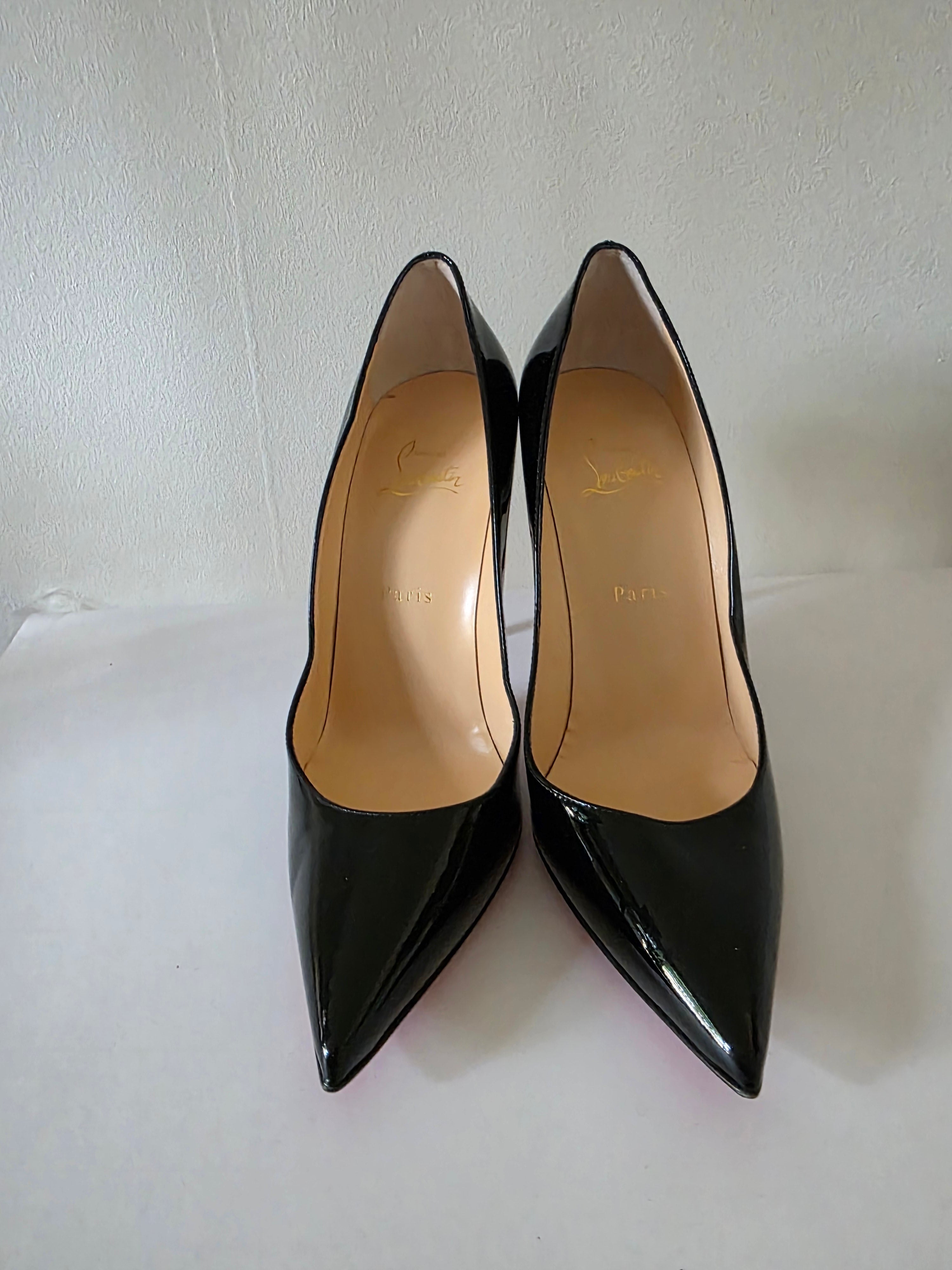 The Christian Louboutin Black Patent Leather Pumps in size 40 feature a sleek, pointed-toe design crafted from high-quality patent leather. The glossy finish enhances durability while ensuring a sophisticated appearance. Ideal for formal occasions, these pumps provide both elegance and comfort, making them a valuable addition to any wardrobe.