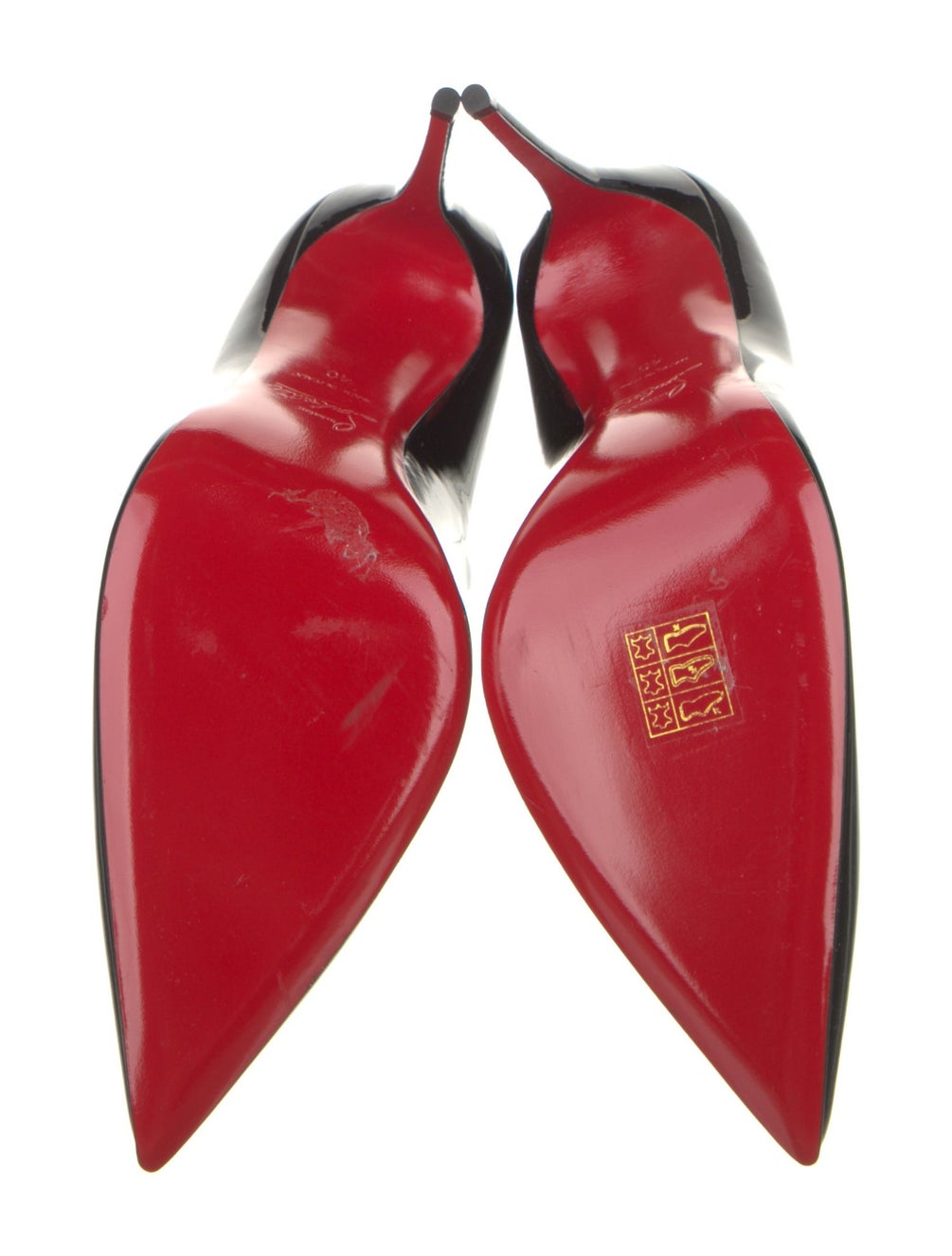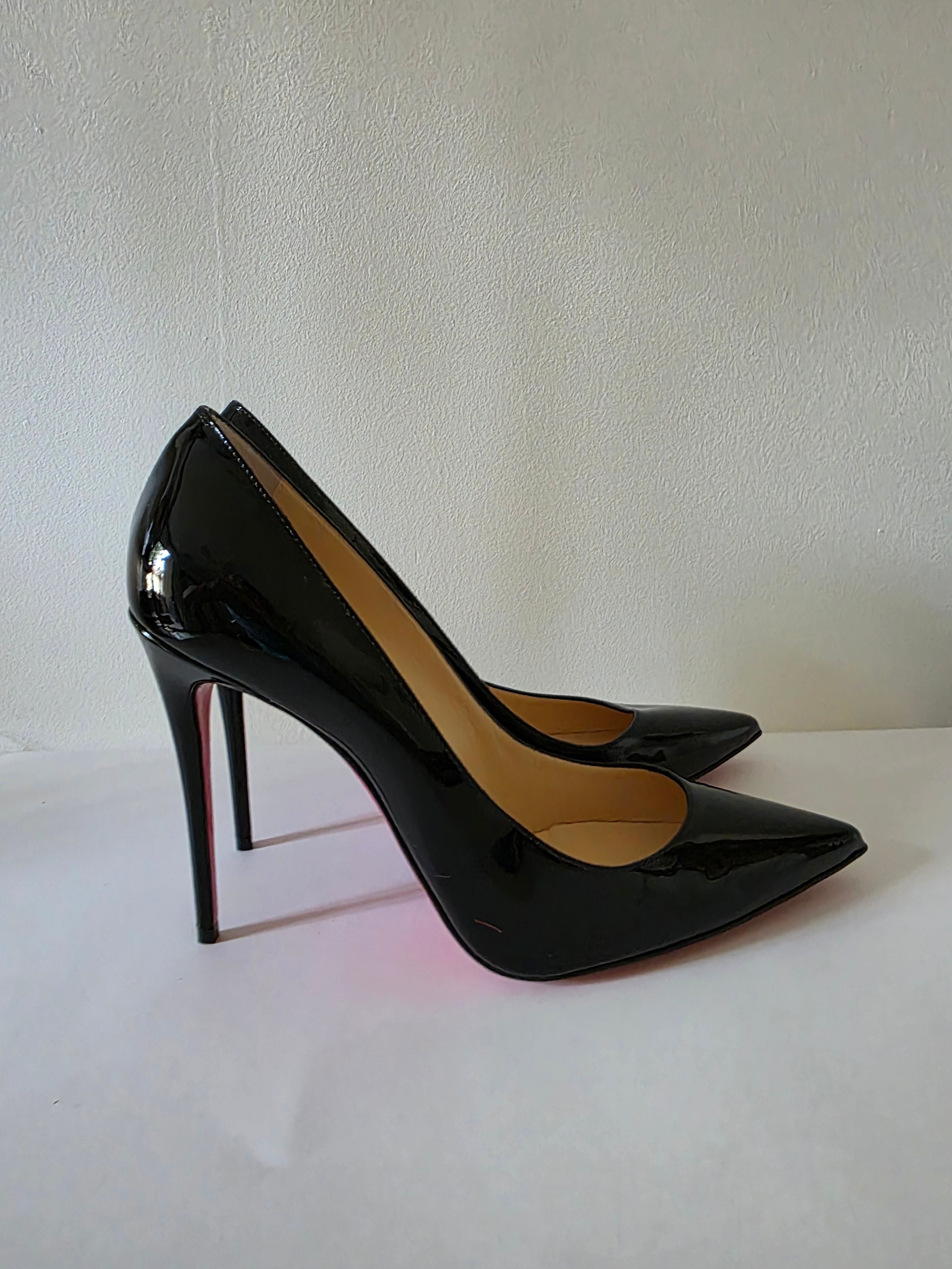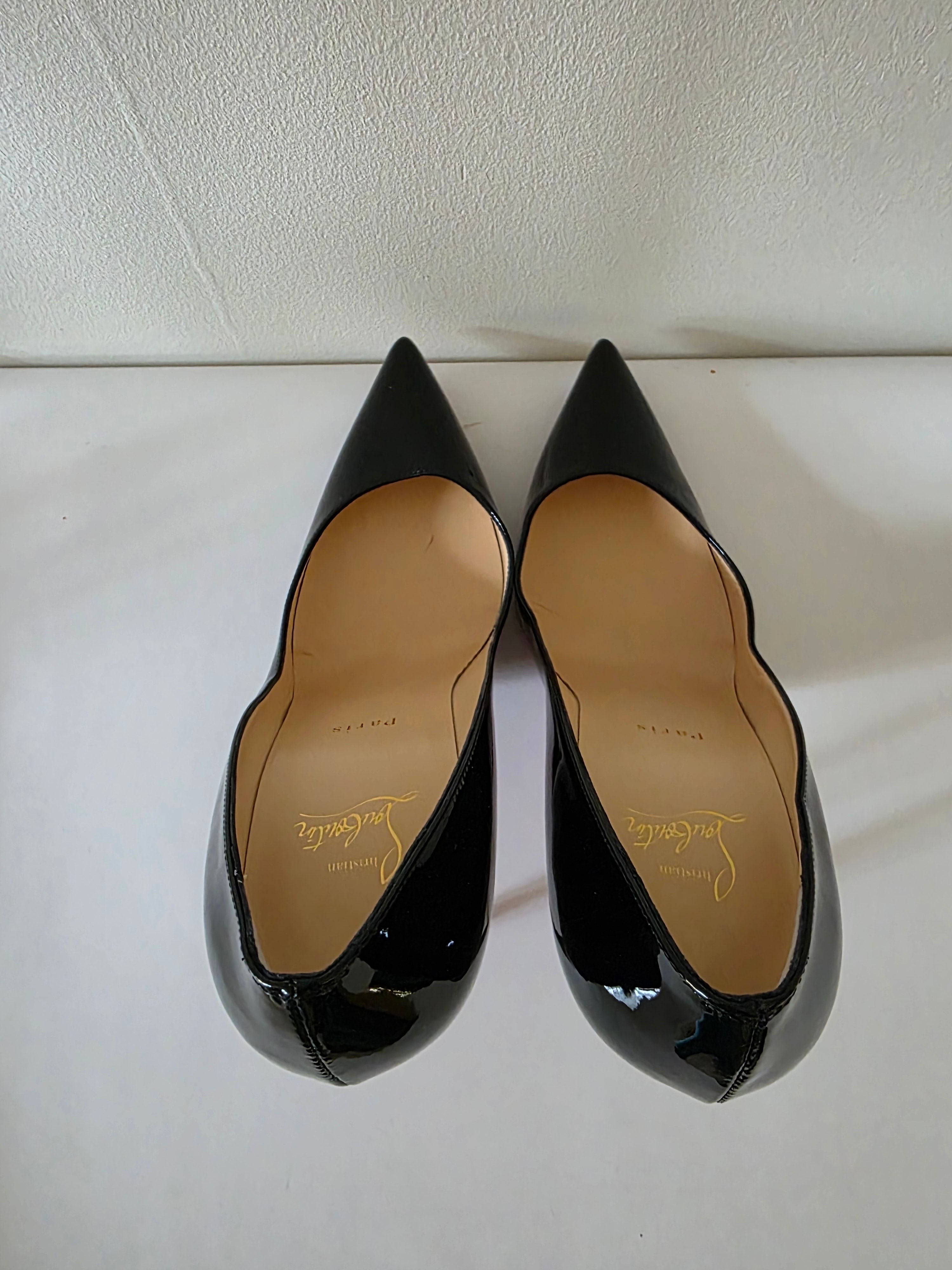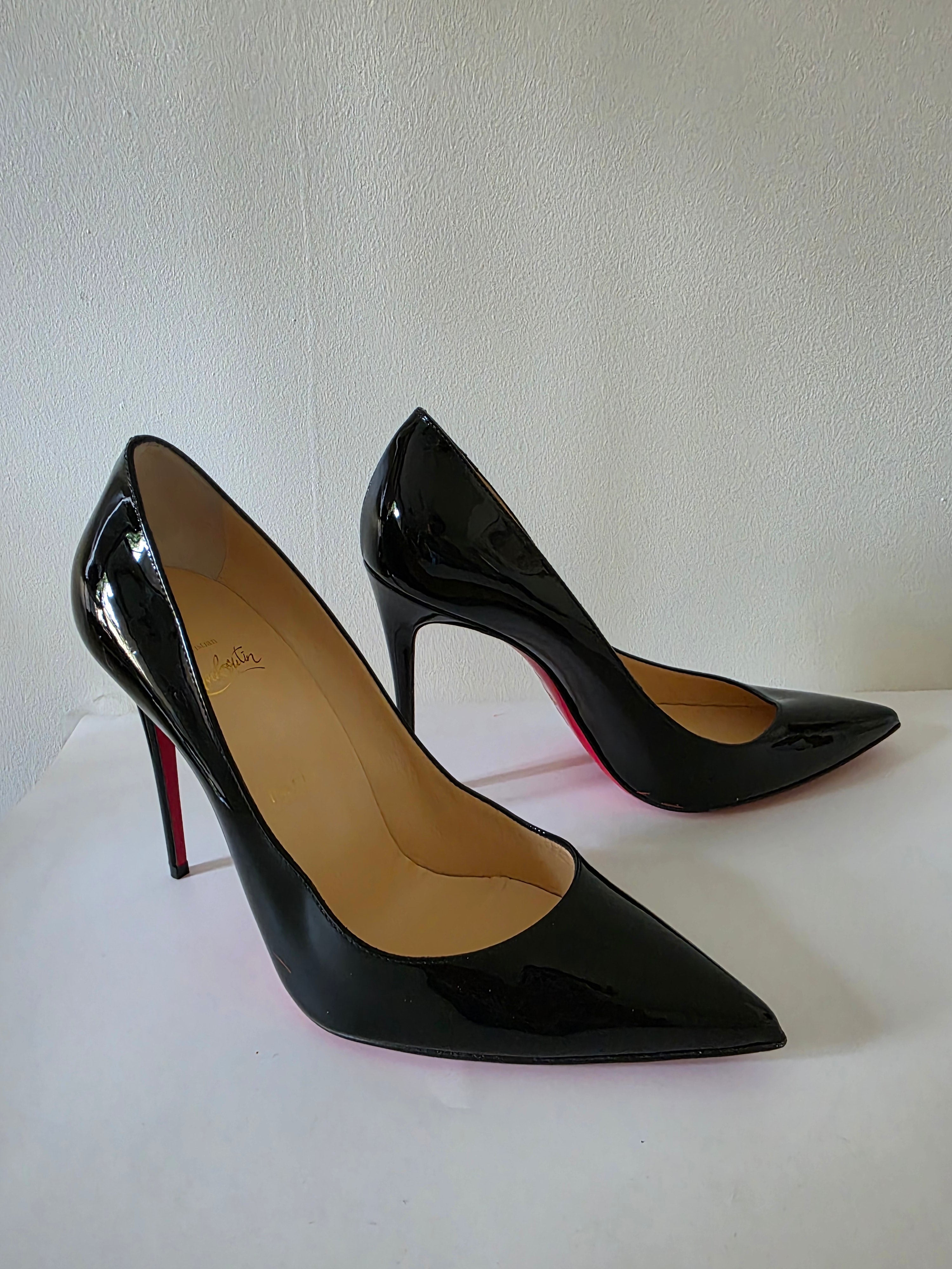 The Christian Louboutin Black Patent Leather Pumps in size 40 feature a sleek, pointed-toe design crafted from high-quality patent leather. The glossy finish enhances durability while ensuring a sophisticated appearance. Ideal for formal occasions, these pumps provide both elegance and comfort, making them a valuable addition to any wardrobe.