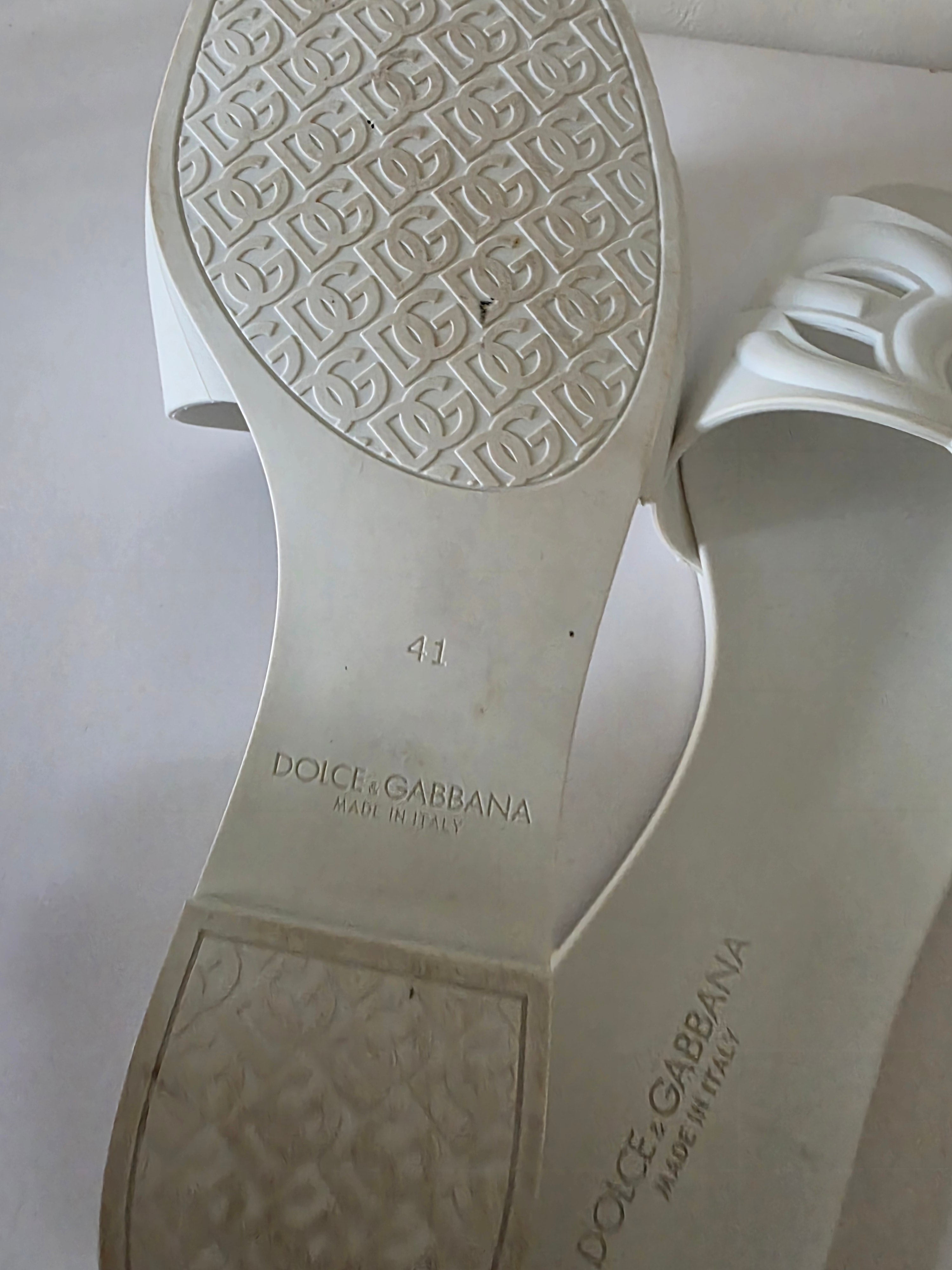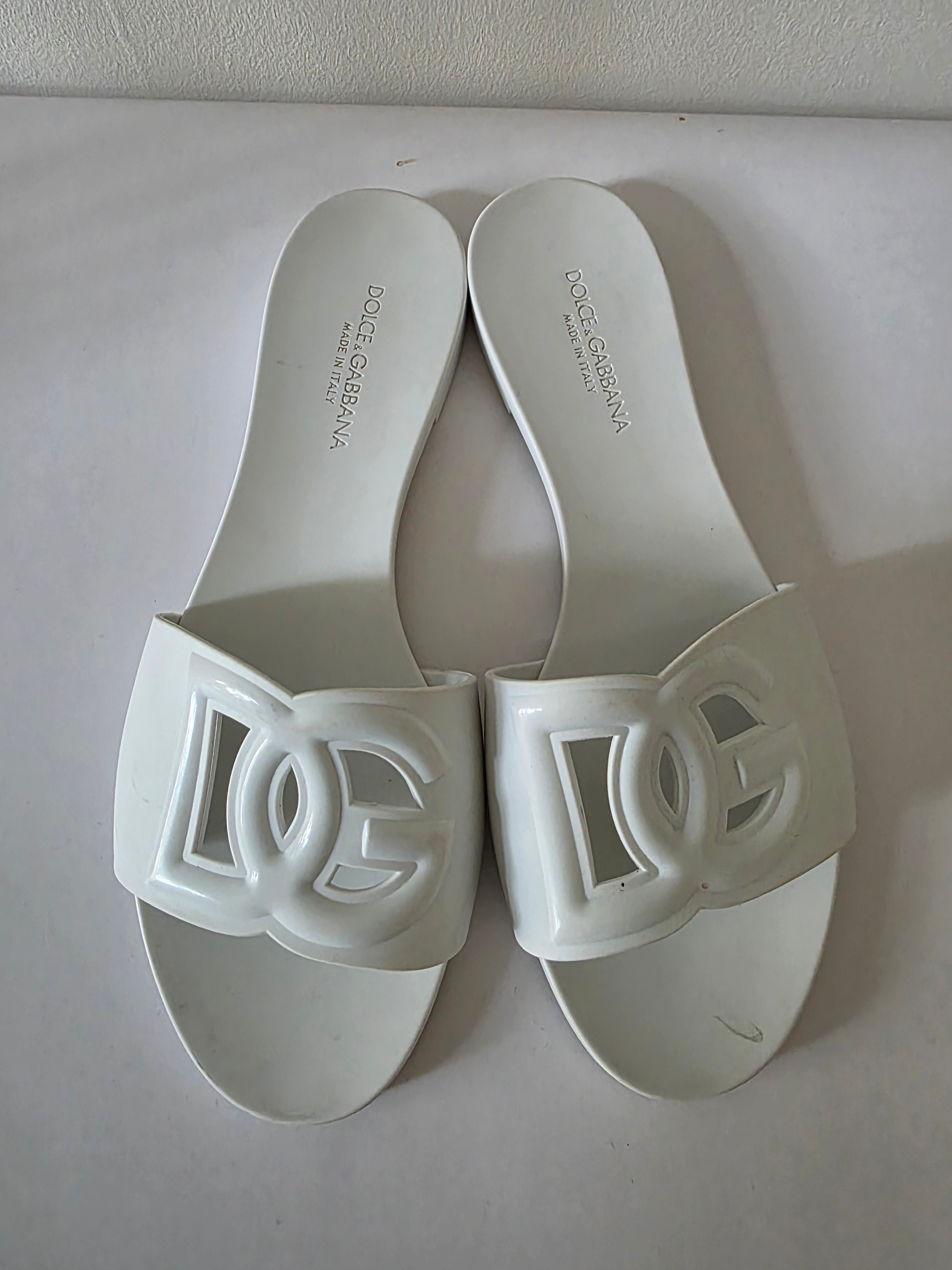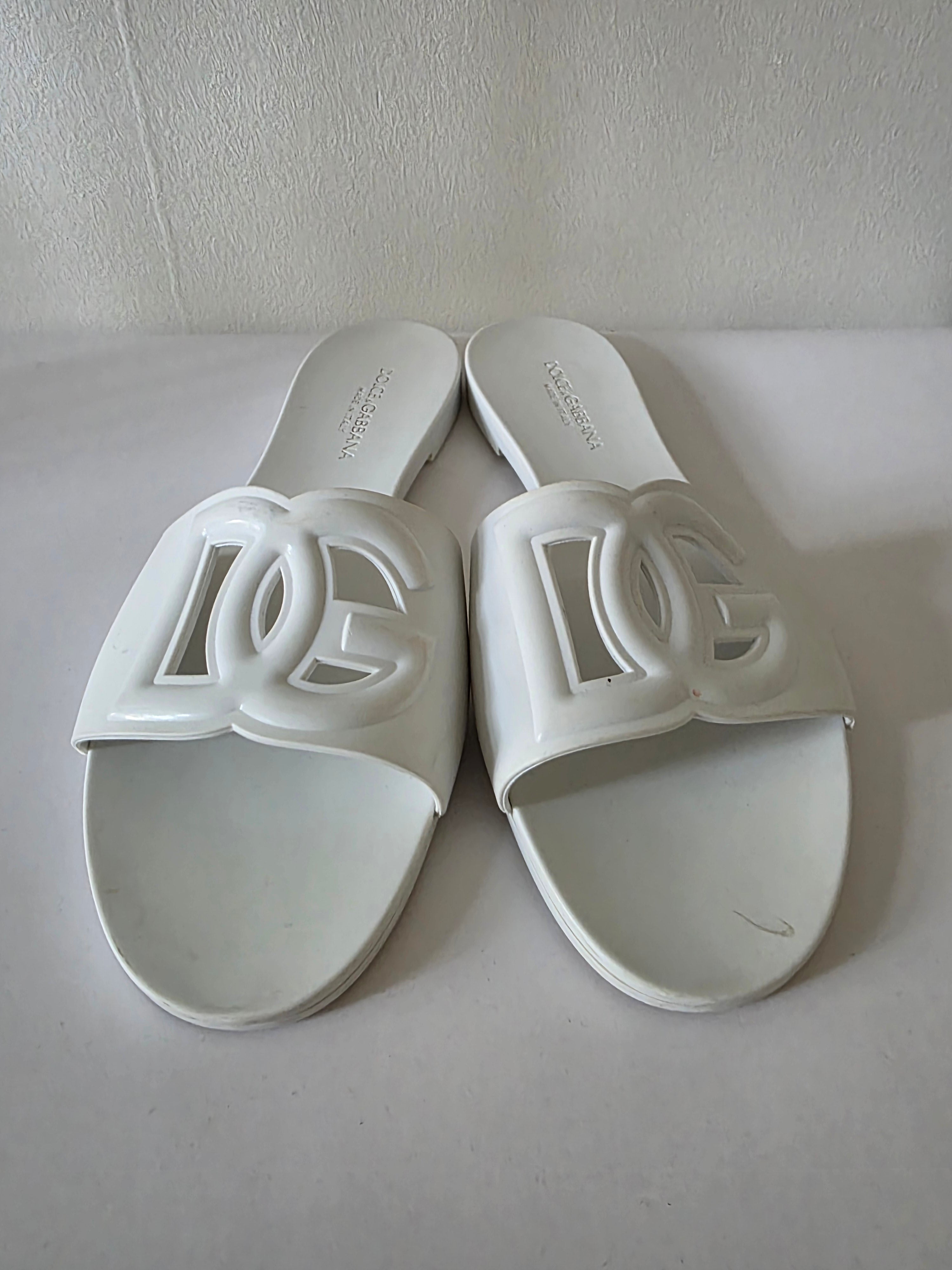 The Dolce & Gabbana White DG Logo Rubber Slides (size 41) feature a durable rubber construction and a secure buckle closure at the uppers. These slides offer comfort and stability, making them suitable for casual wear. The white design enhances versatility, allowing for easy coordination with various outfits.