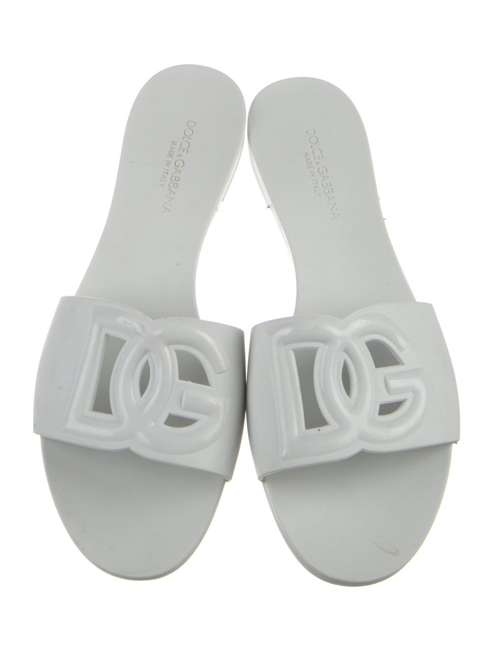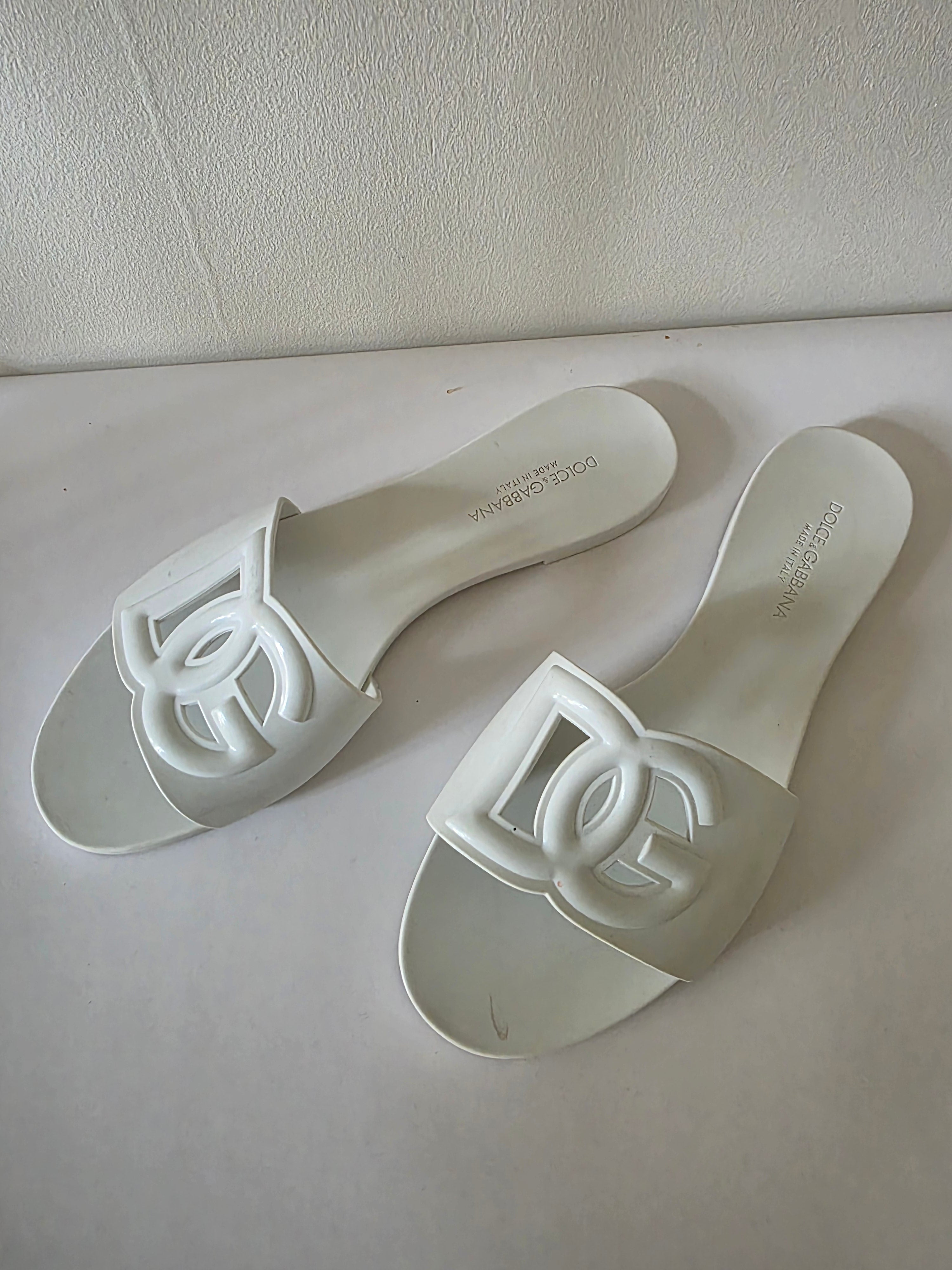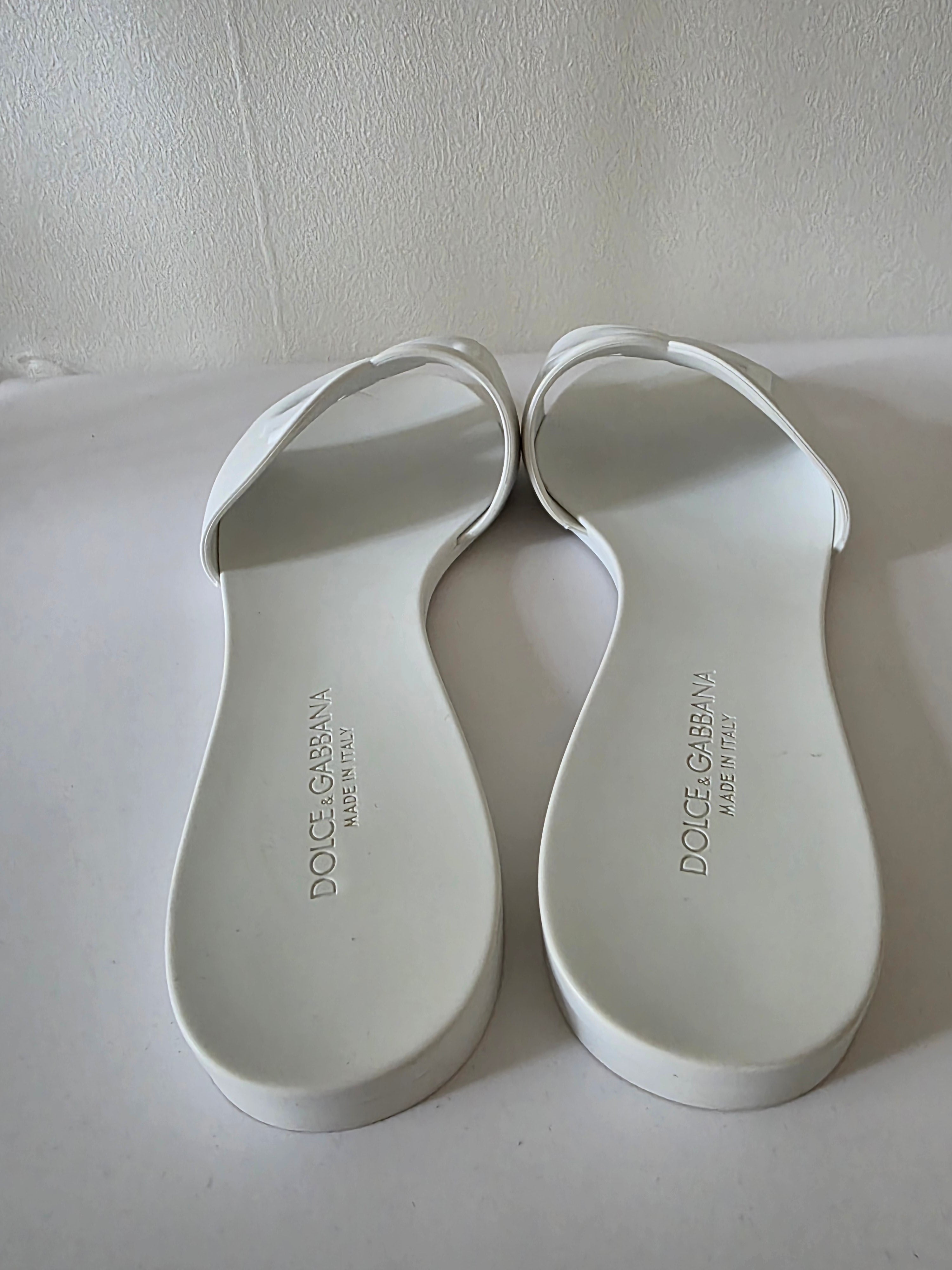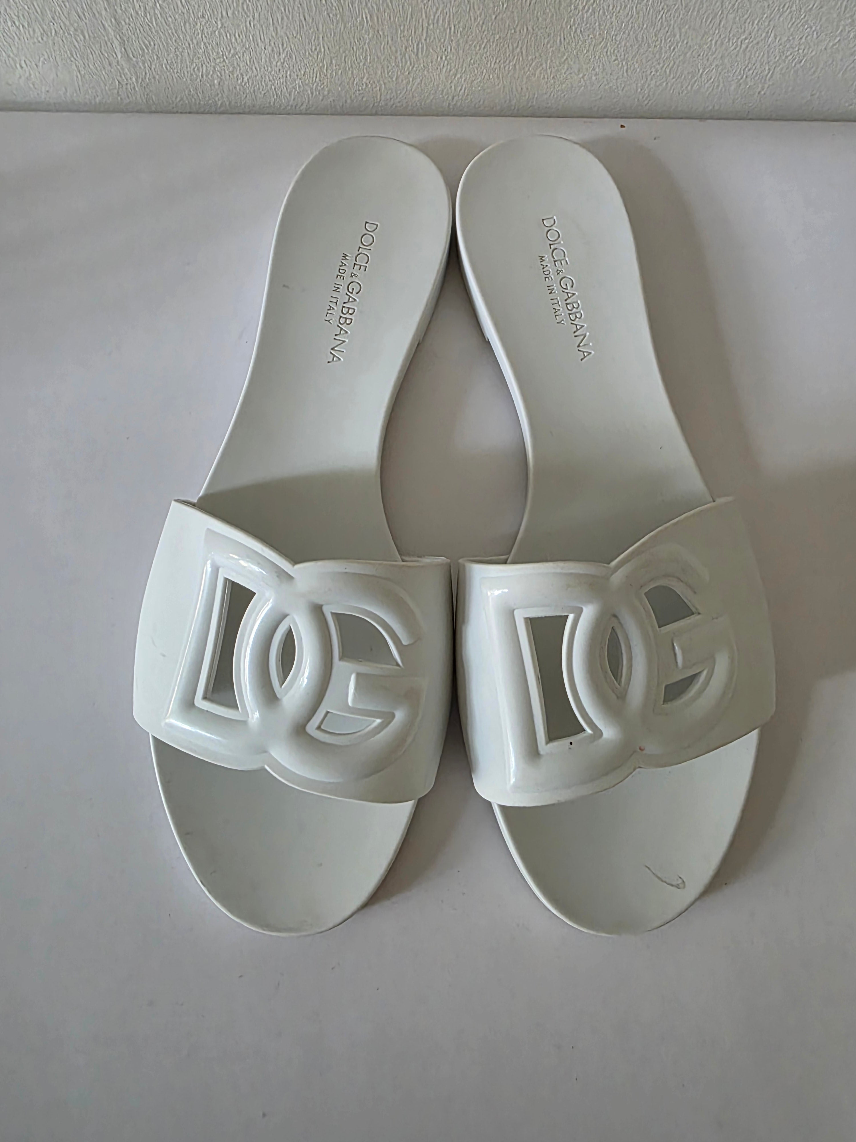 The Dolce & Gabbana White DG Logo Rubber Slides (size 41) feature a durable rubber construction and a secure buckle closure at the uppers. These slides offer comfort and stability, making them suitable for casual wear. The white design enhances versatility, allowing for easy coordination with various outfits.