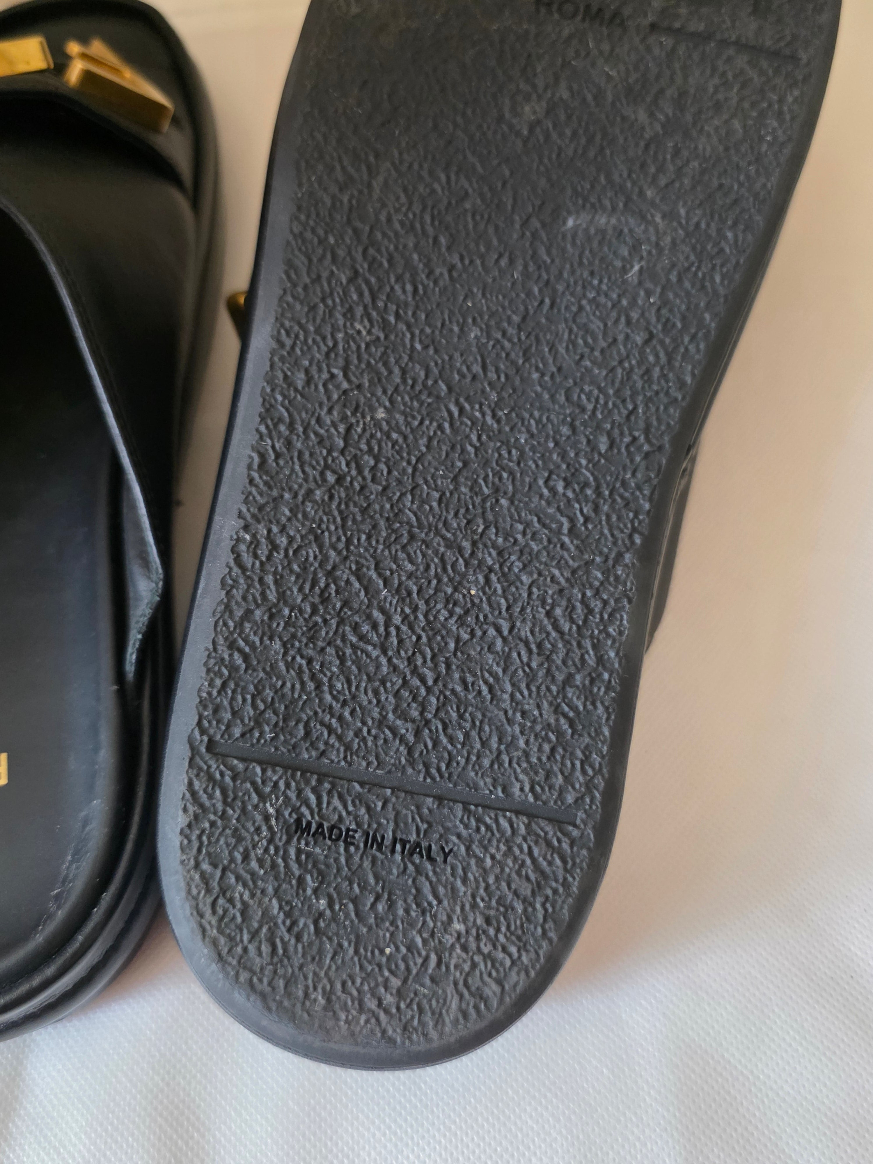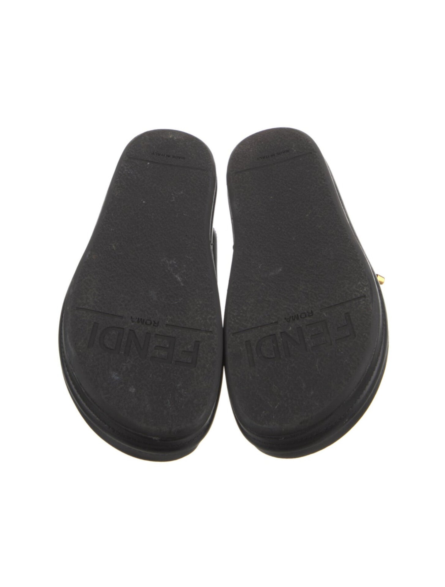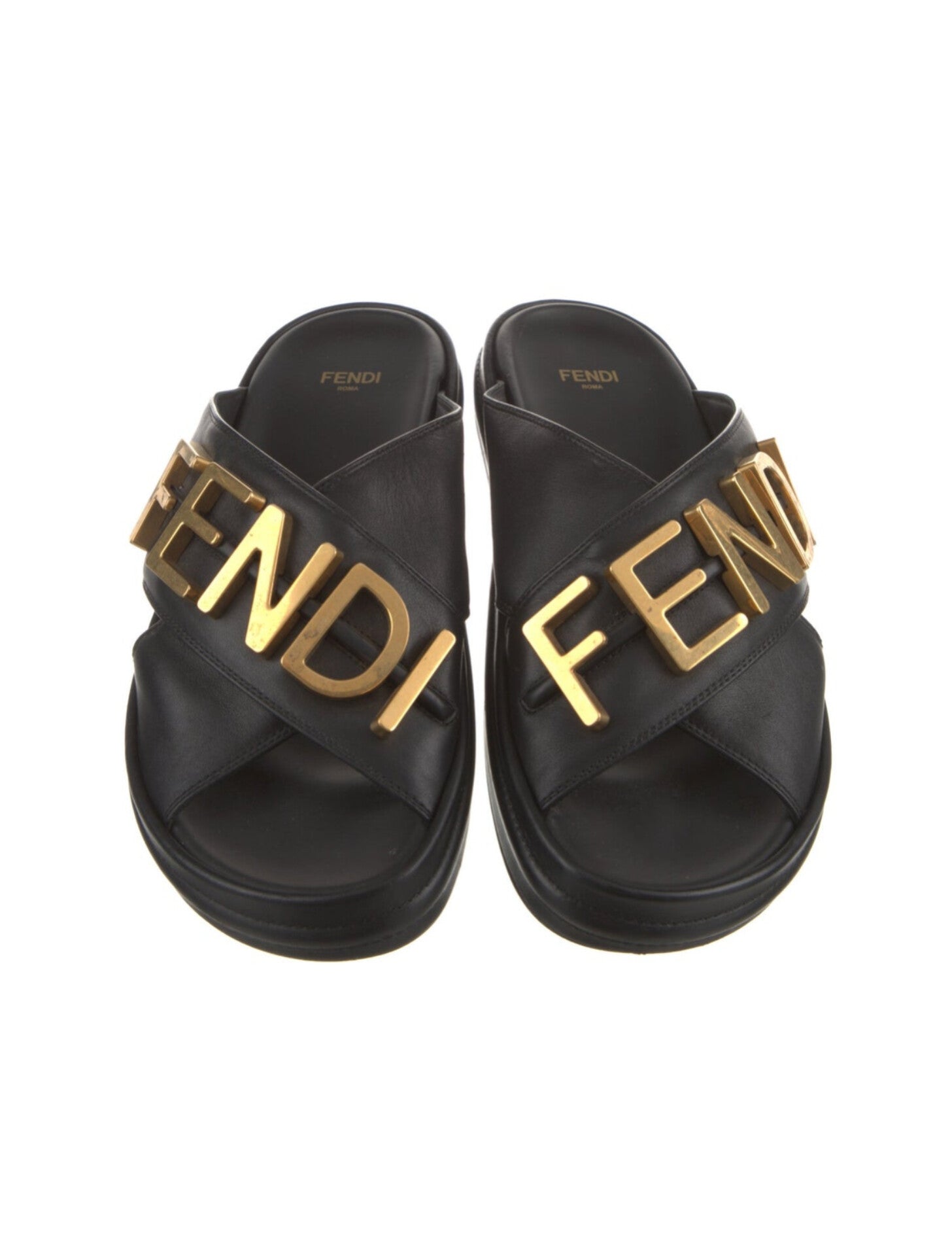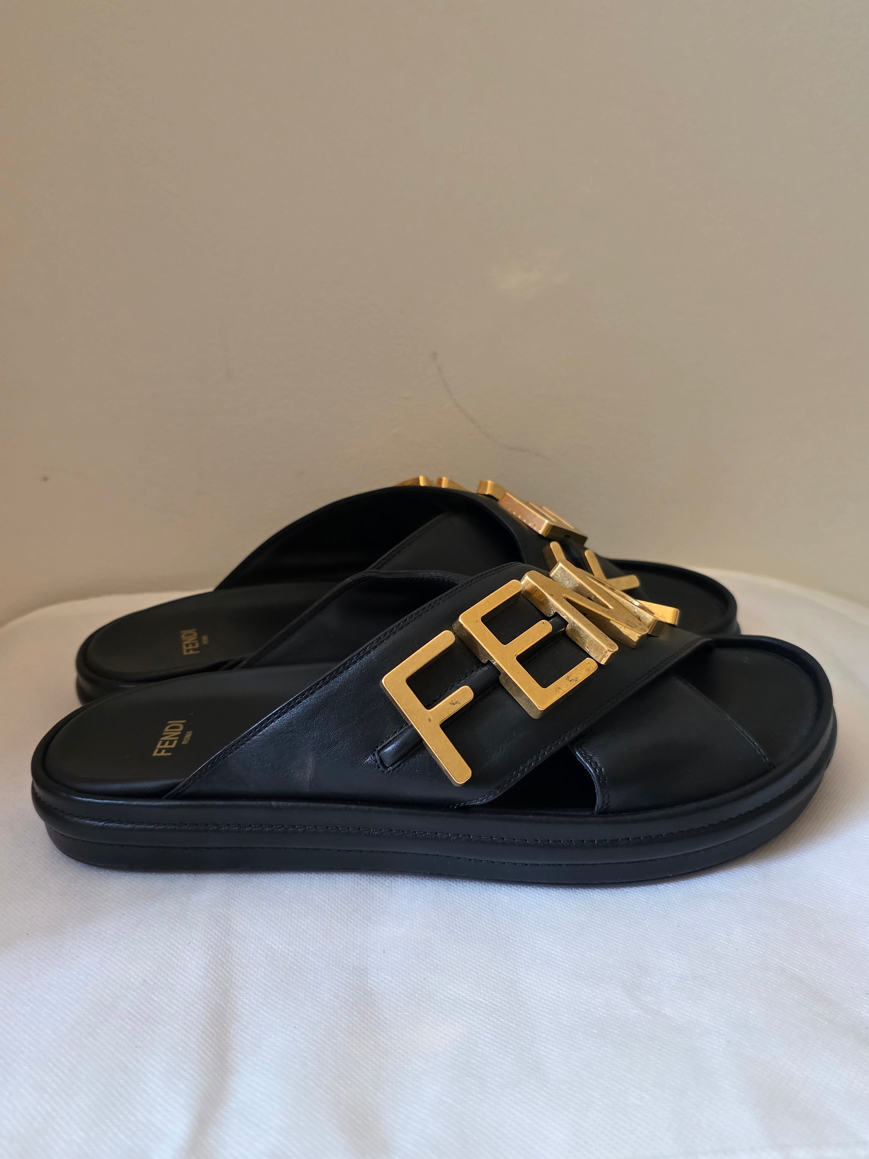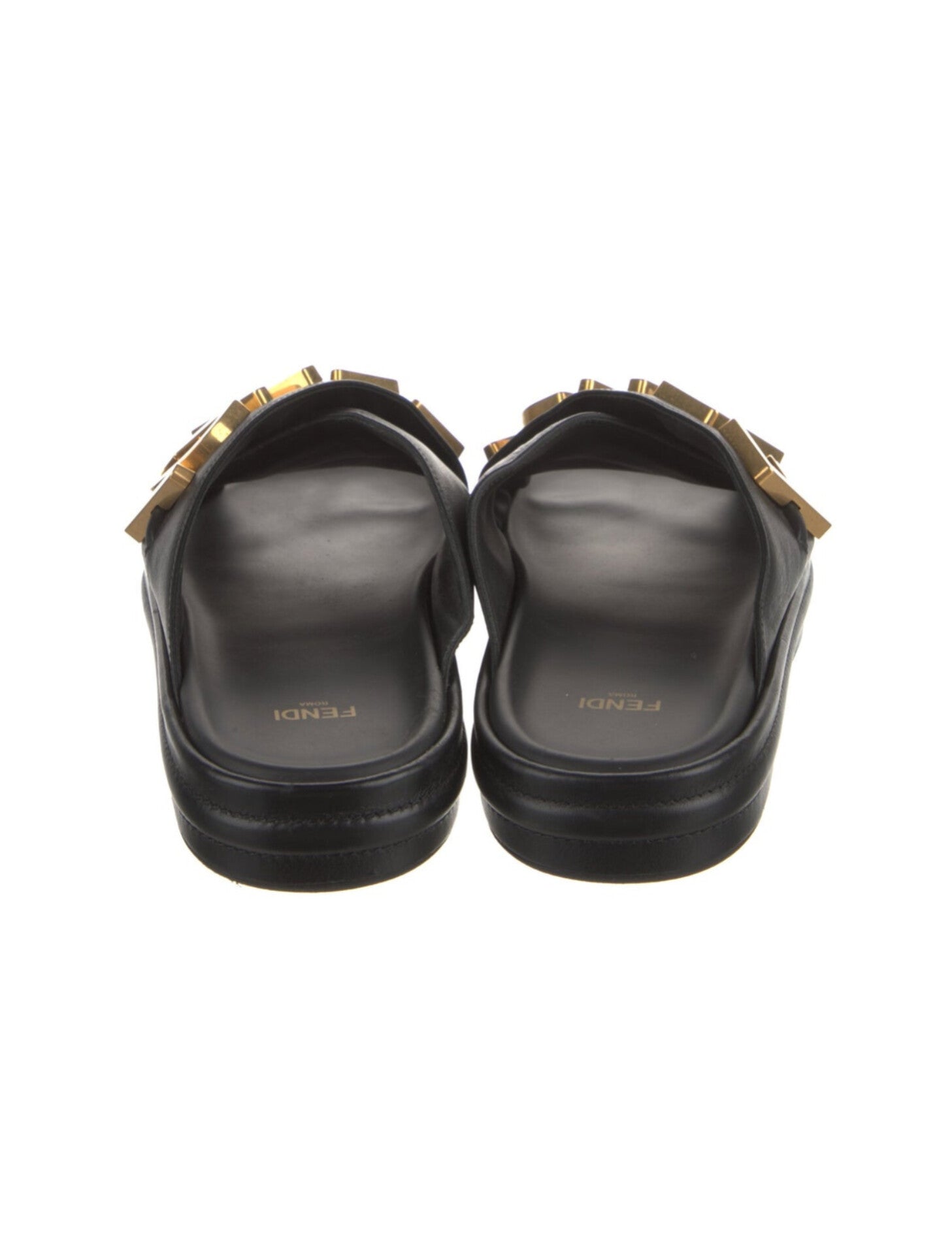 Introducing the Fendi Black Leather Gold-Tone Logos Slides, size 38.5. Crafted with superior quality leather and adorned with gold-tone logos, these slides exude luxury and style. Perfect for any occasion, add a touch of sophistication to your wardrobe with these timeless slides.