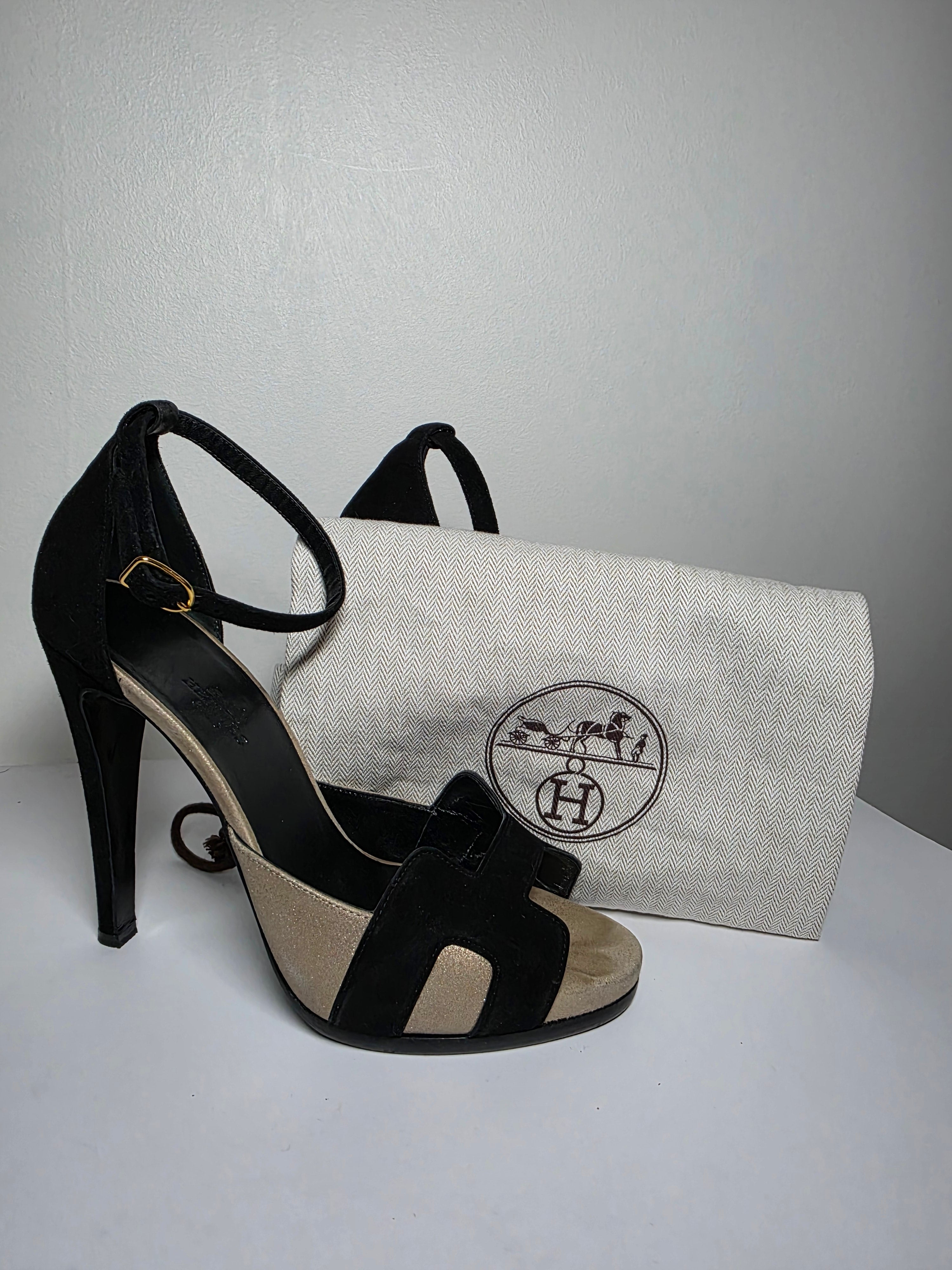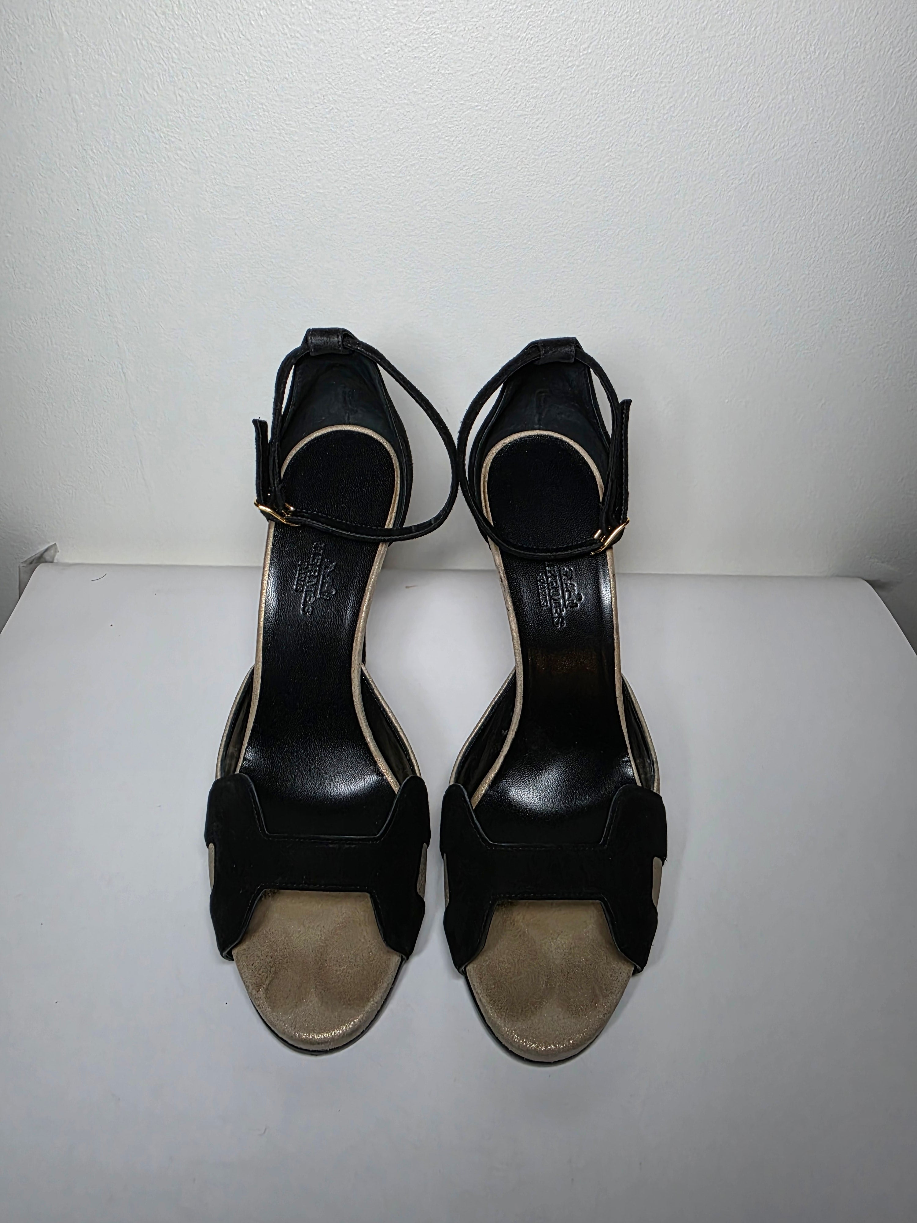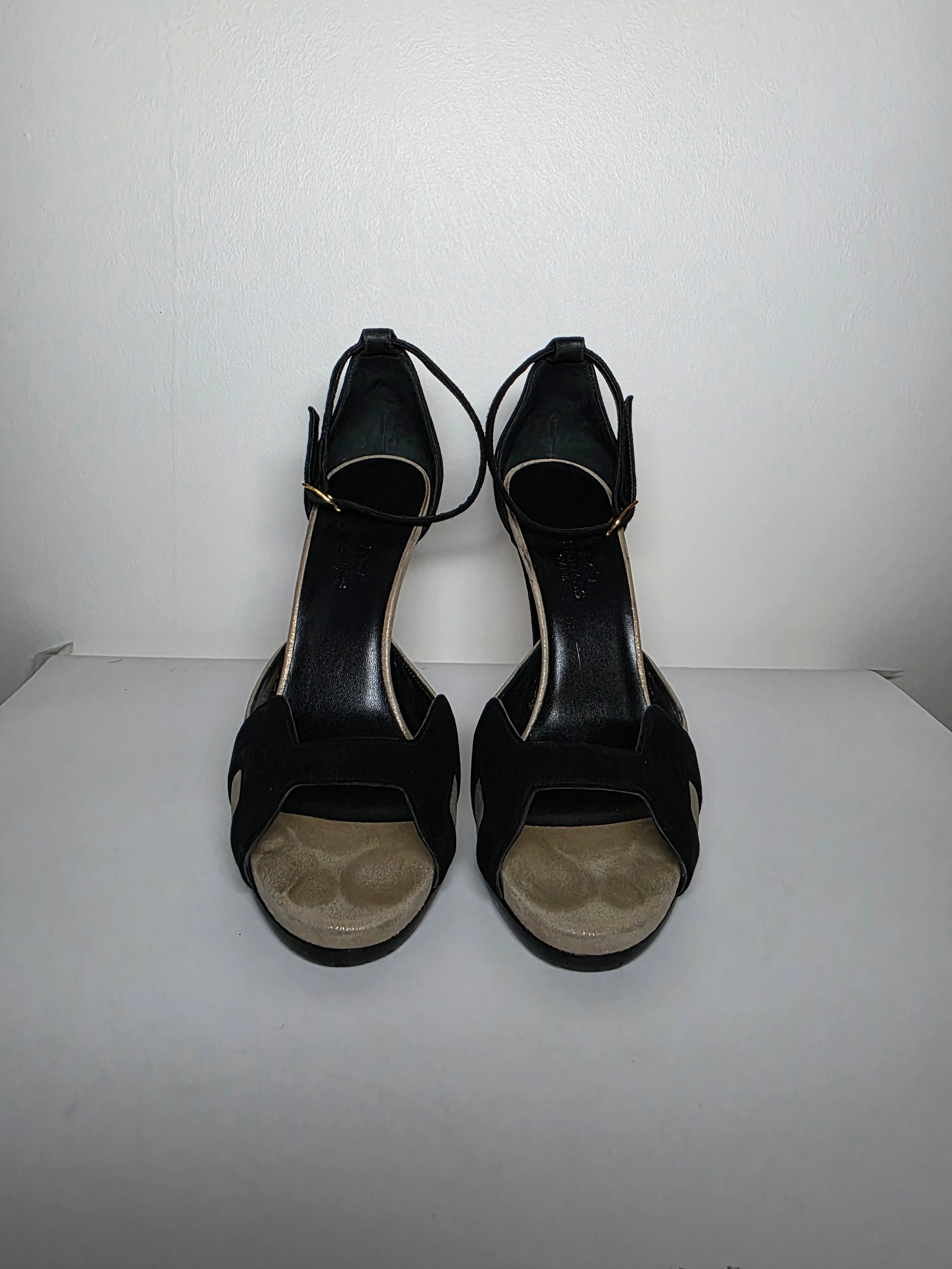 The Hermès Beige Black Premiere H Logo D'Orsay Pumps feature black suede construction and an H logo design, combining elegance with contemporary style. With a round-toe shape and platform design, these pumps provide enhanced comfort, while the wrap-around straps and buckle closure ensure a secure fit, making them suitable for various occasions.