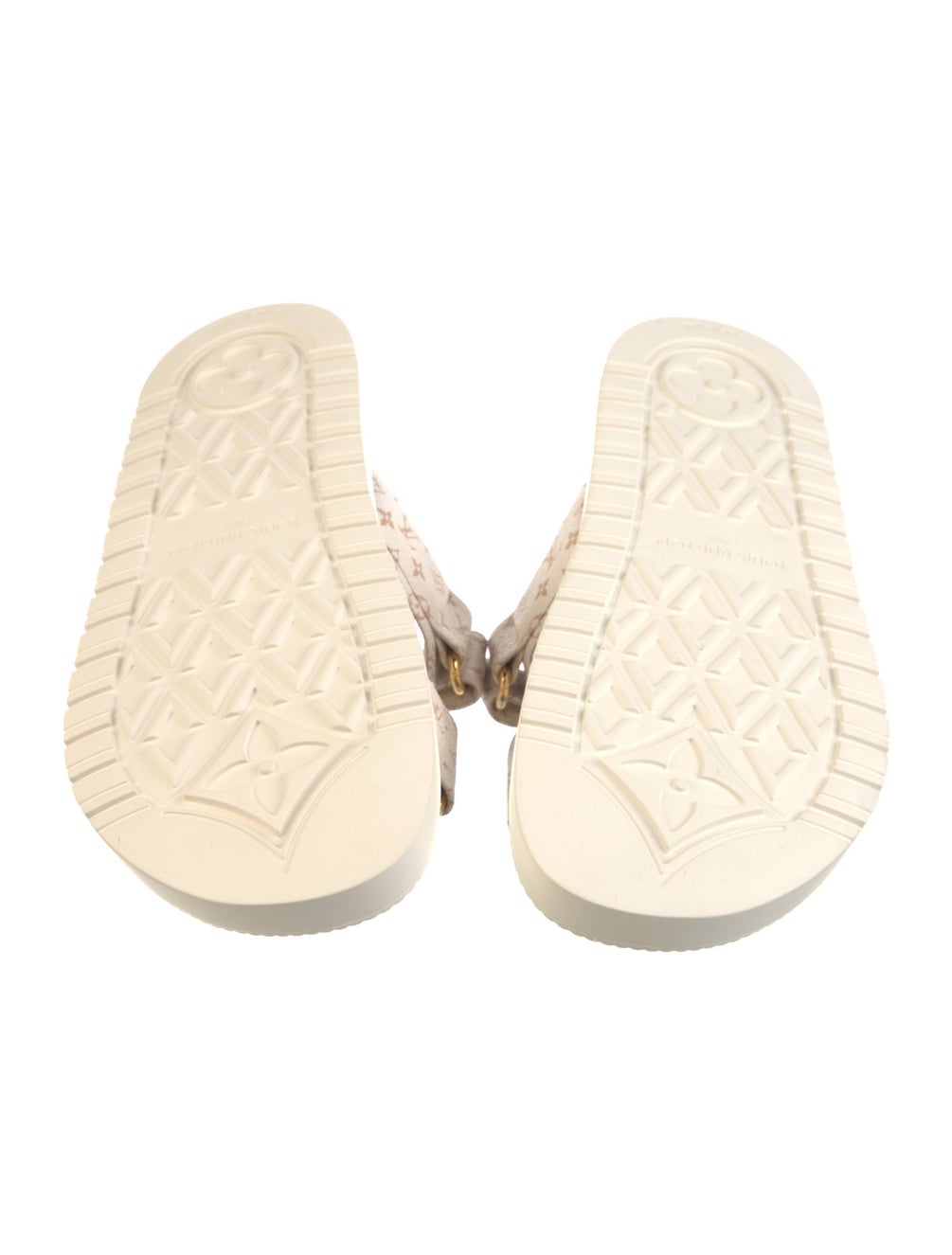 Elevate your summer style with these Louis Vuitton Beige Gold Signature LV Logo Sandals. Featuring a sleek mix of neutrals, signature logo and LV monogram, and a durable leather and rubber trim for all-day comfort. The multi-strap design with velcro closure provides a secure fit. Comes with box and dust bag.
