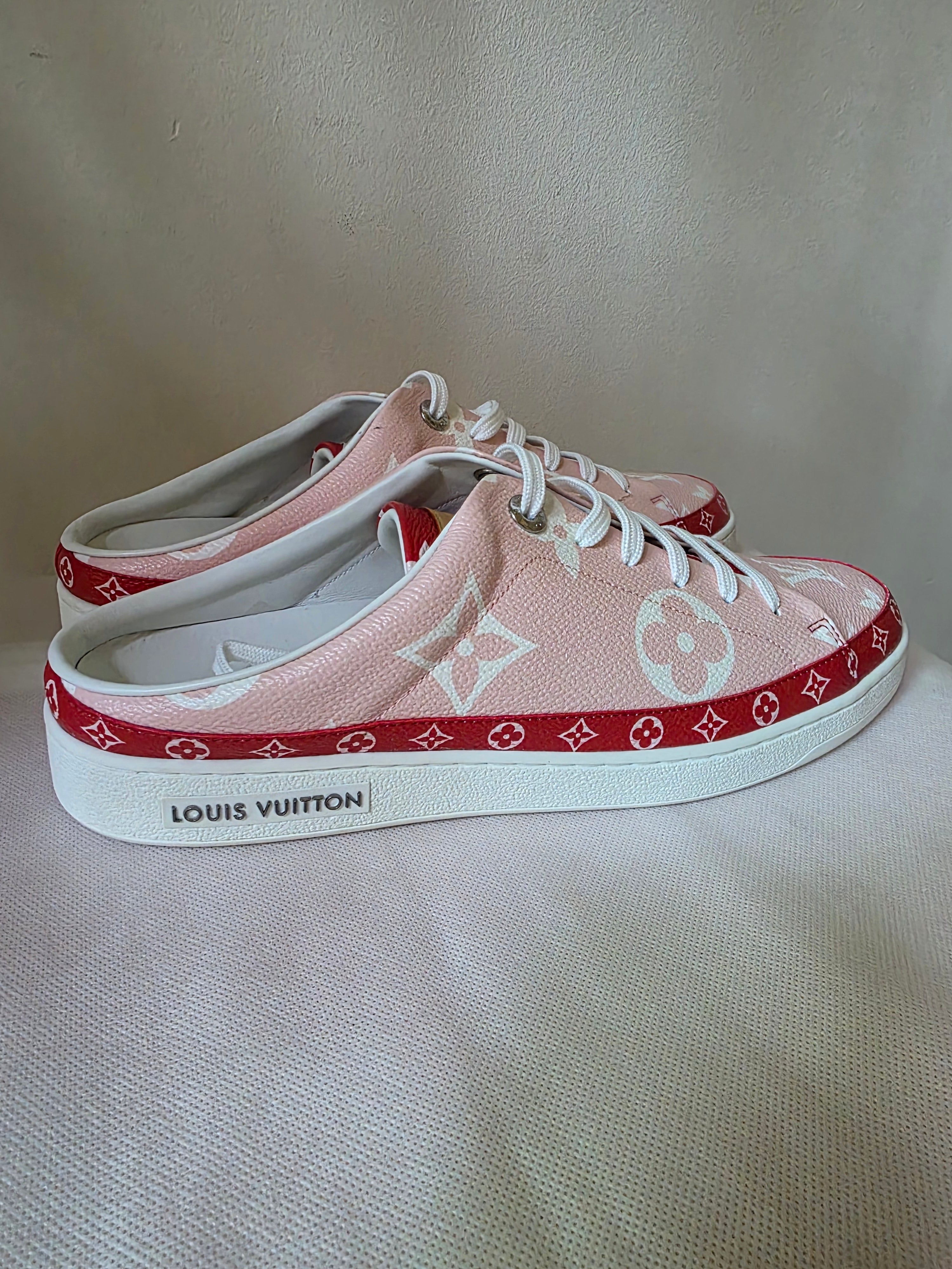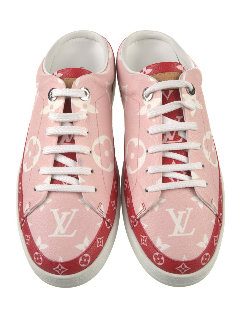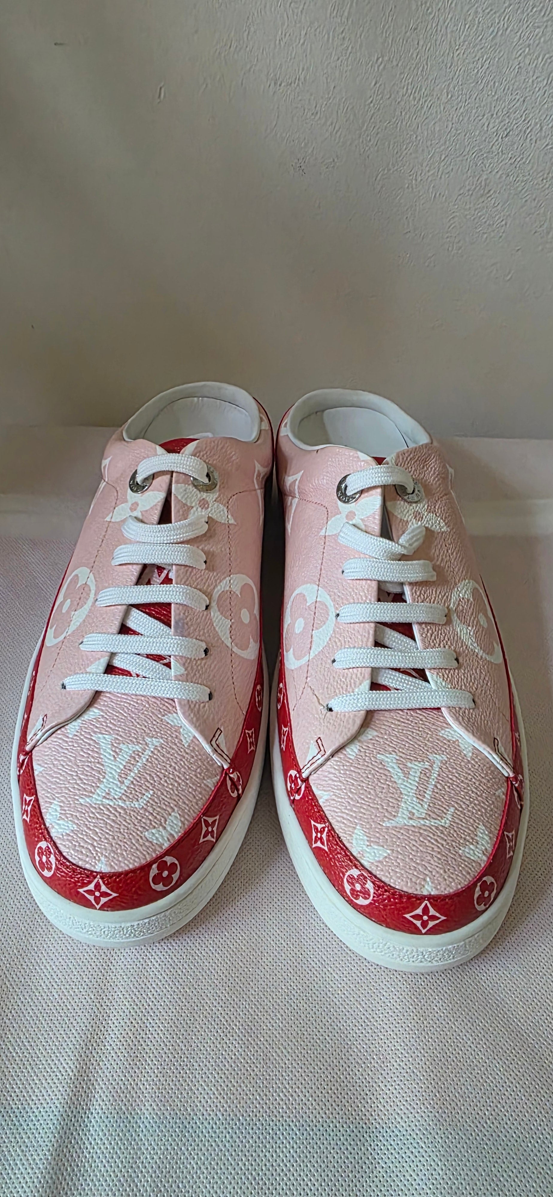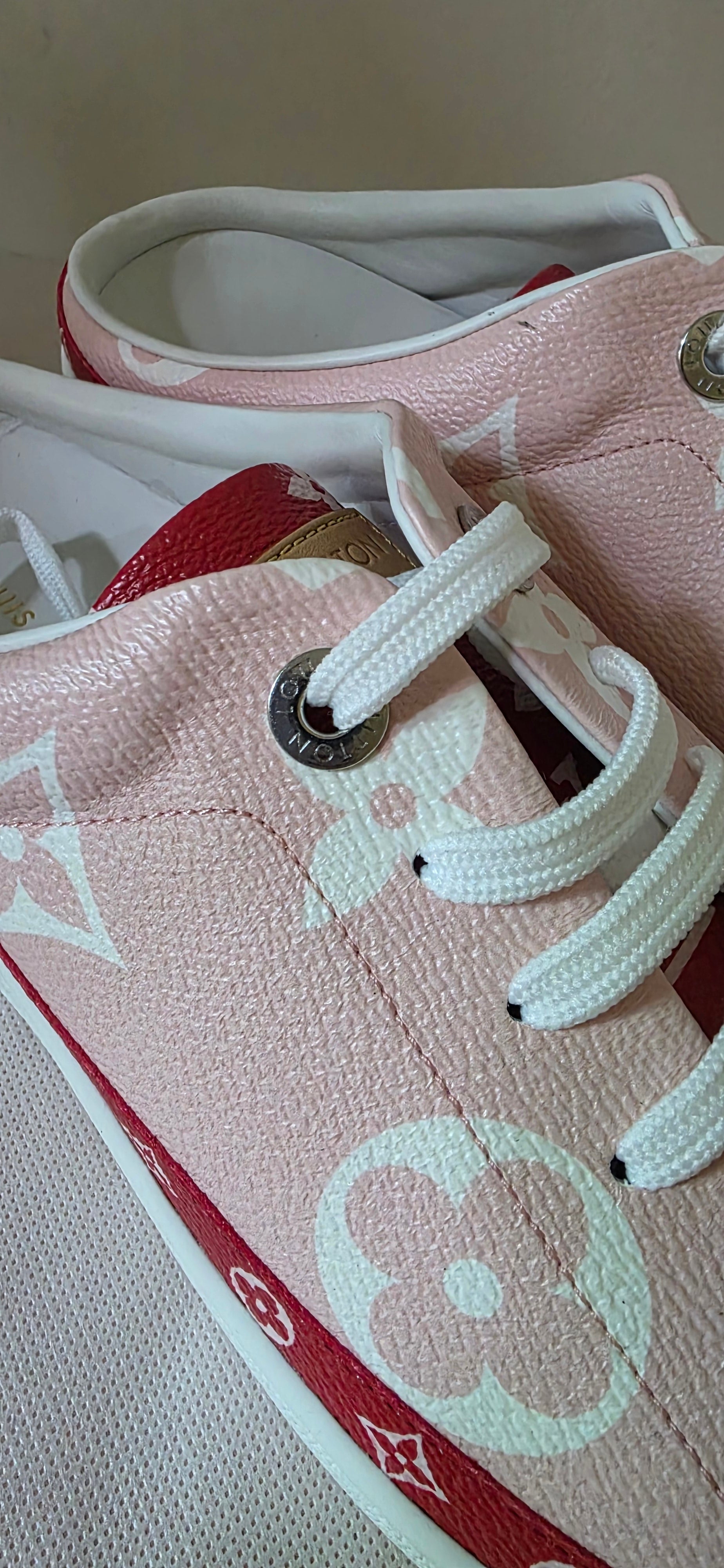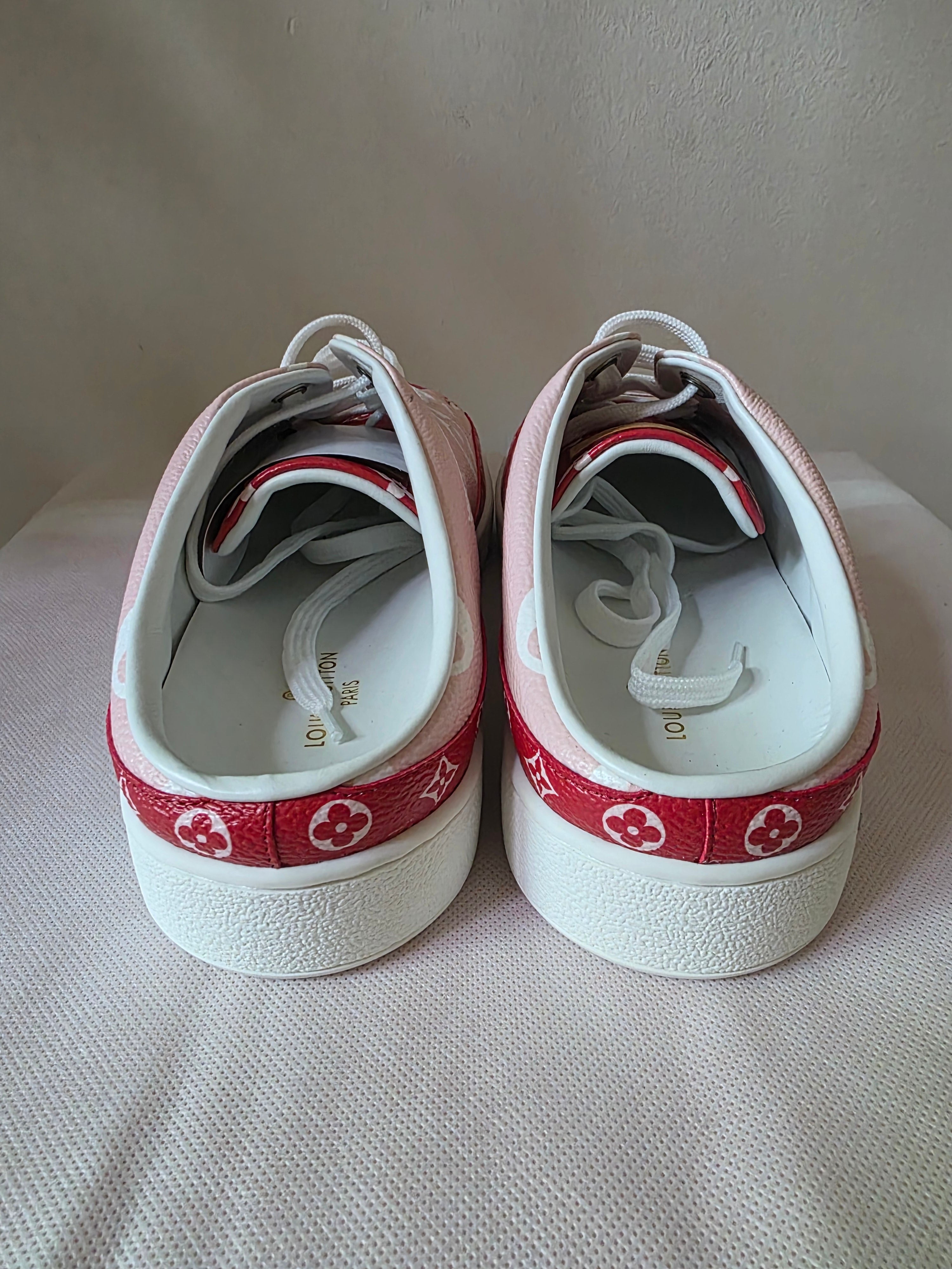 The Louis Vuitton Pink Red LV Monogram Sneakers, size 41, feature a low-top design with a distinctive LV monogram pattern. The round toes and rubber trim enhance durability and comfort, while the exposed tie closure on top provides both style and functional ease. Ideal for those seeking a blend of luxury and practicality.