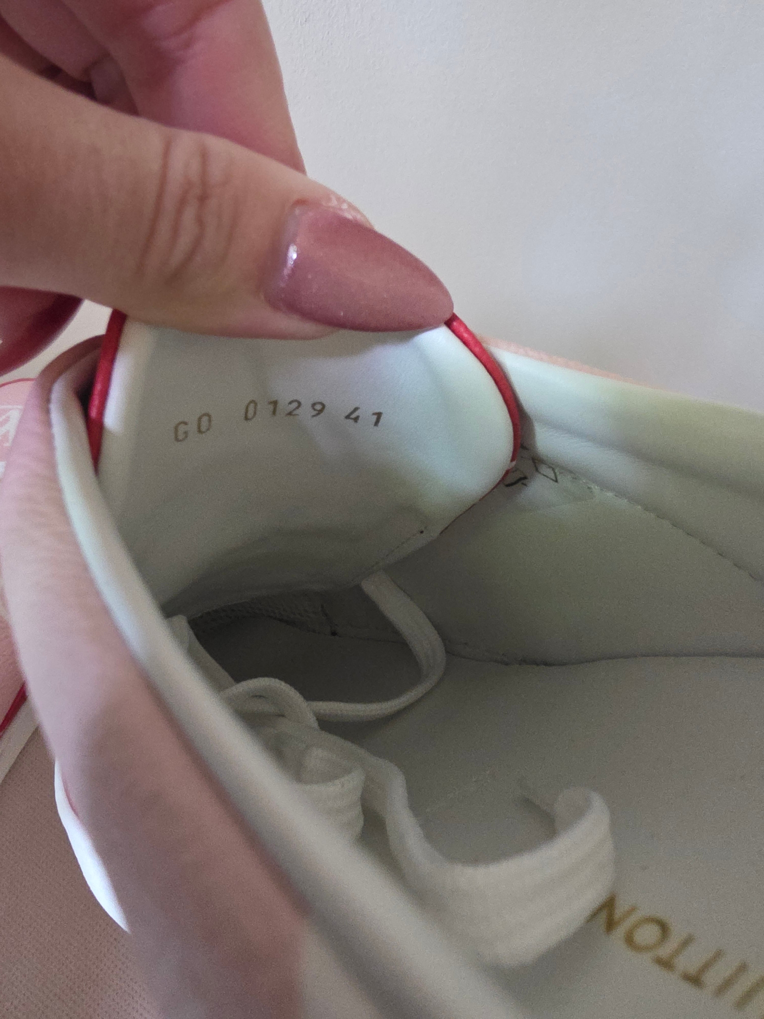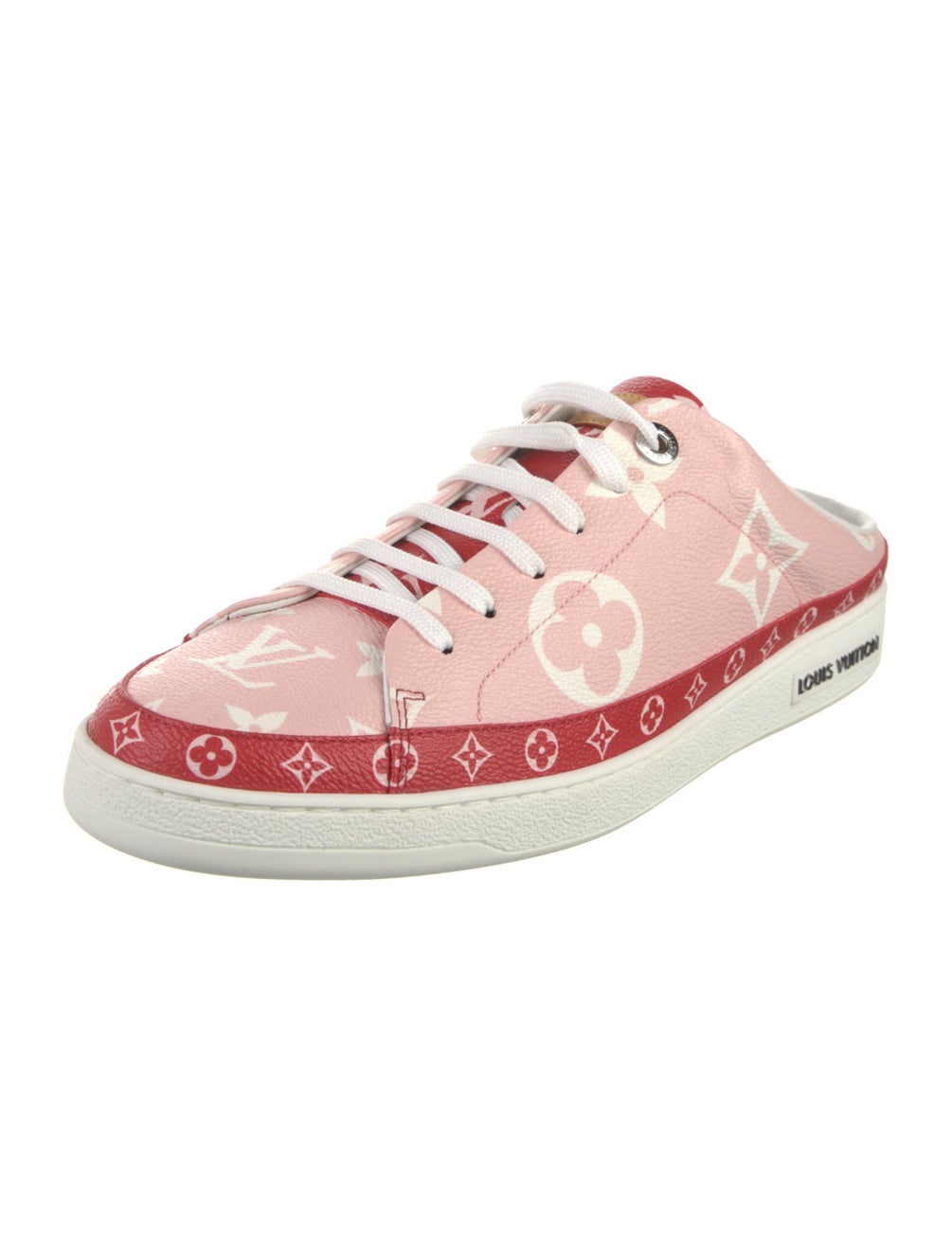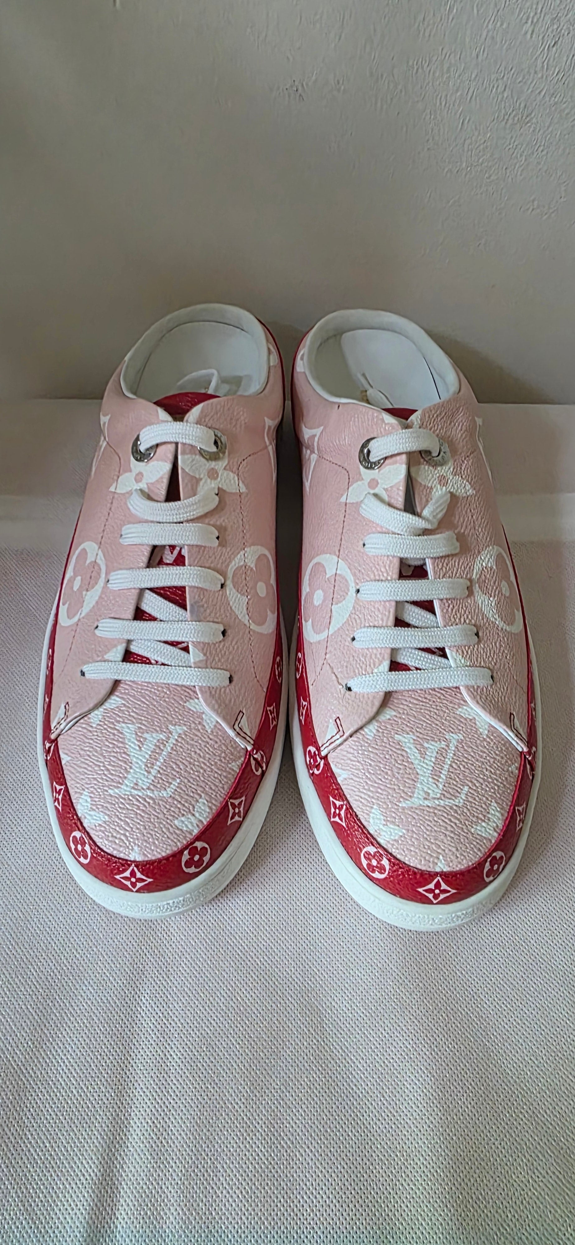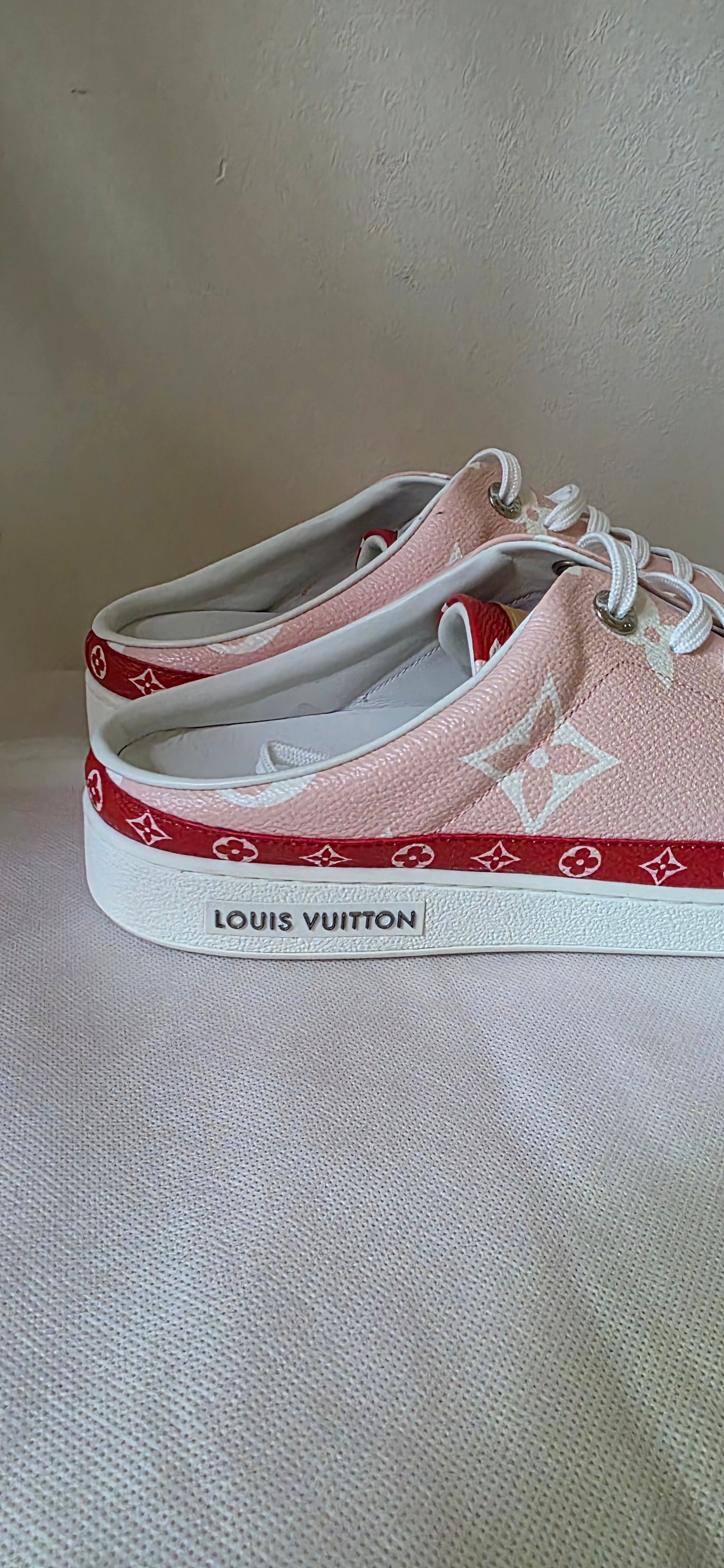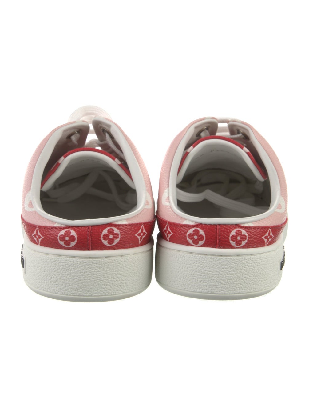 The Louis Vuitton Pink Red LV Monogram Sneakers, size 41, feature a low-top design with a distinctive LV monogram pattern. The round toes and rubber trim enhance durability and comfort, while the exposed tie closure on top provides both style and functional ease. Ideal for those seeking a blend of luxury and practicality.