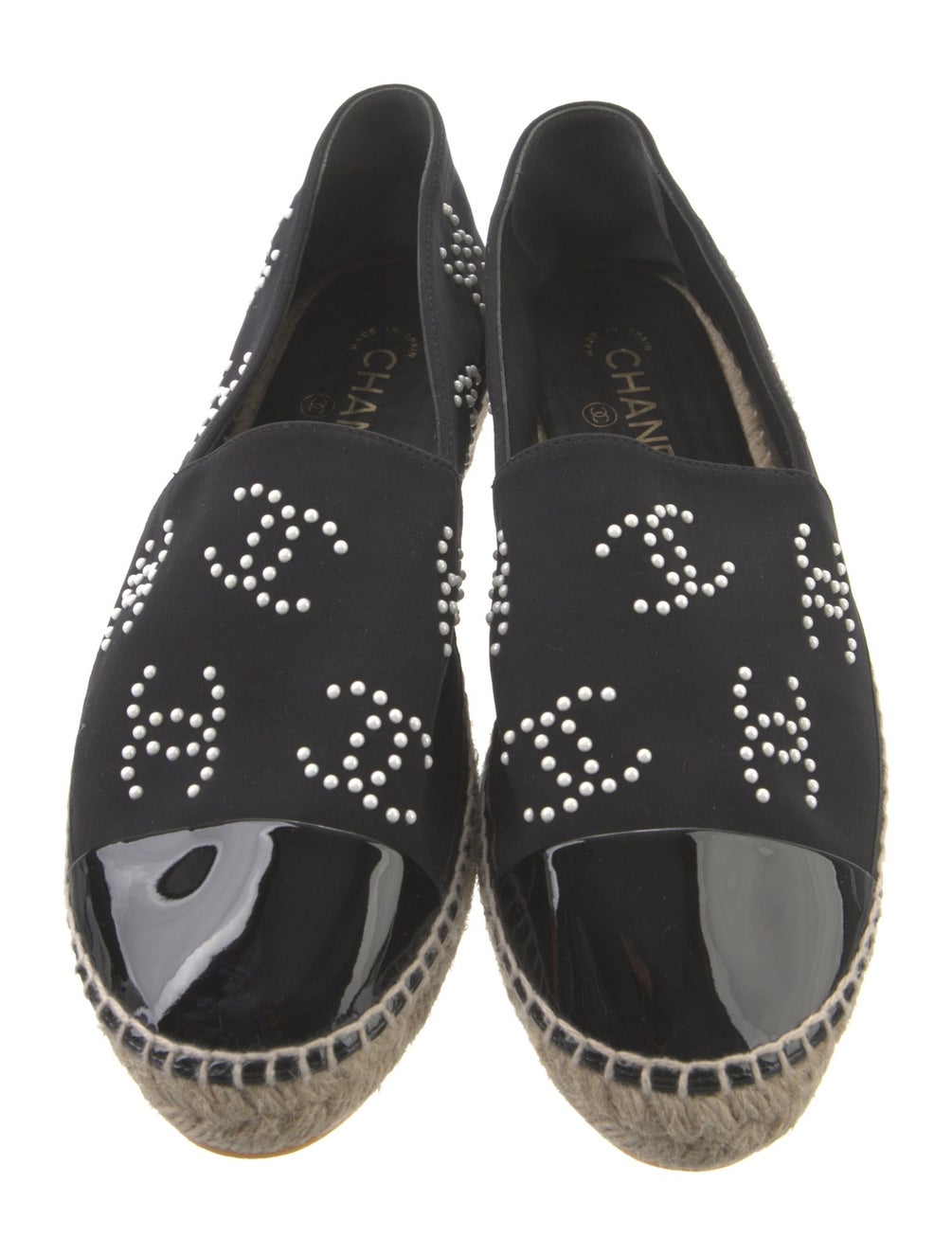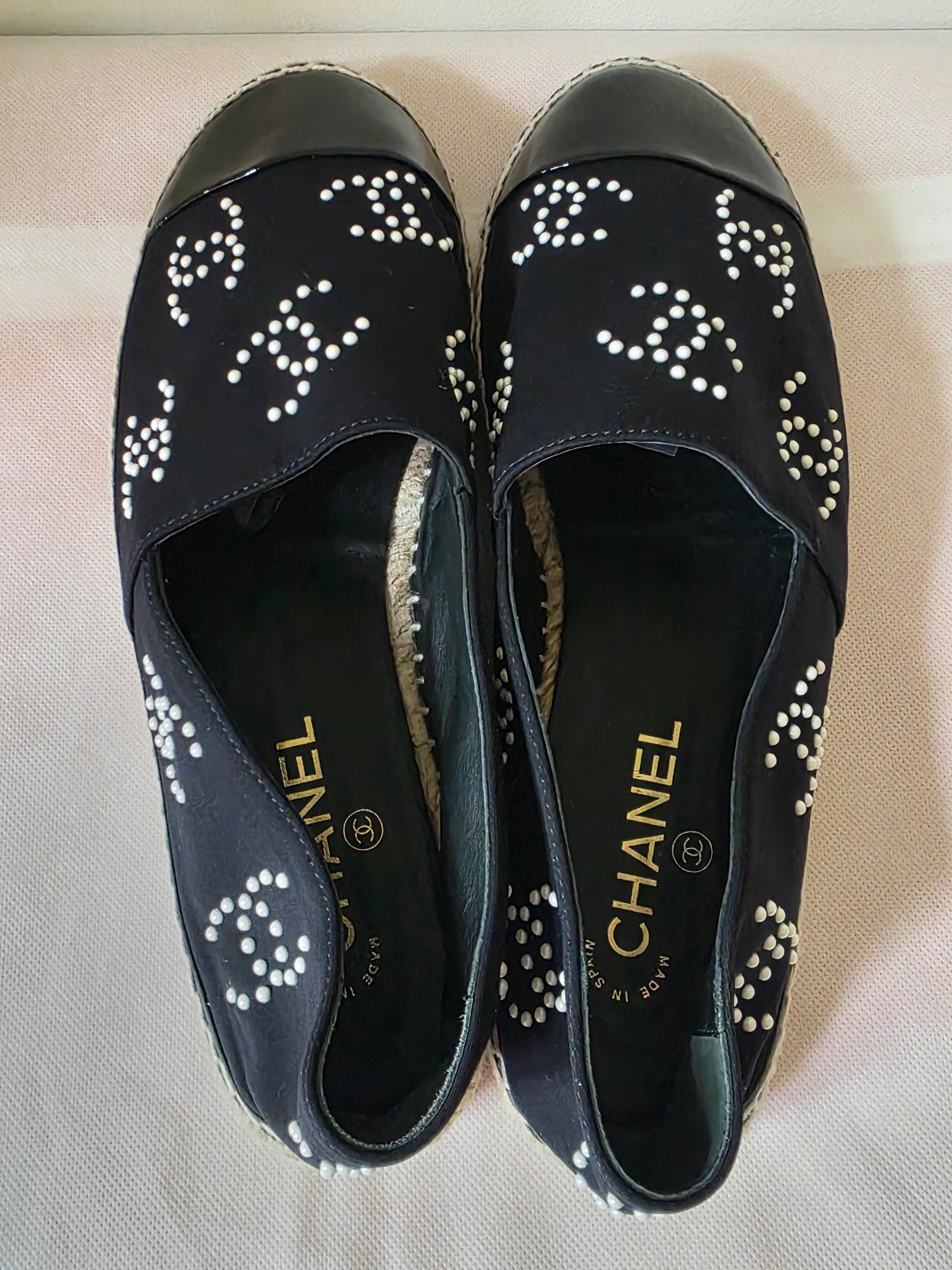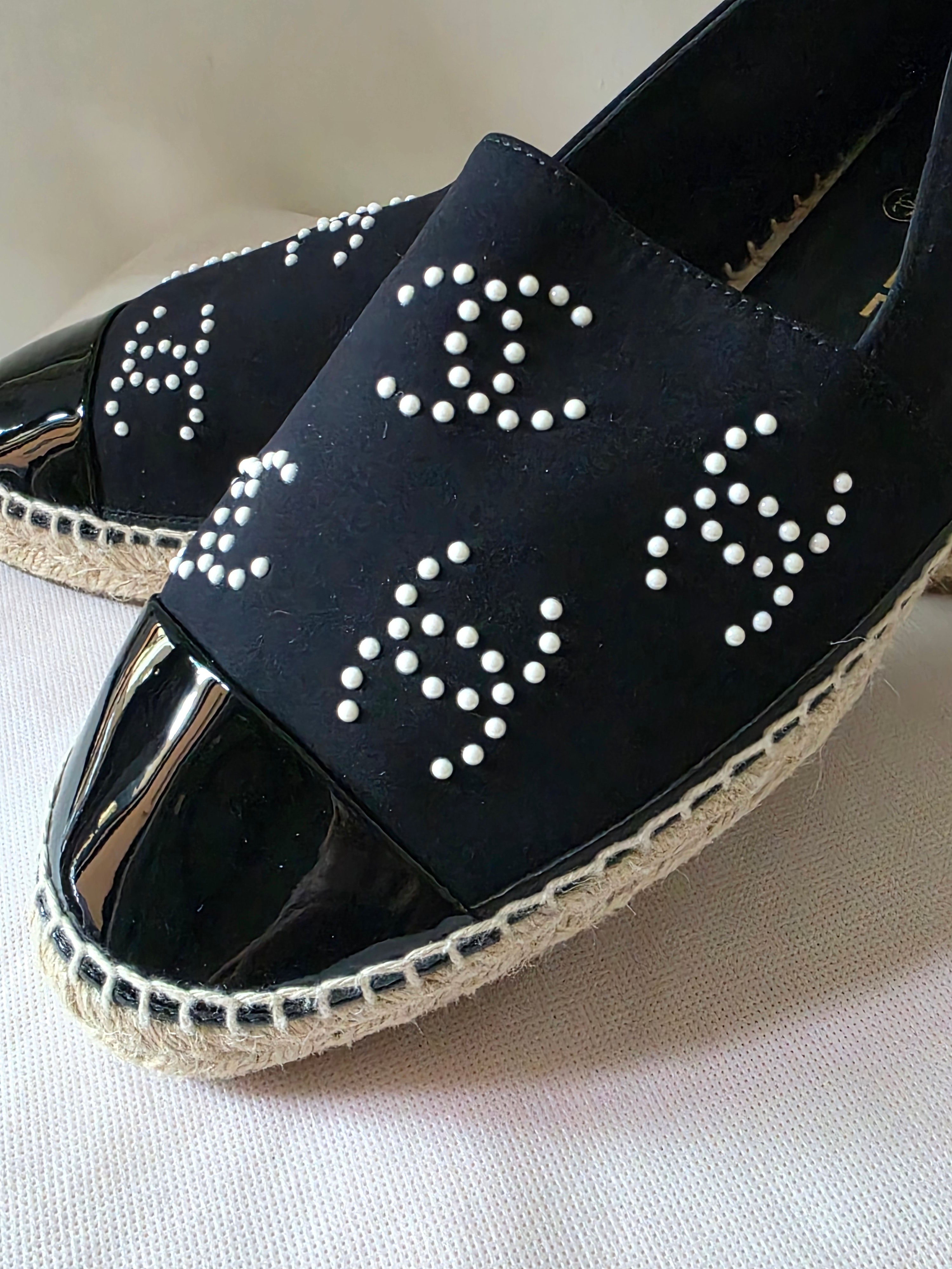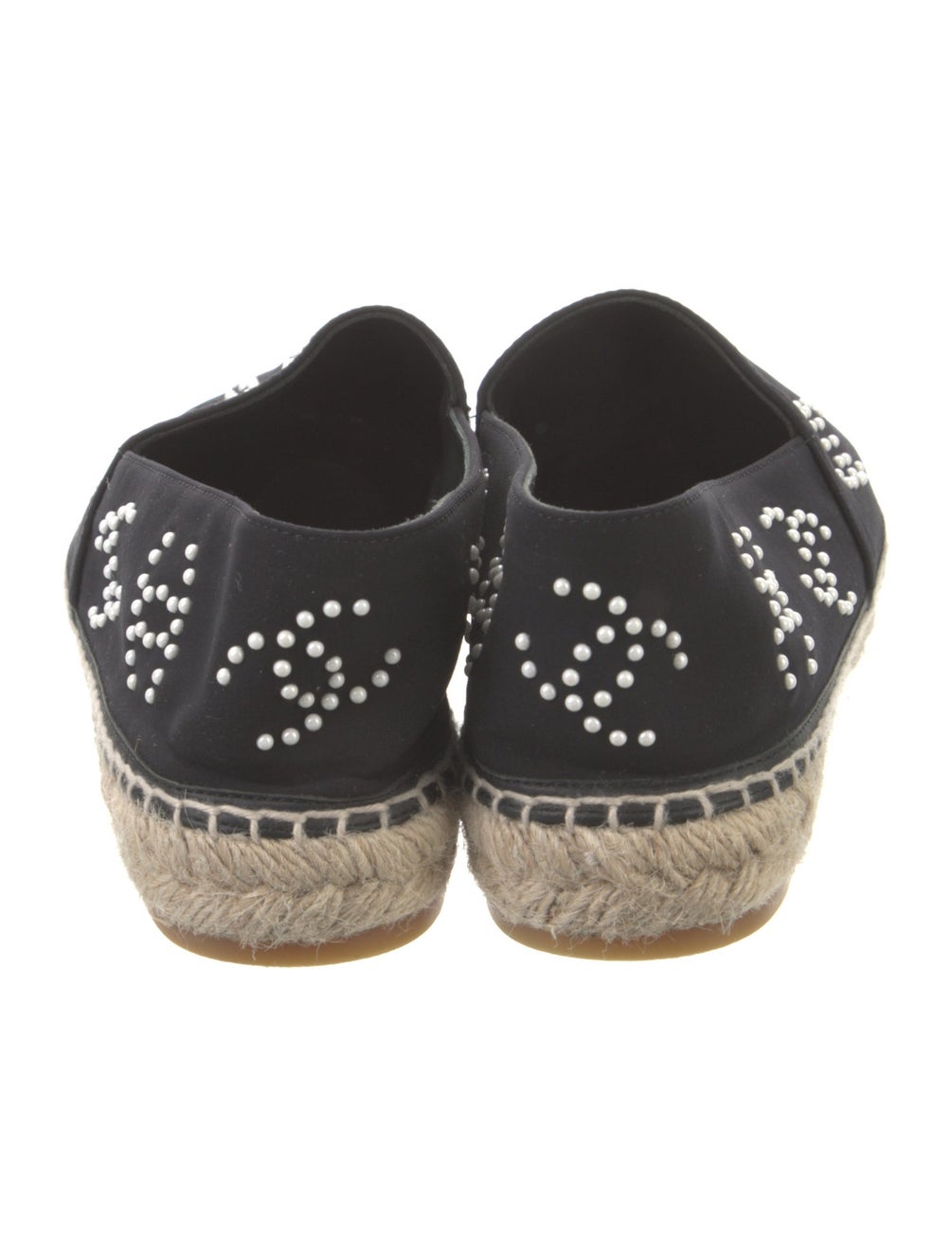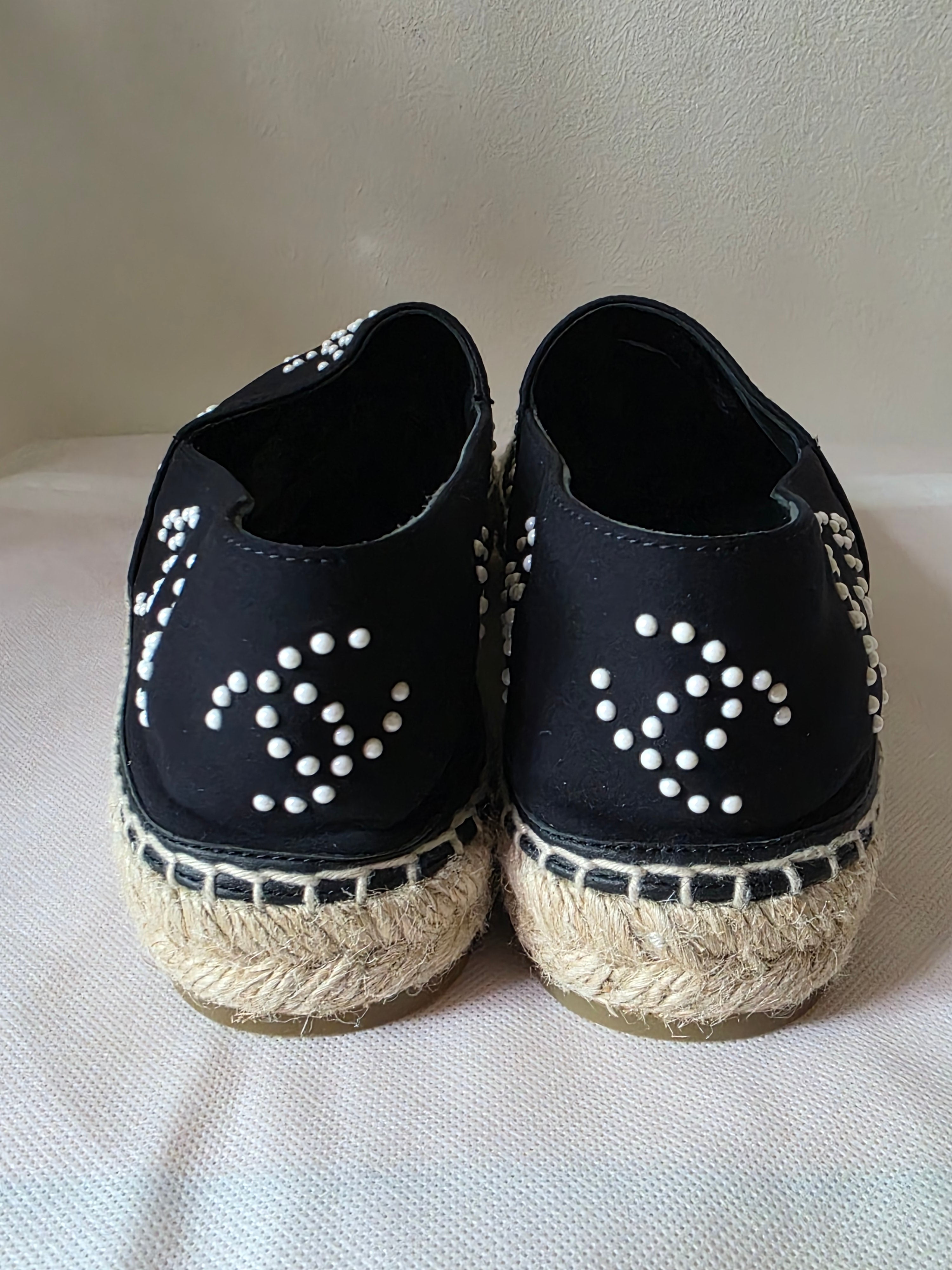 PlatformThe Chanel Black 2022 Interlocking CC Logo Espadrilles feature a refined design with semi-pointed toes and distinctive faux pearl accents, offering a blend of elegance and comfort. The jute trim enhances durability, while the platform design provides added support, making them suitable for extended wear.