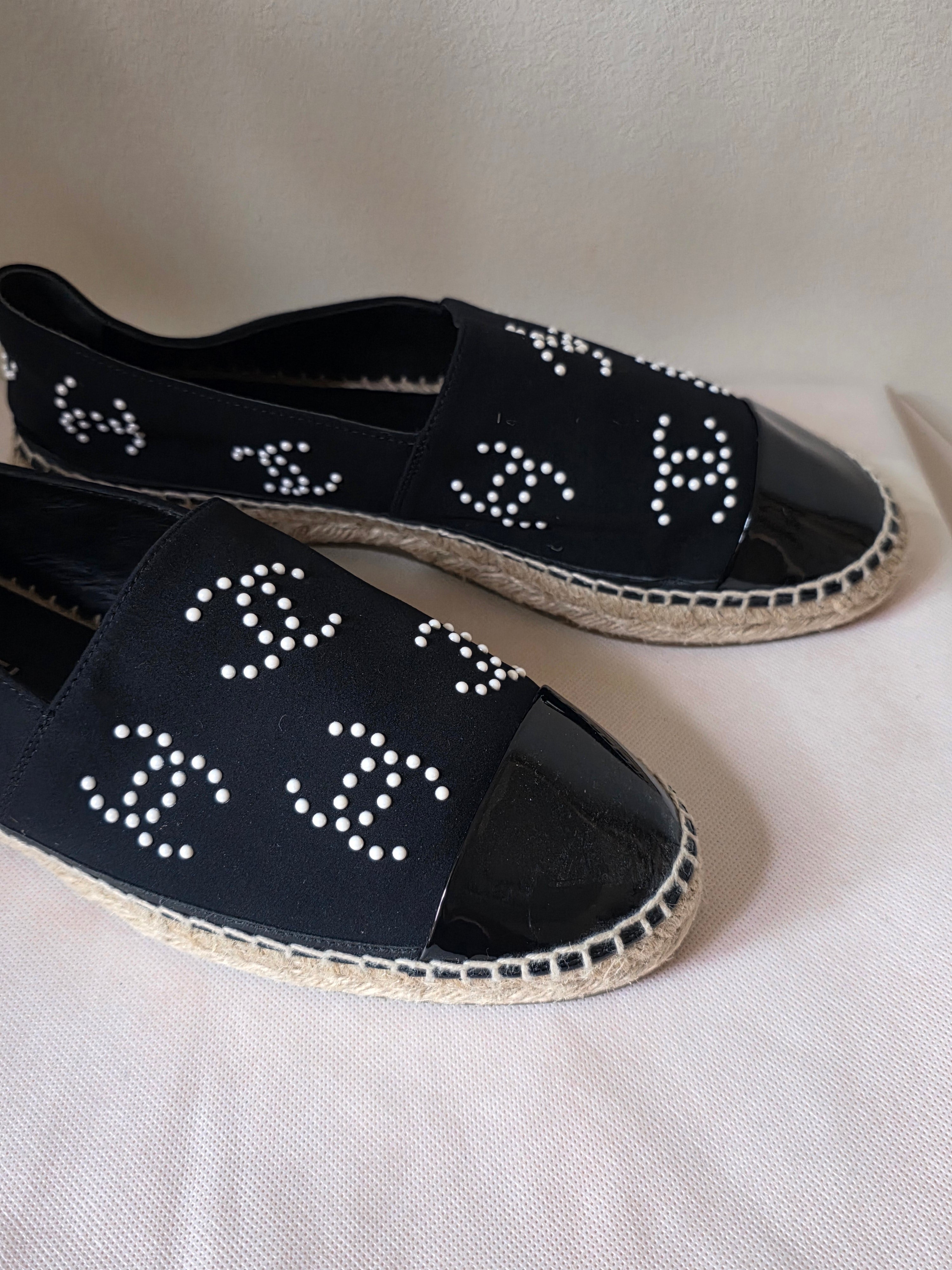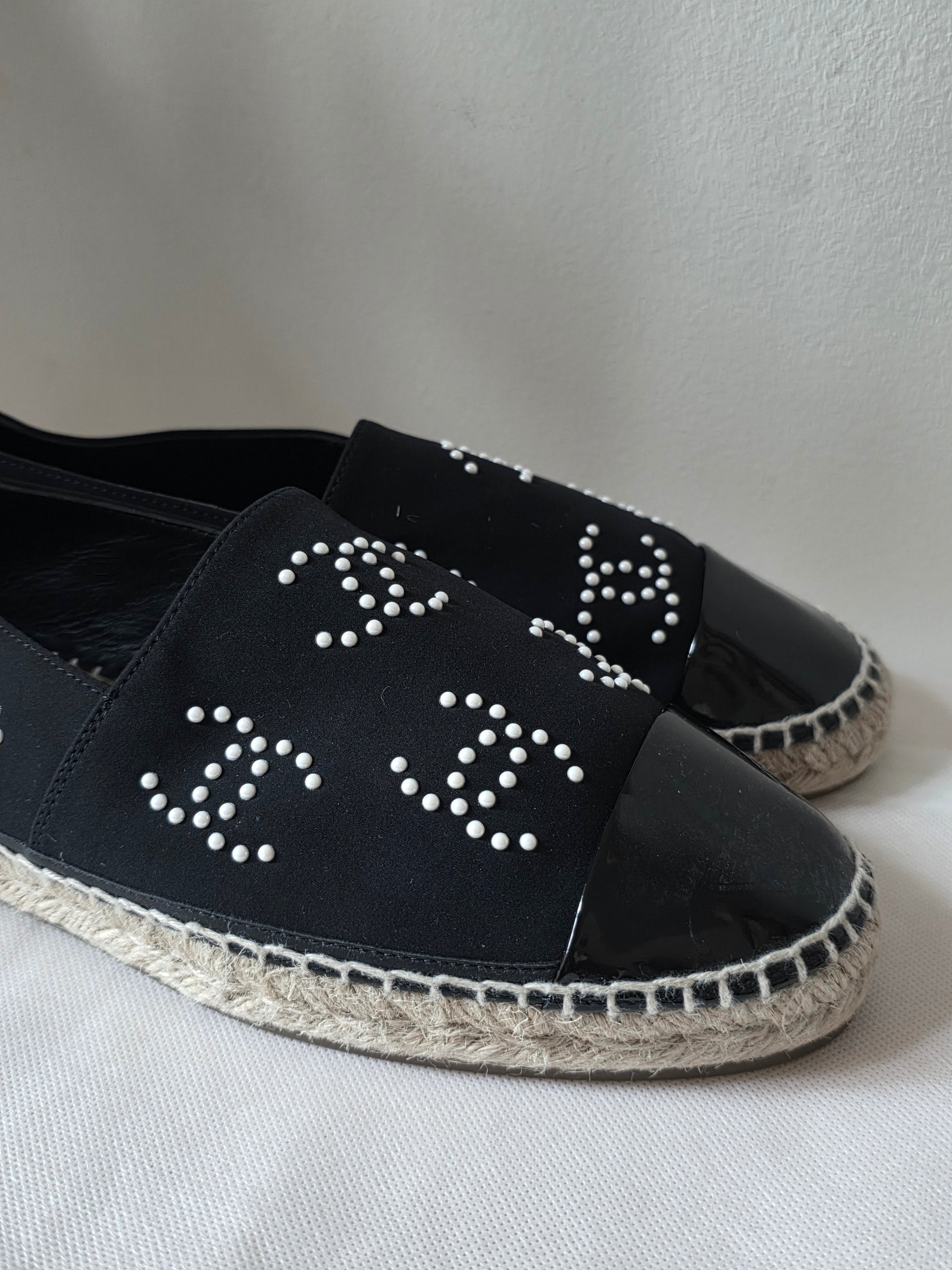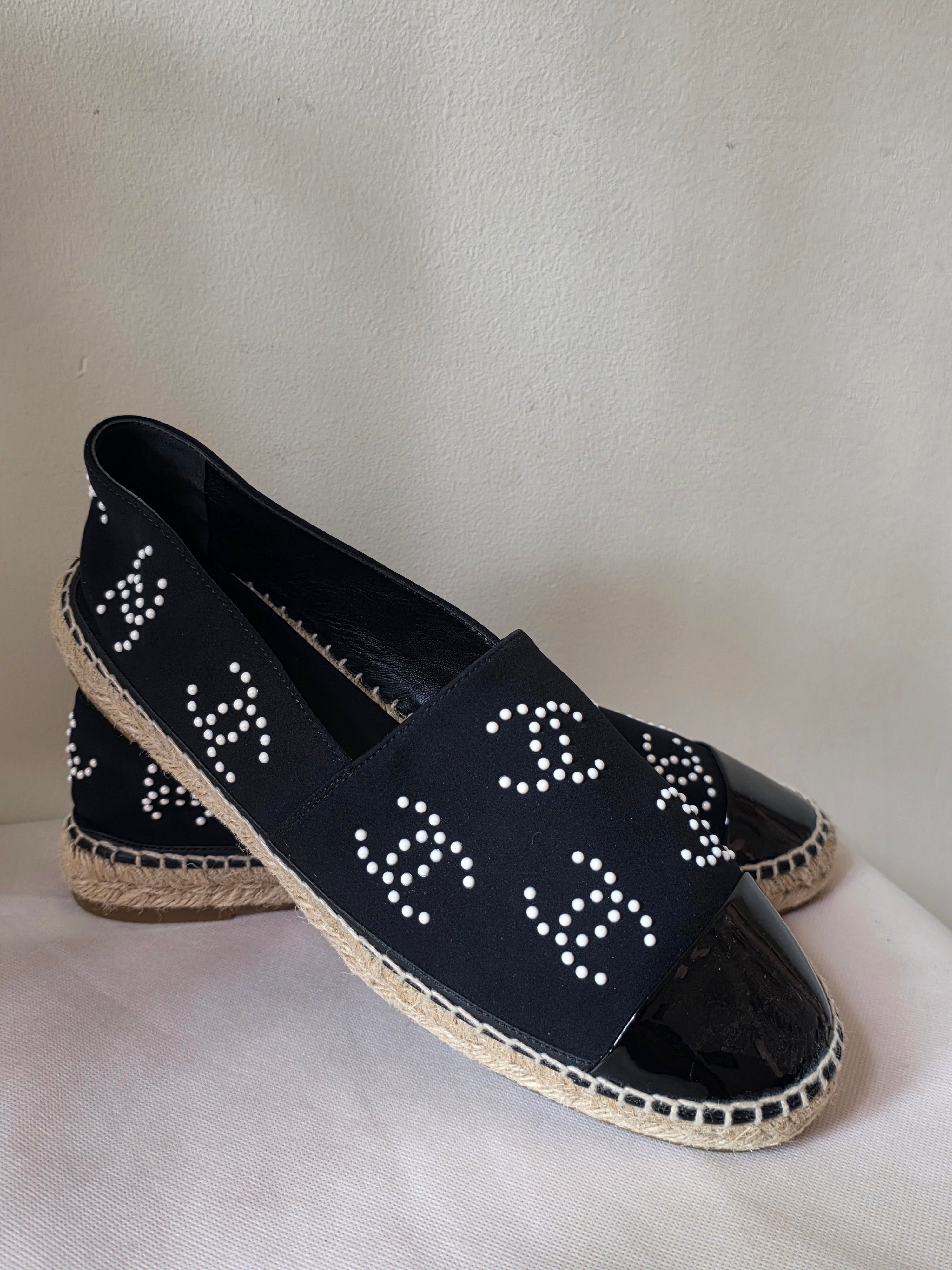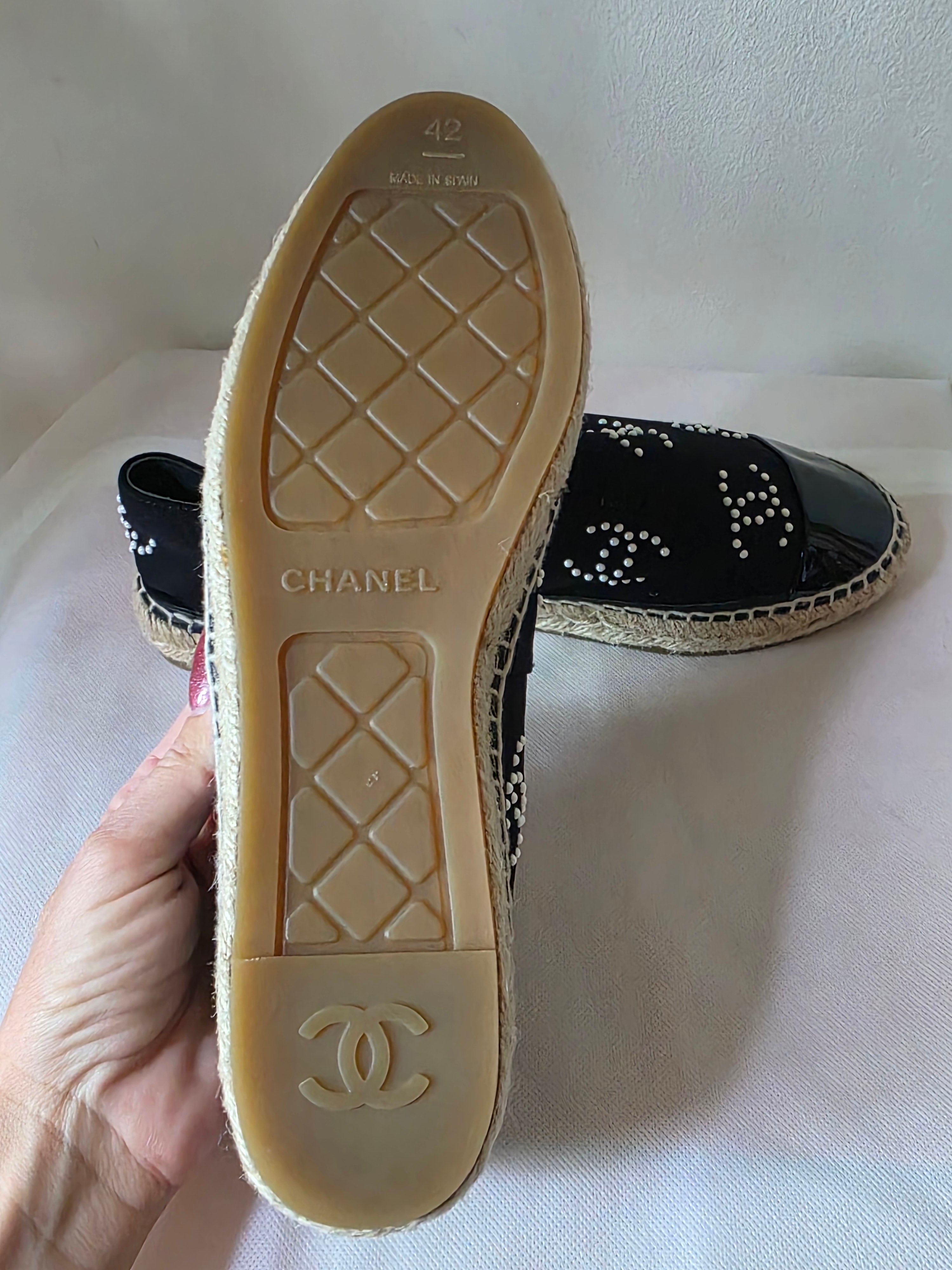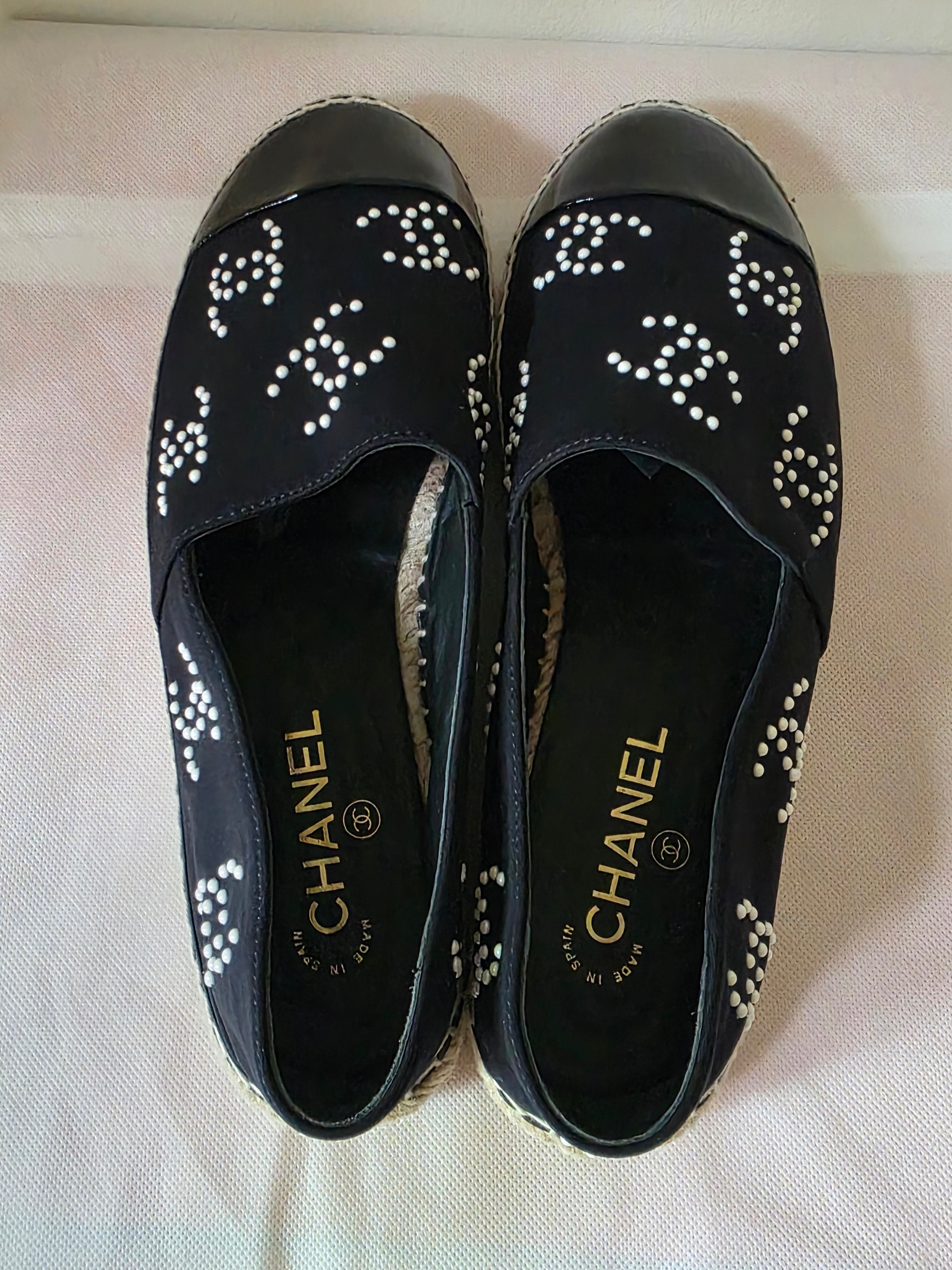 PlatformThe Chanel Black 2022 Interlocking CC Logo Espadrilles feature a refined design with semi-pointed toes and distinctive faux pearl accents, offering a blend of elegance and comfort. The jute trim enhances durability, while the platform design provides added support, making them suitable for extended wear.