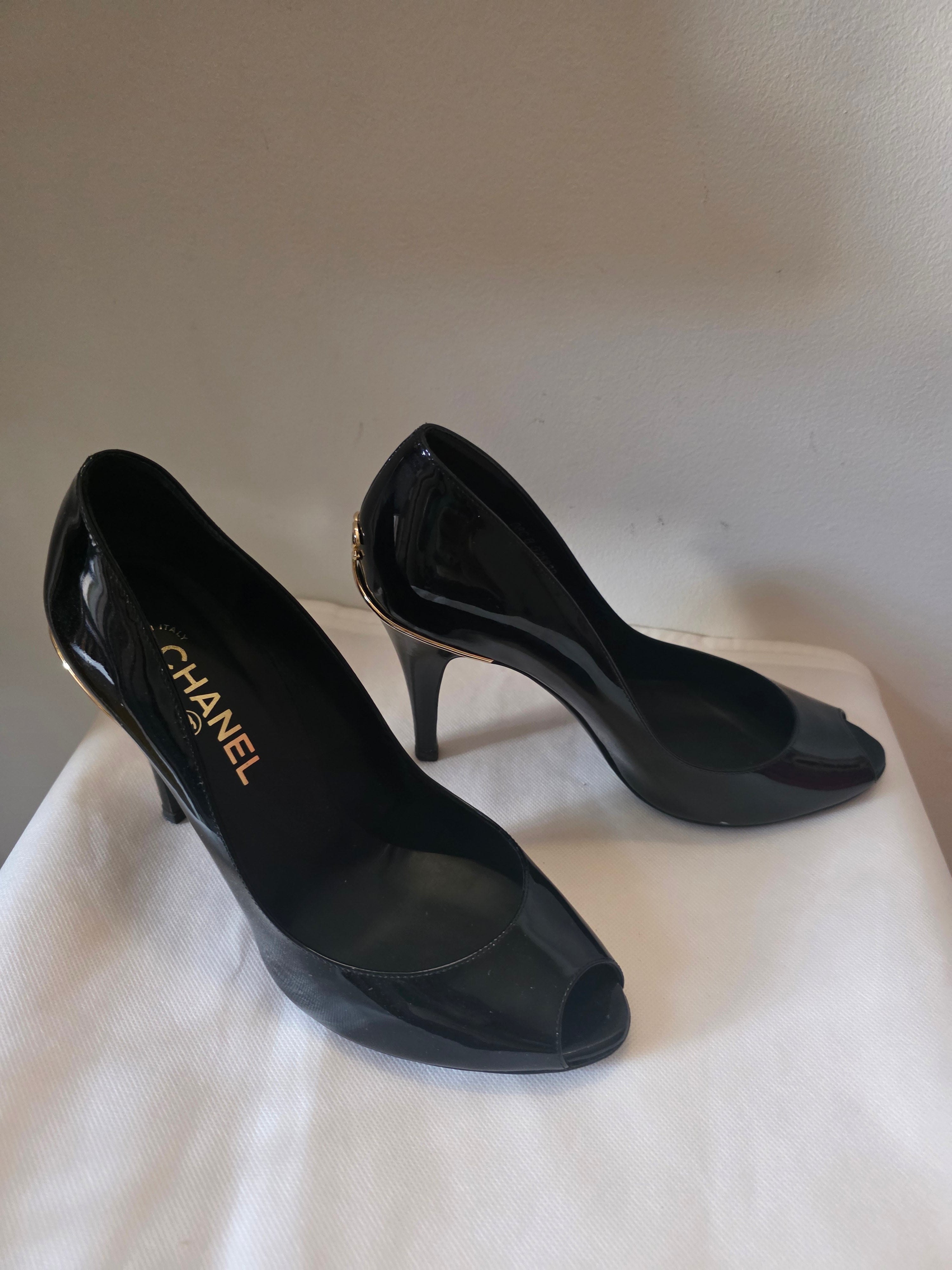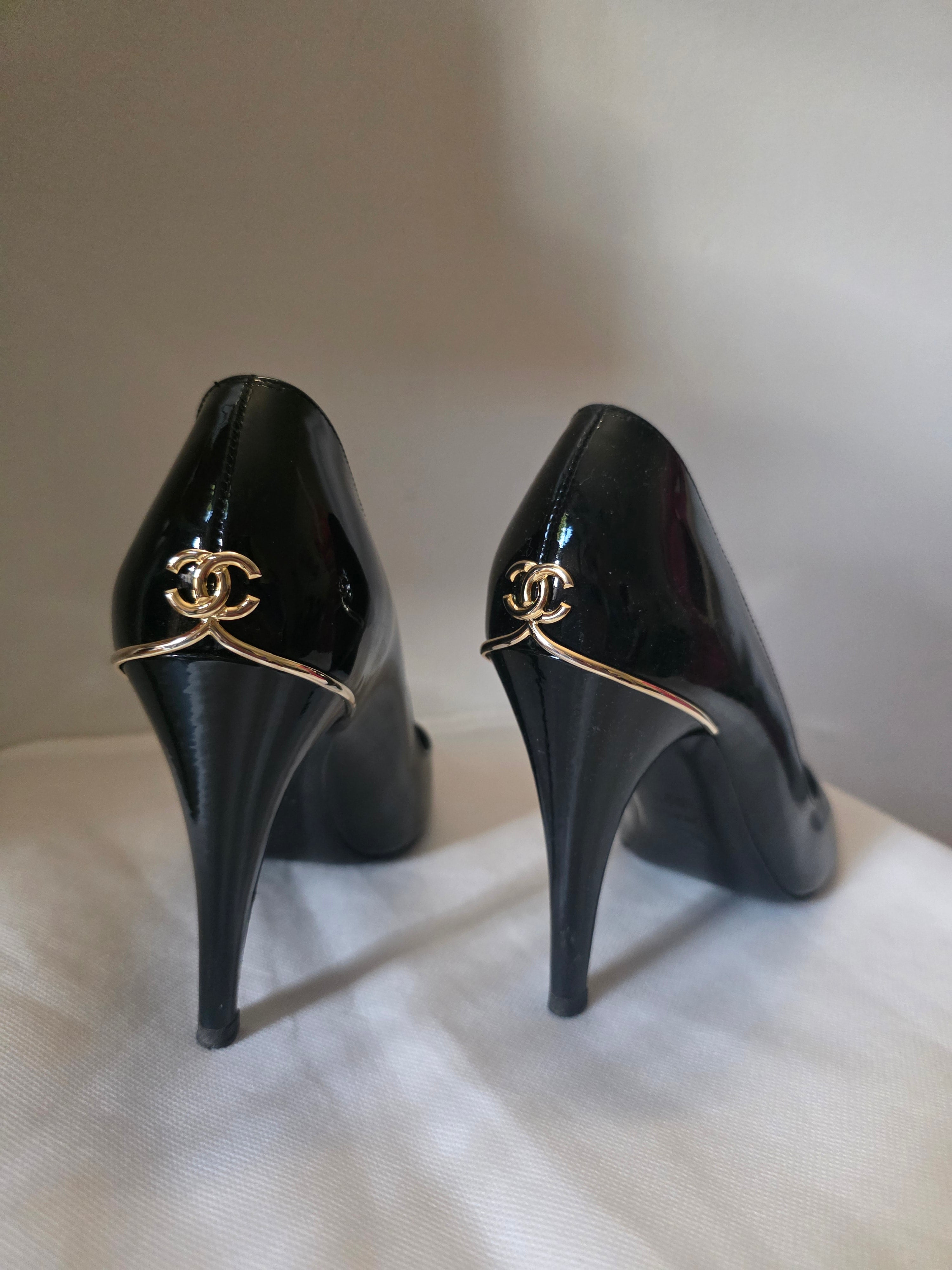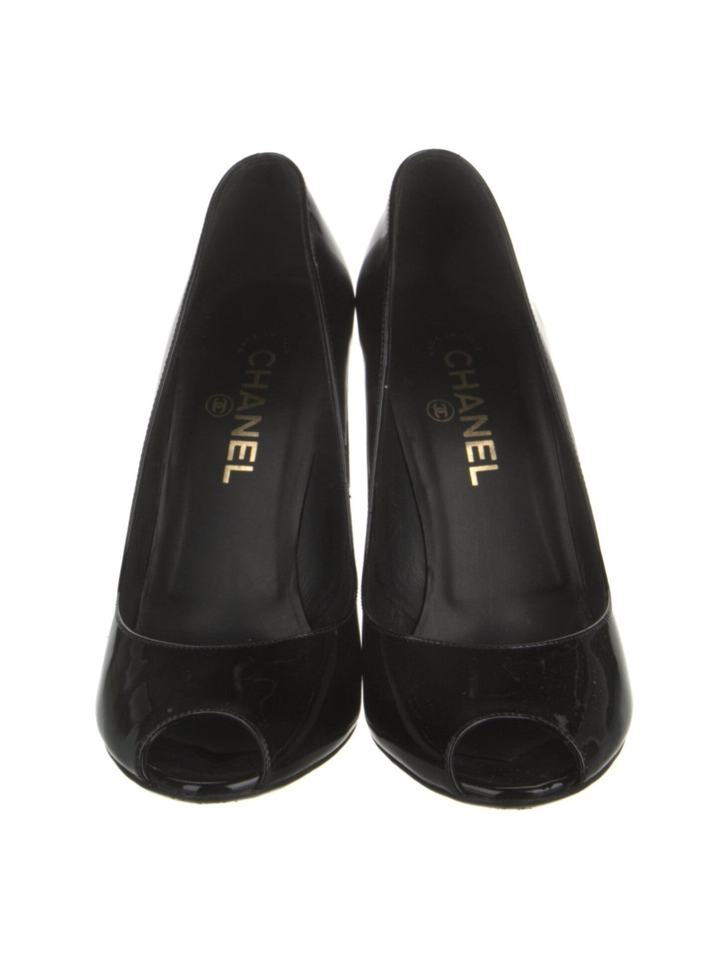 Upgrade your shoe collection with these Chanel Black Patent Leather 2008 Interlocking CC Logo Pumps. From the Cruise 2008 Collection by Karl Lagerfeld, these pumps boast a sleek black design with the iconic interlocking CC logo. Their peep-toe style and platform add a touch of sophistication, while the box and additional heel caps make for easy storage and maintenance.