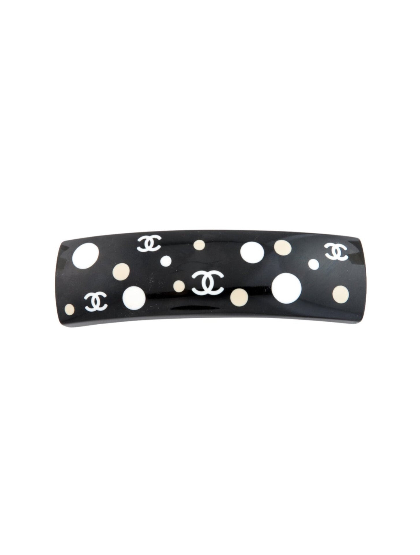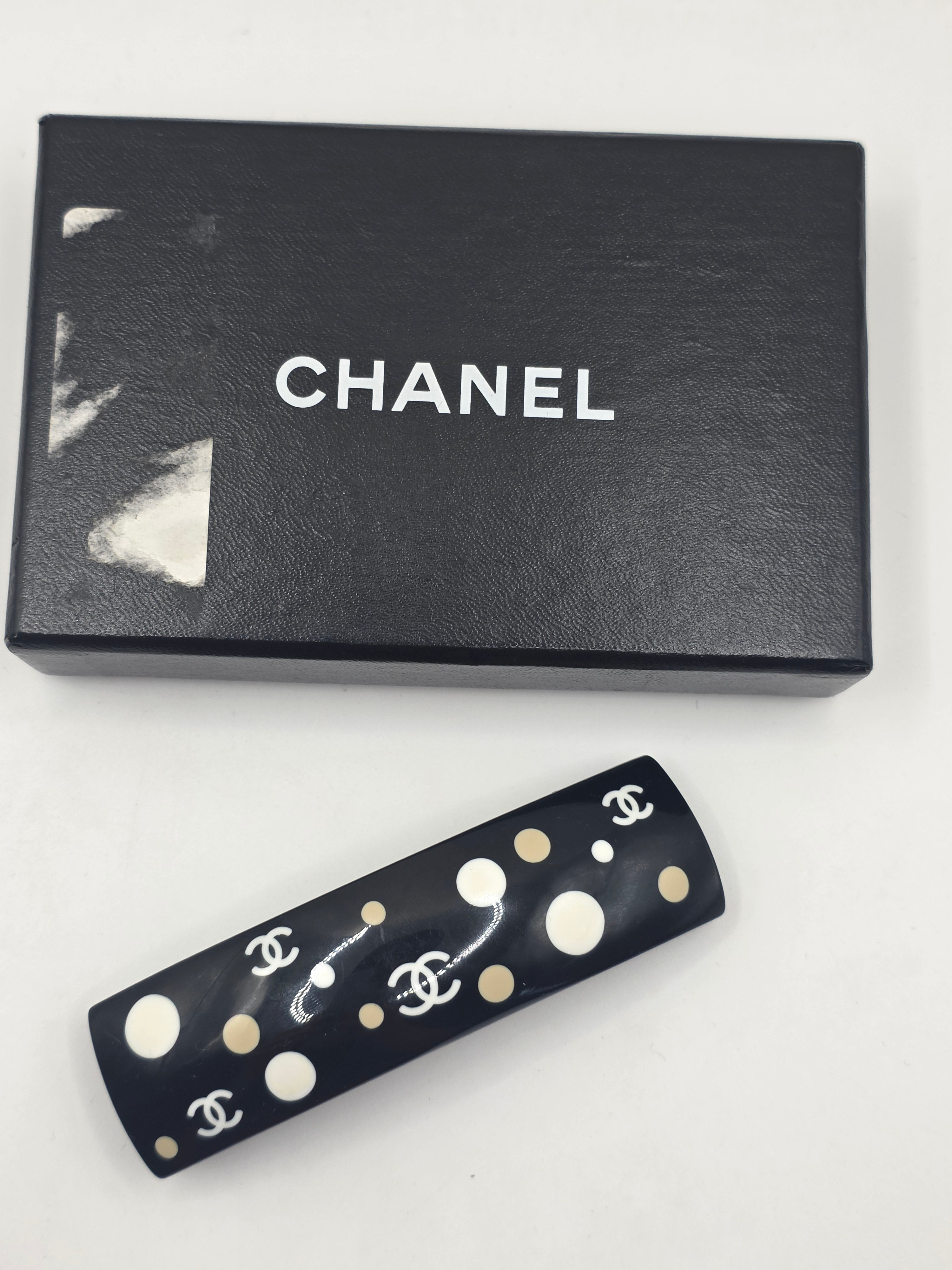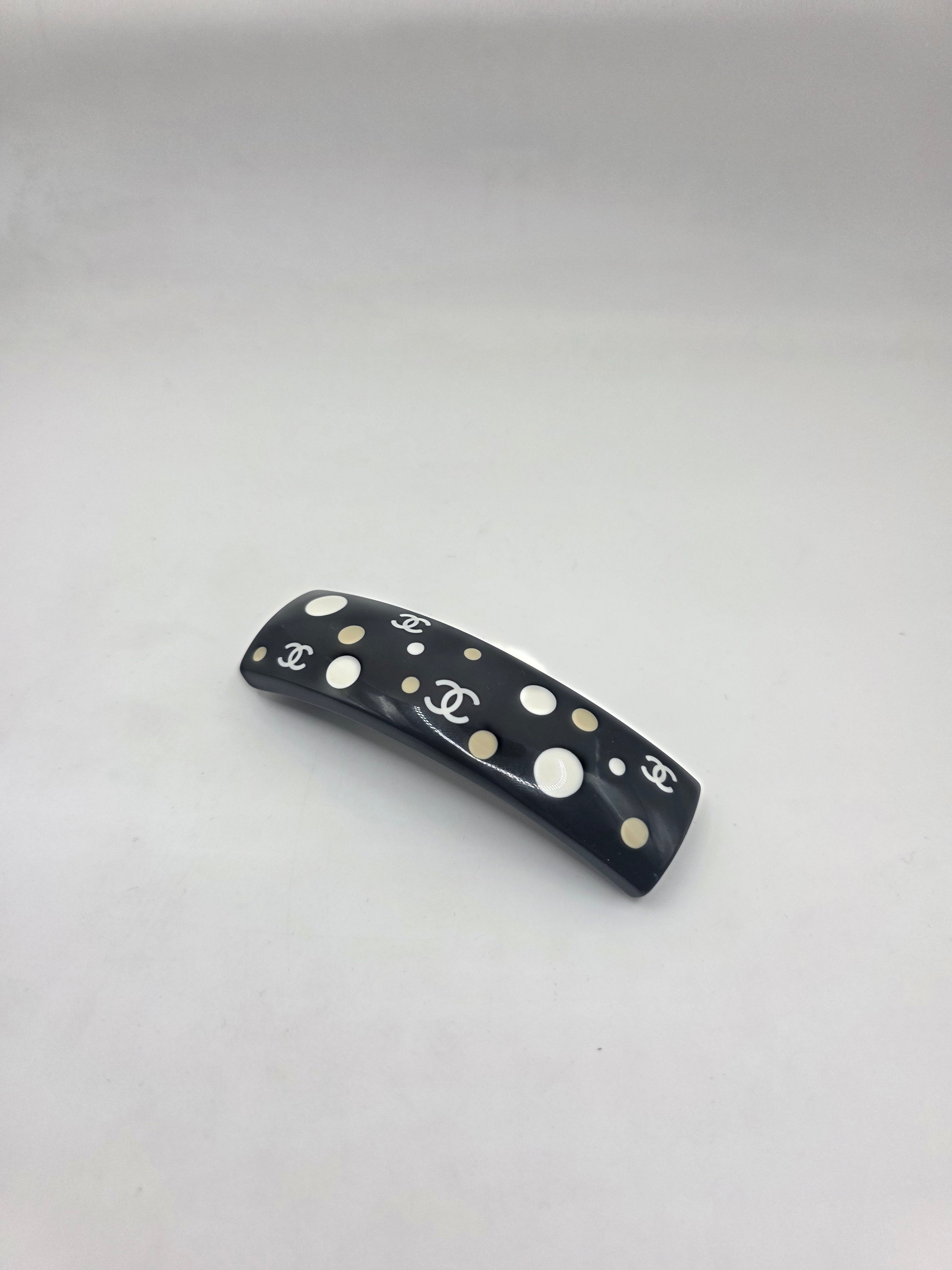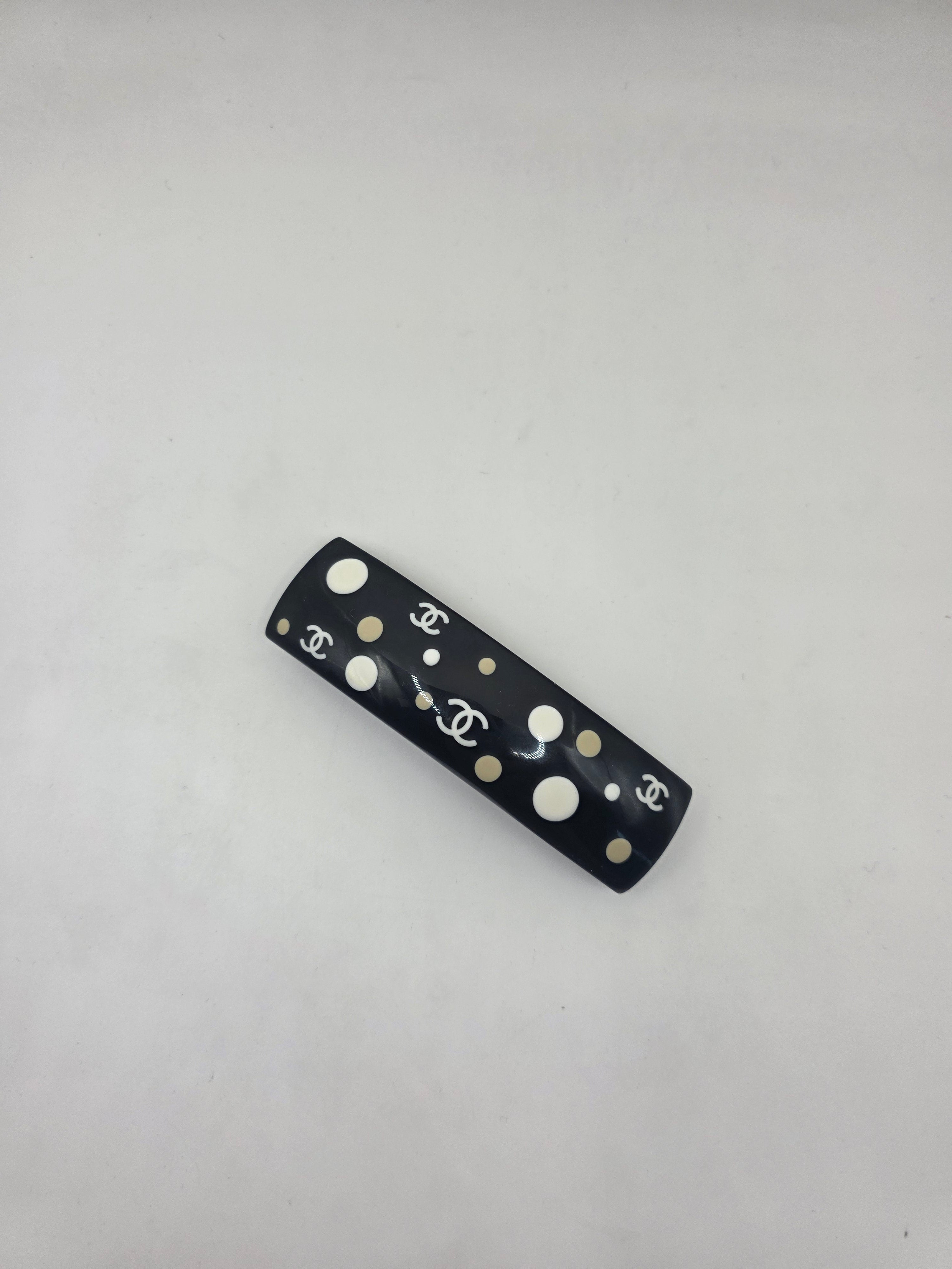 Upgrade your hair accessory game with the Chanel Black white Polka Dot Interlocking CC Hair Clip. The chic polka dot design and iconic CC motif add a touch of elegance and style to any hairdo. Made with high-quality materials, this hair clip is a must-have for any fashionista.