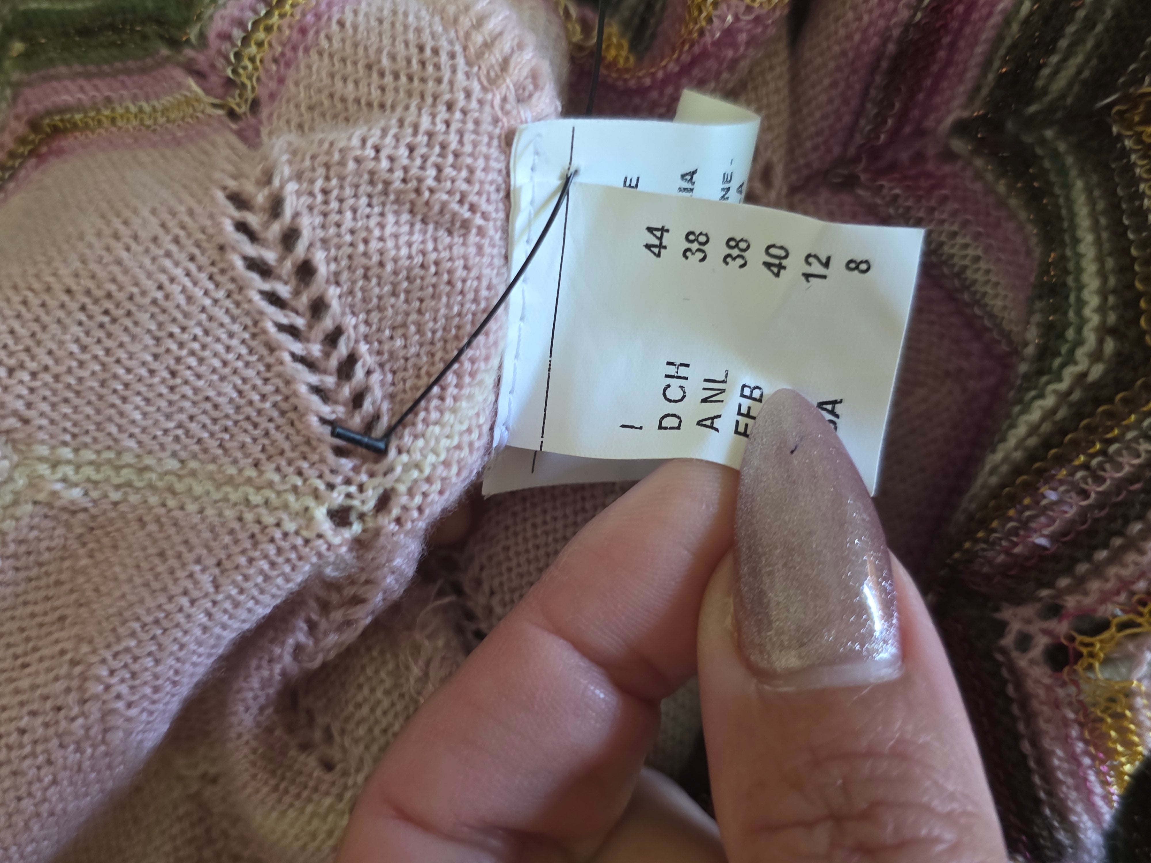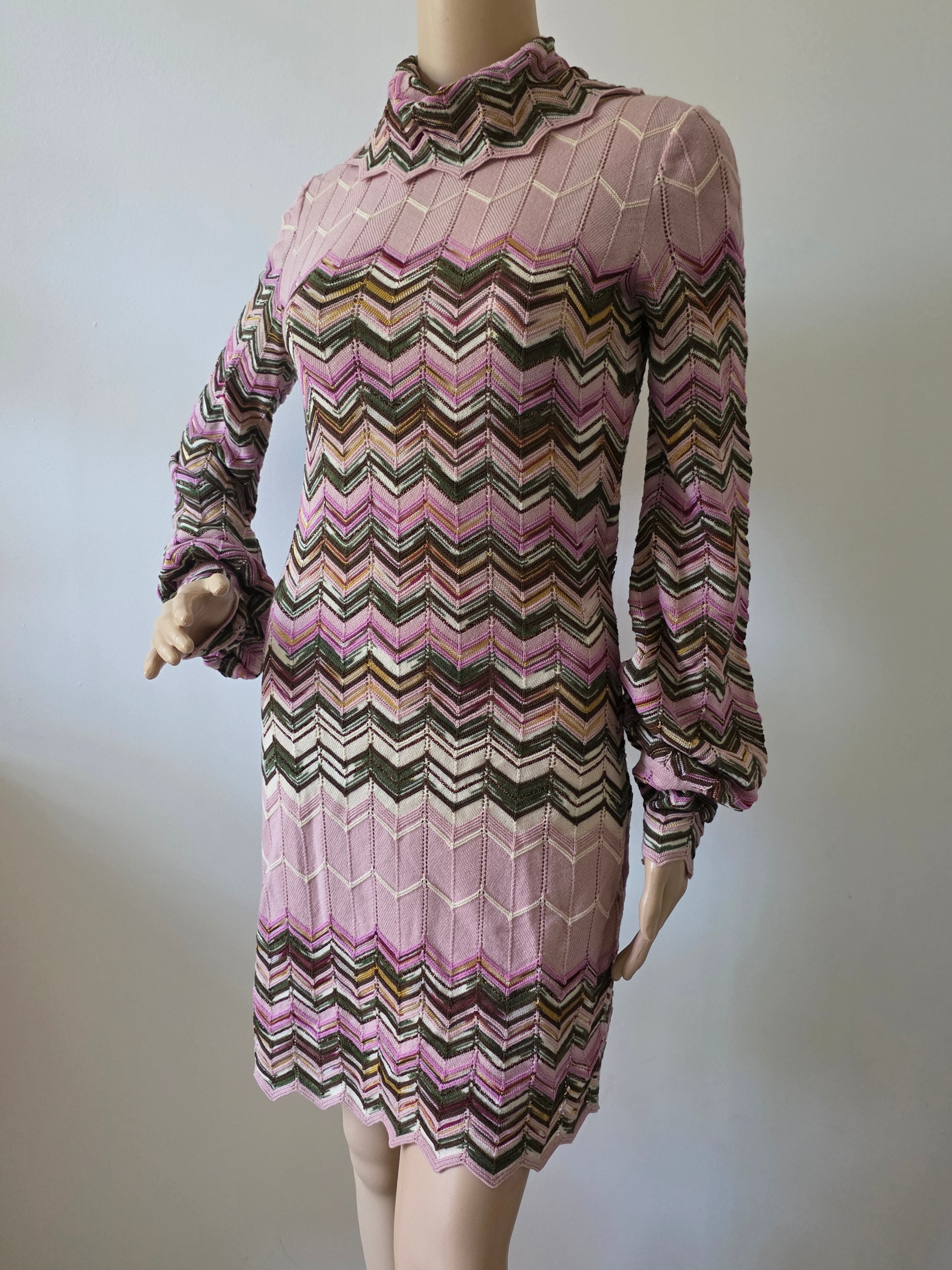 Expertly crafted from soft wool, this M Missoni shift dress features a unique blend of metallic and pink stripes, creating a statement look. The scalloped accent and turtleneck add a touch of elegance, while the button closure at the back ensures a secure fit. Available in size IT 44.